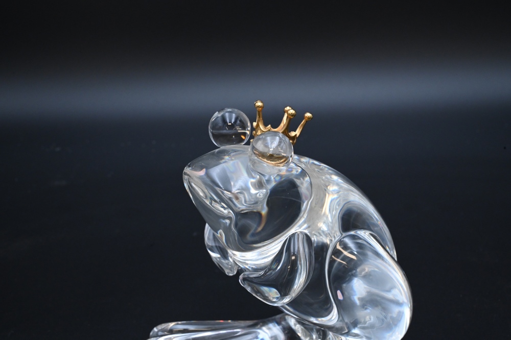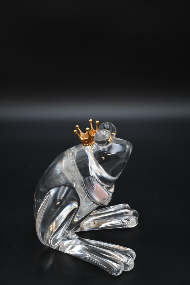 Steuben Glass, Frog Prince figure, having 18 karat gold crown, designed by Lloyd Atkins, 1973, signed Steuben on bottom, in fitted box, height 5 inches.