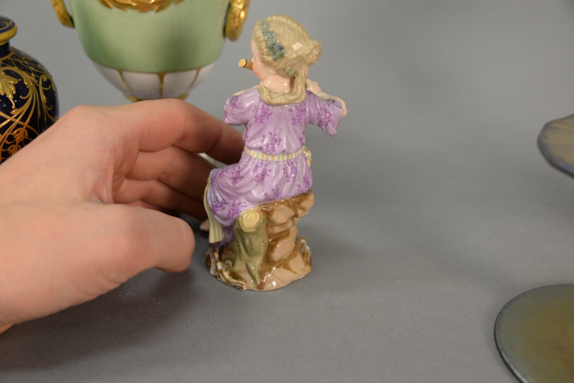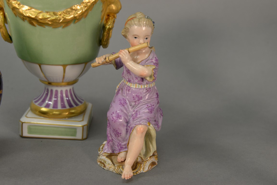 Three porcelain pieces including two KPM porcelain urns with covers one having gilt lion head handles and a Meissen porcelain figure of a young girl in a dress seated playing the flute, ht. 8 1/2in., ht. 5in., ht. 5in.