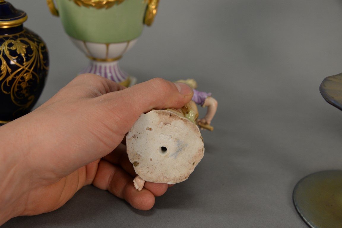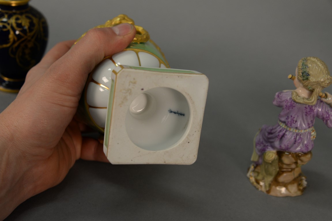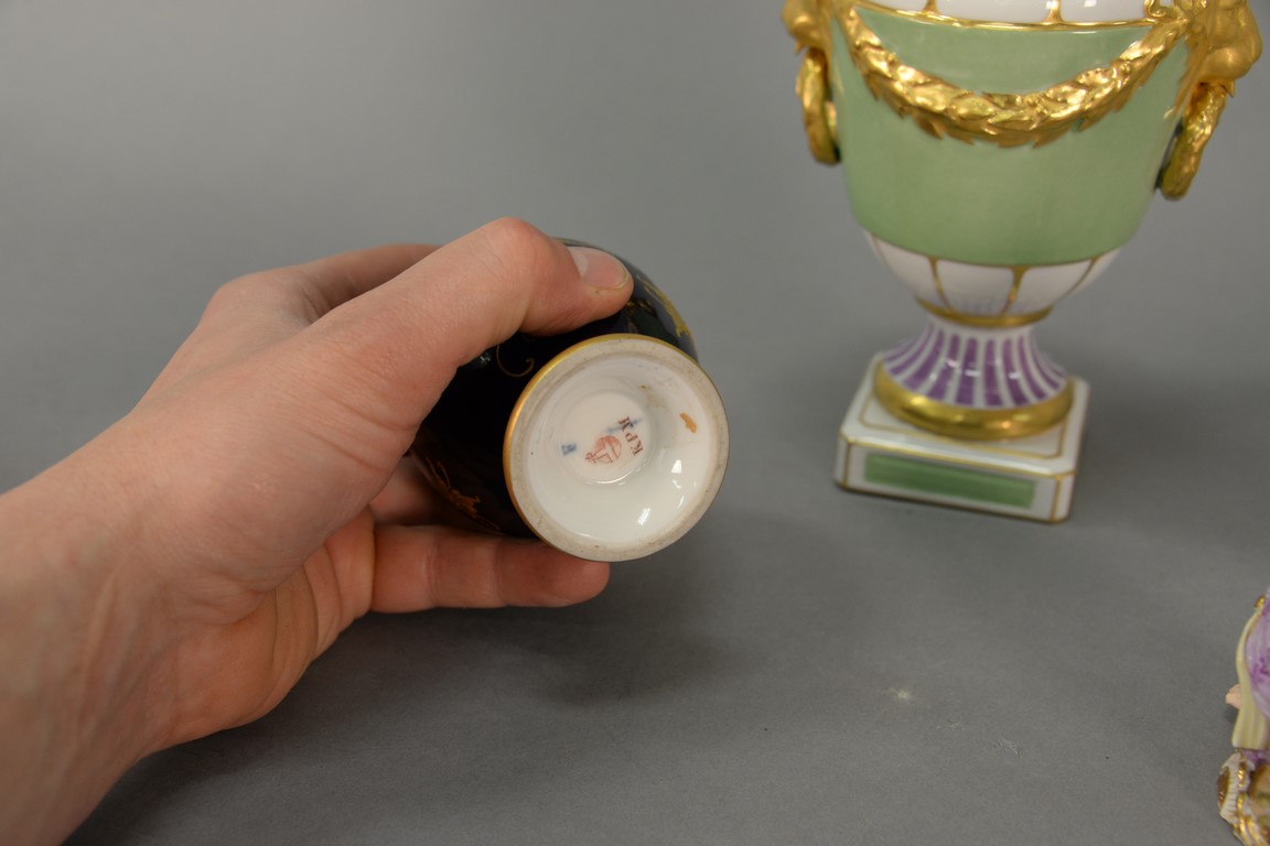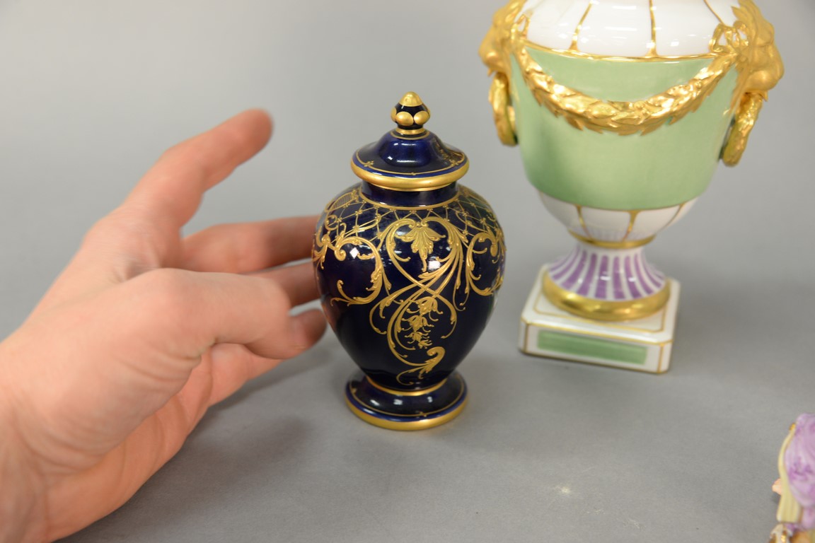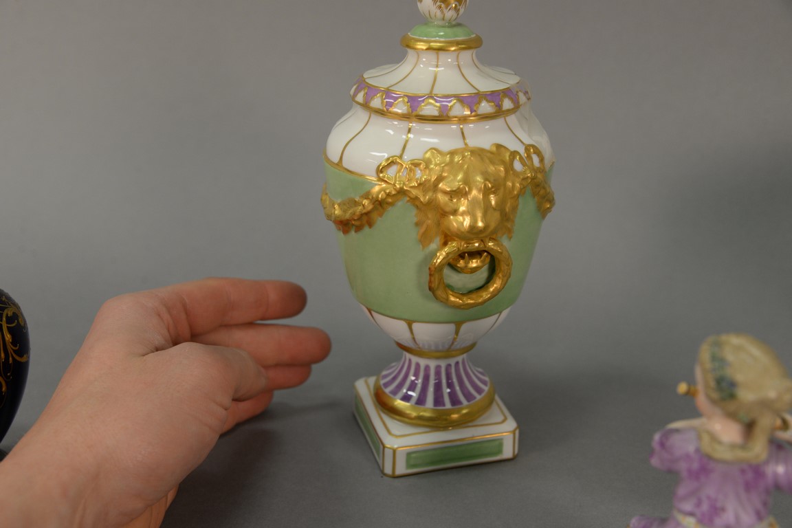 Lot 461: Three porcelain pieces including two KPM porcelain urns with covers one having gilt lion head handles and a Meissen porcelain figu…