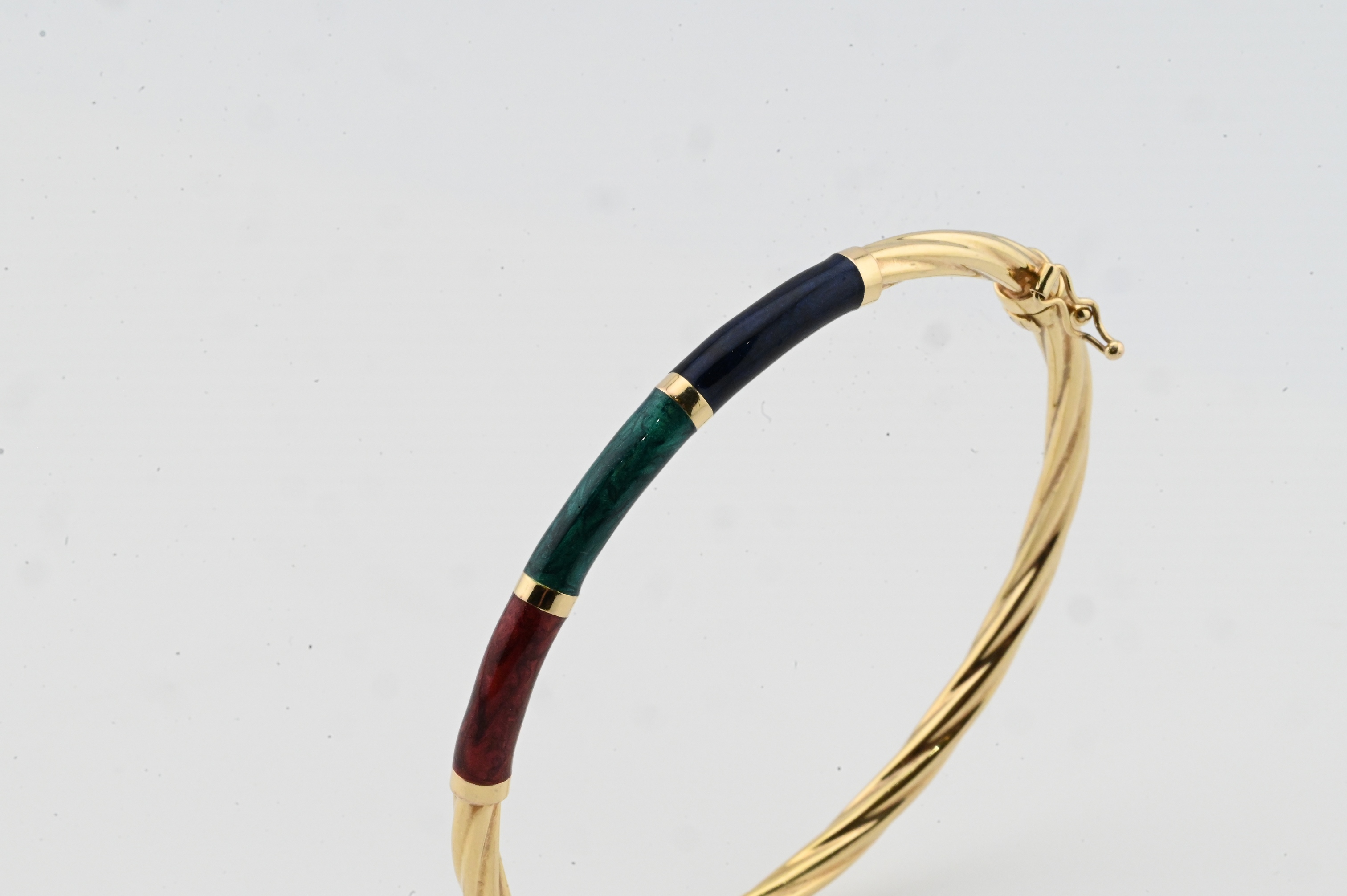 designed with twisted wire construction and accented with red, green, and blue enamel panels, stamped 14K and Unoaerre Italy