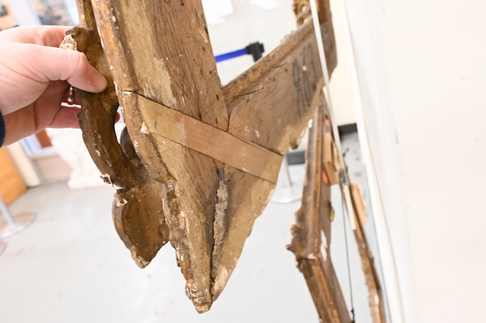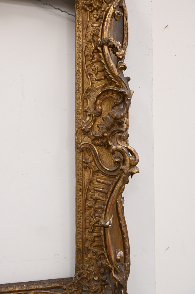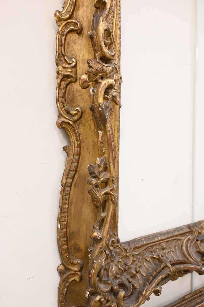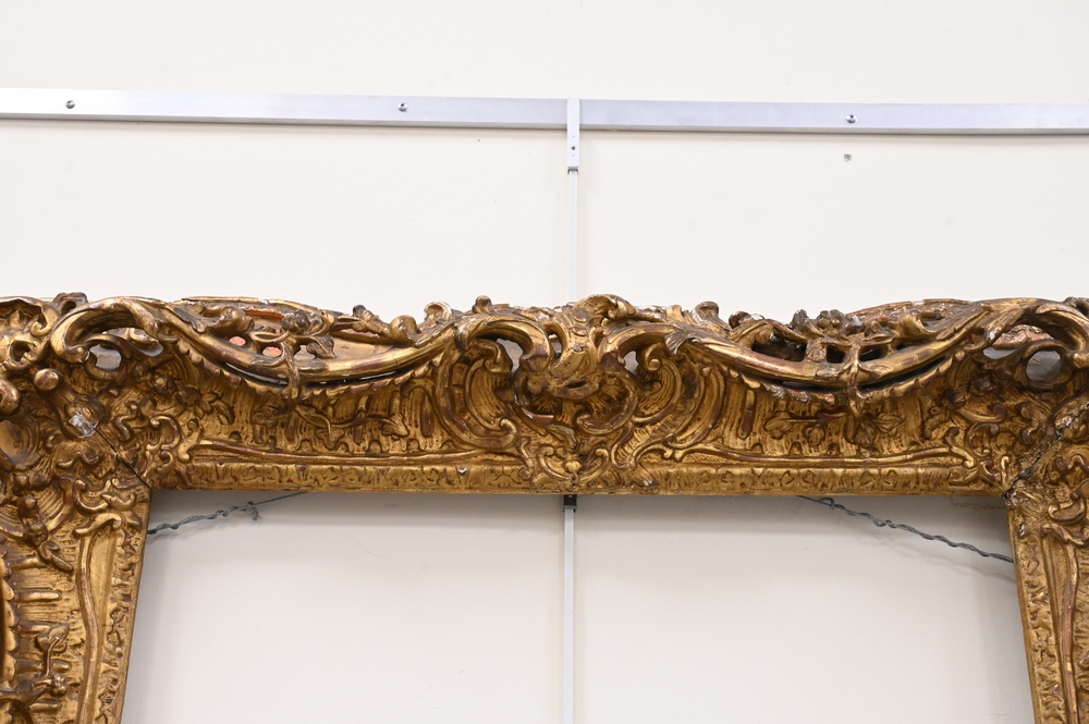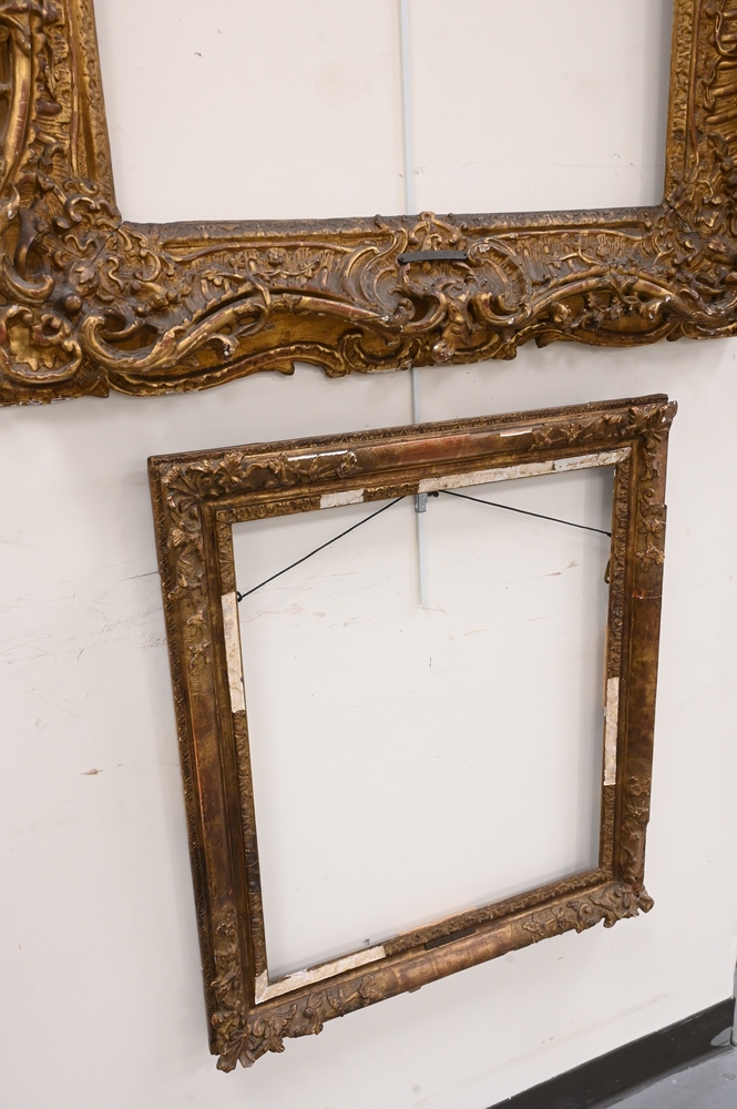 Lot 461A: Two Heavily Carved Gilt Frames, largest 18th century, smaller 19th century, largest outside 42″ x 36 1/2″, inside 32″ x 26 1/4″; smallest outside 28″ x 25″, inside 23 1/4″ x 19 3/4″.