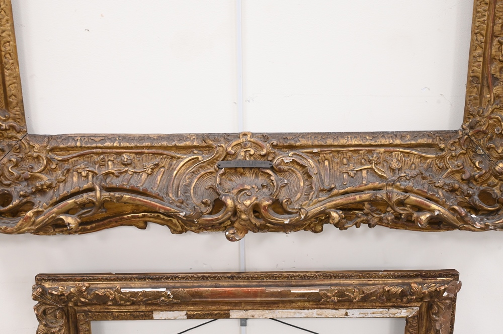 Two Heavily Carved Gilt Frames, largest 18th century, smaller 19th century, largest outside 42″ x 36 1/2″, inside 32″ x 26 1/4″; smallest outside 28″ x 25″, inside 23 1/4″ x 19 3/4″.