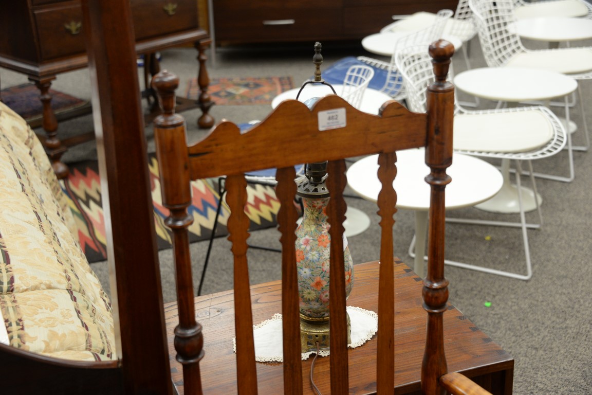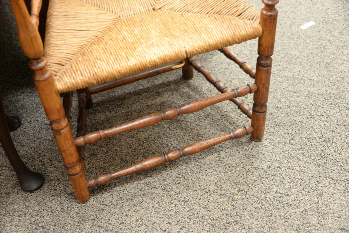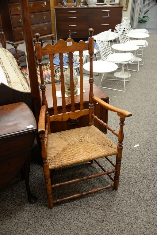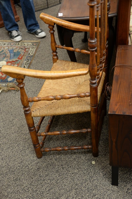 Lot 462: Banister back great chair with rush seat. ended out height 47 inches, seat height 16 inches