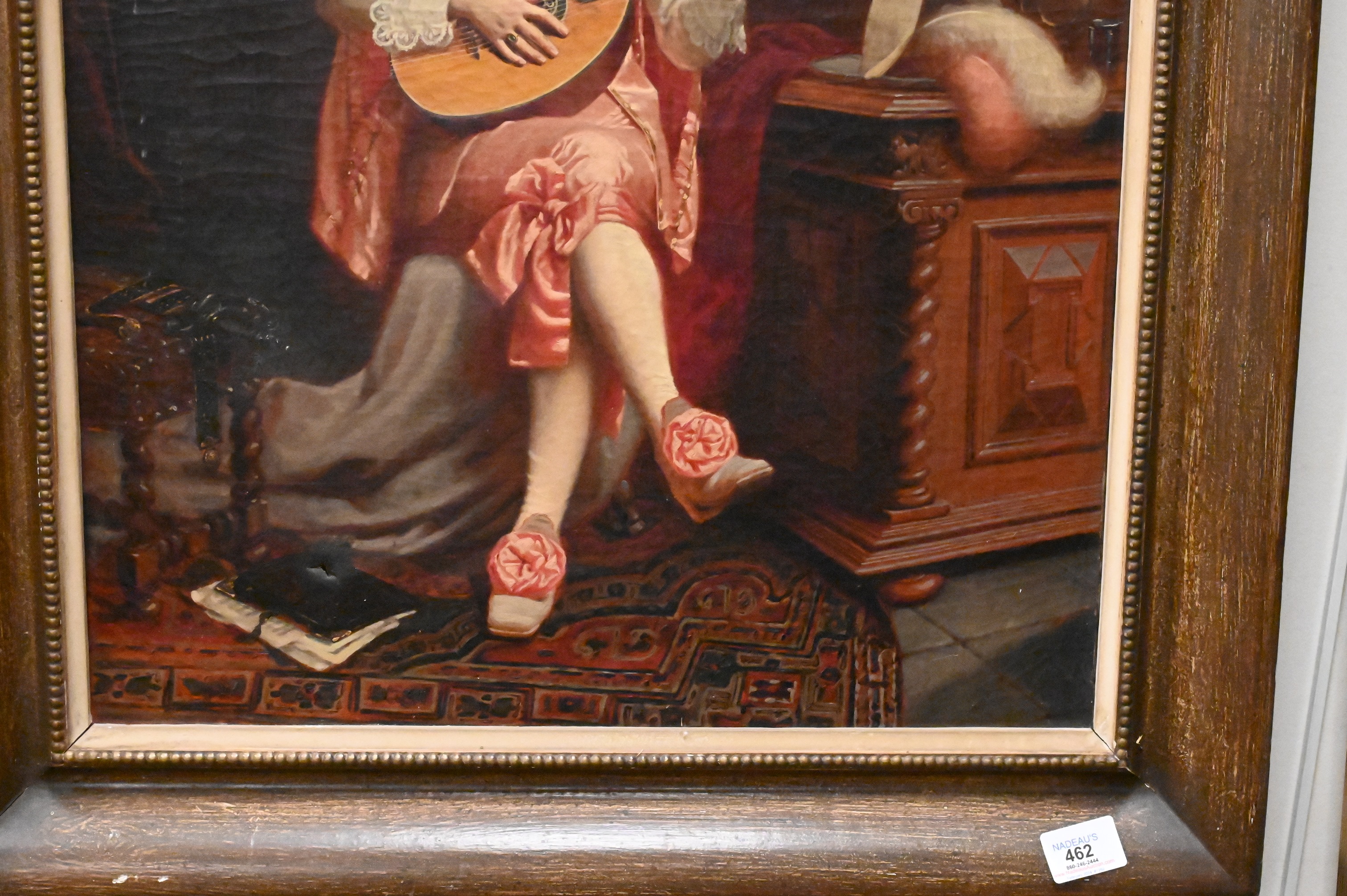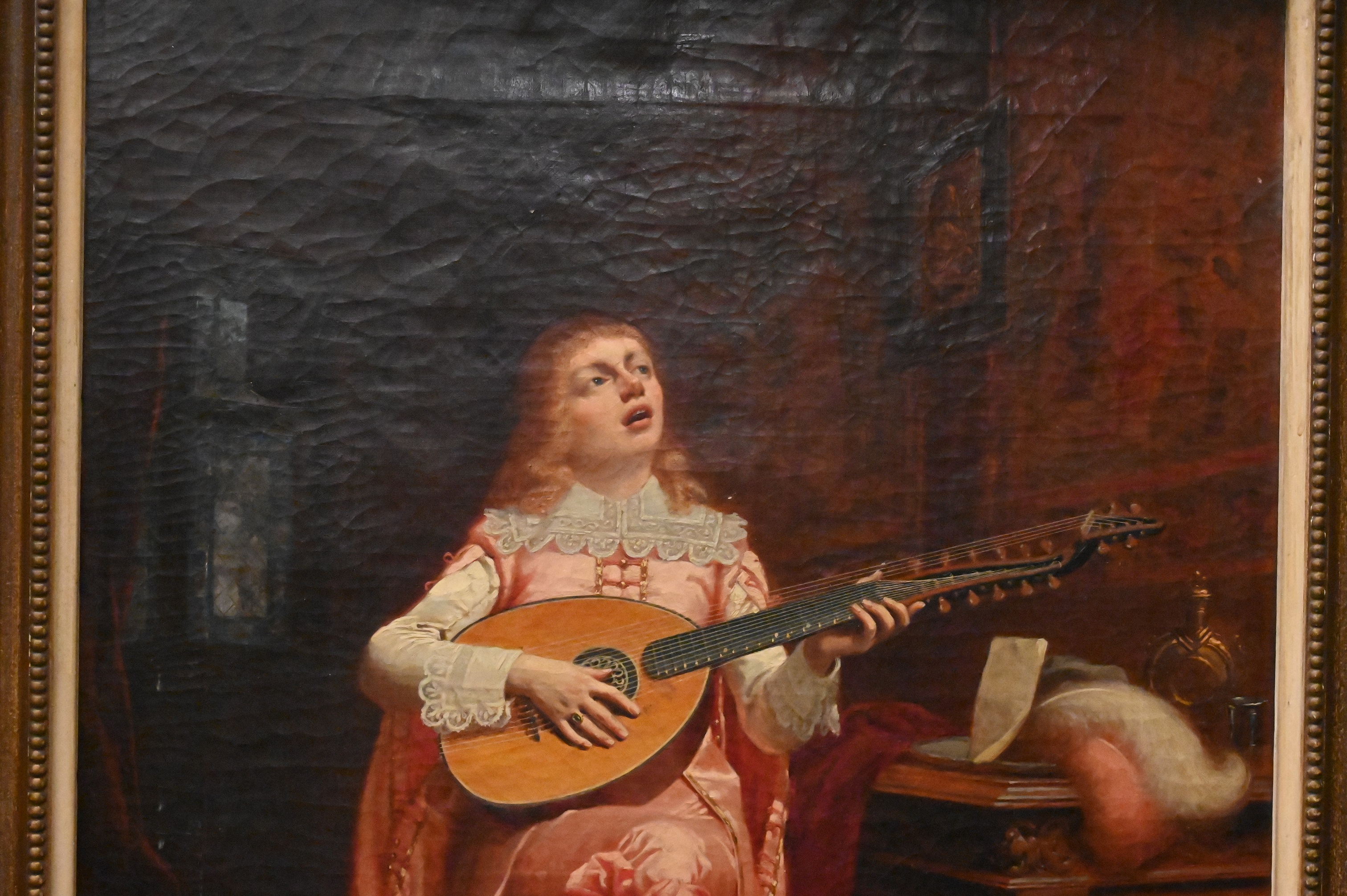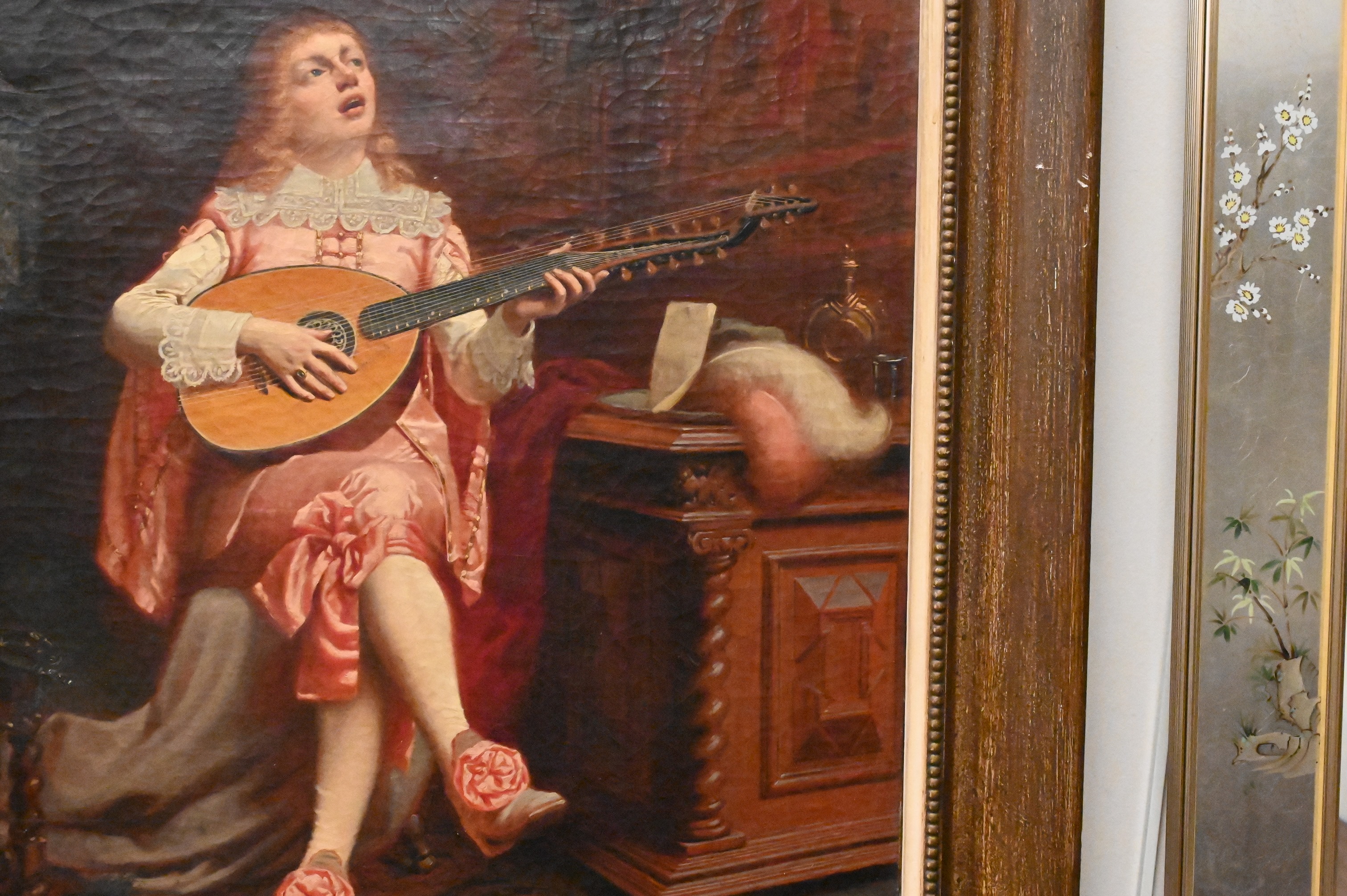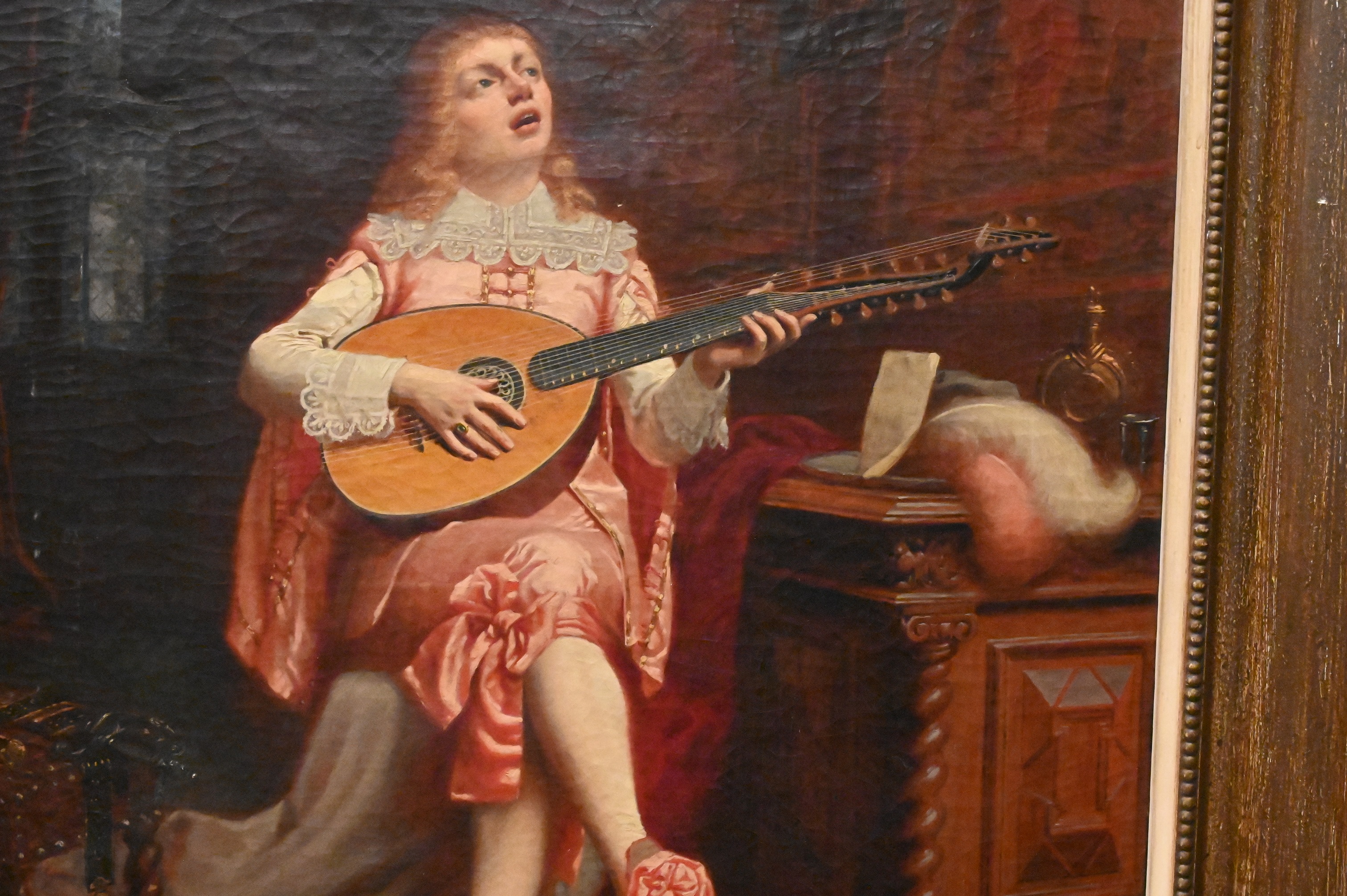 Lute player dressed in pink silk attire, sitting in a parlor, 18th century or later