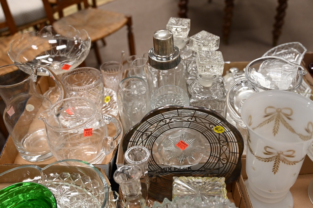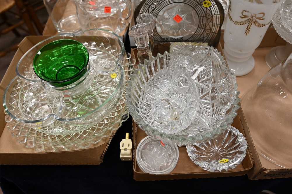Lot 462: Eight Tray Lots of Glass, to include a cut glass bowl, a Steuben bowl (chipped), an antique etched compote, three decanters, a pressed glass charger, several rock glasses, along with many other pieces, etc., decanter height 9 1/2 inches.