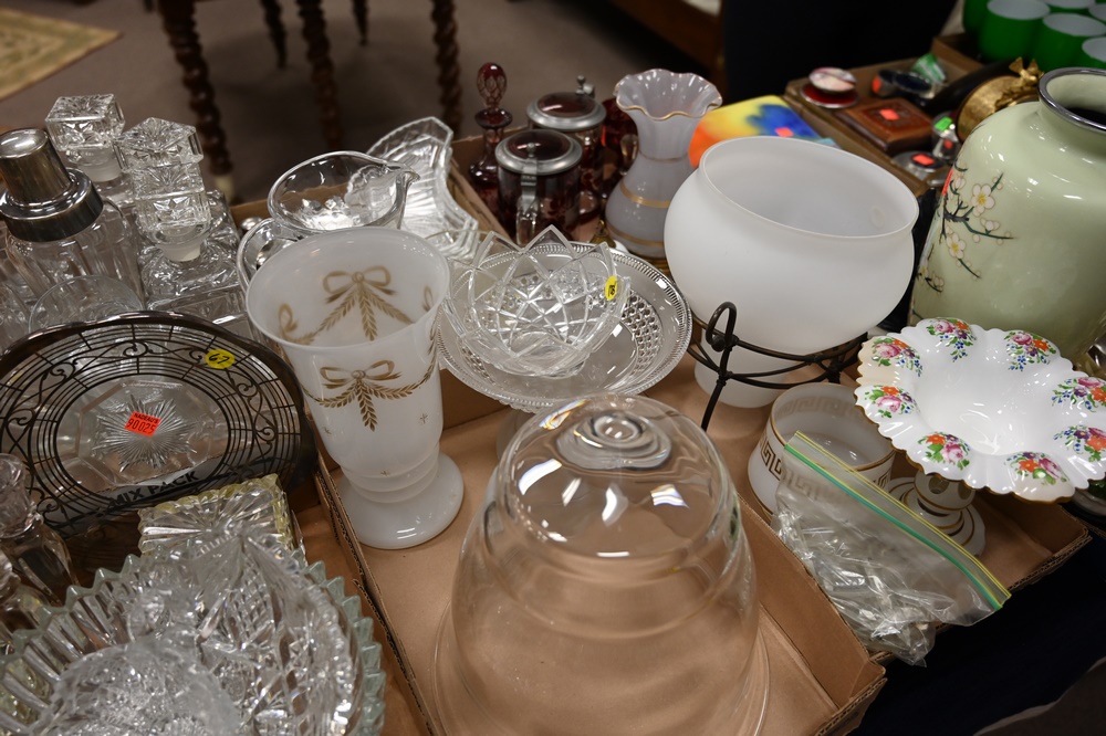 Eight Tray Lots of Glass, to include a cut glass bowl, a Steuben bowl (chipped), an antique etched compote, three decanters, a press…