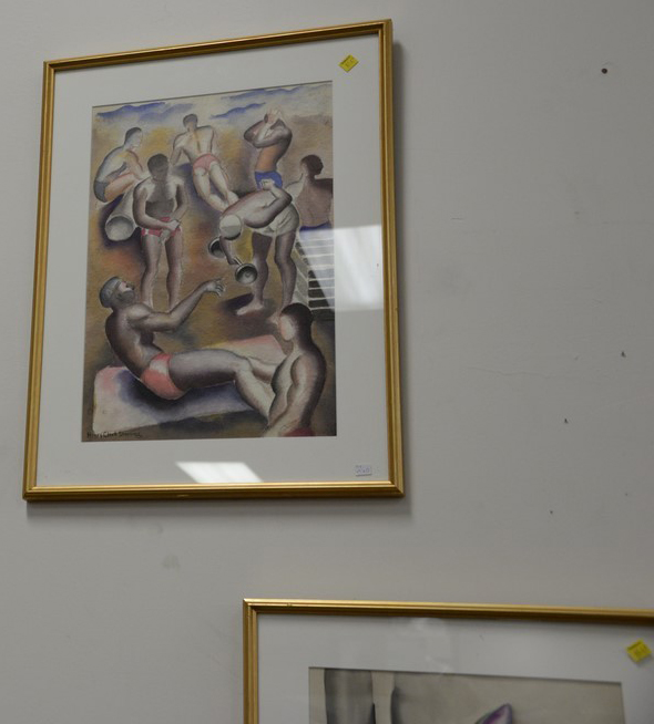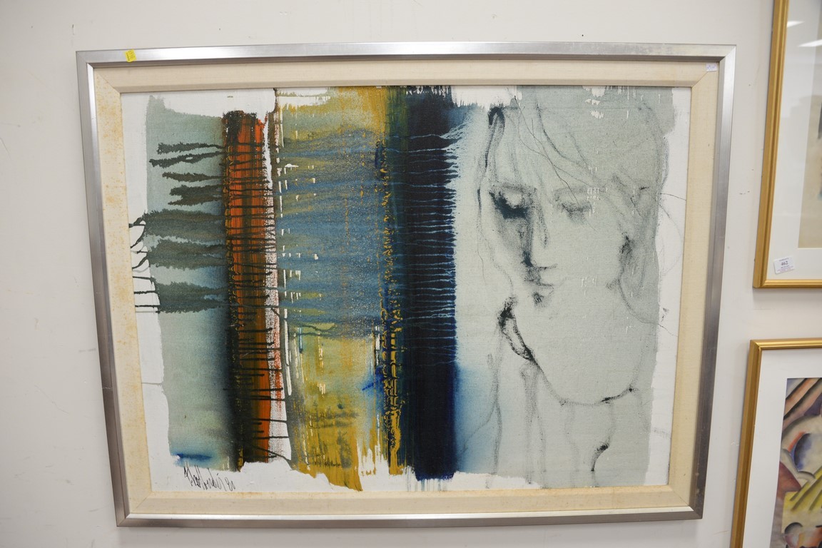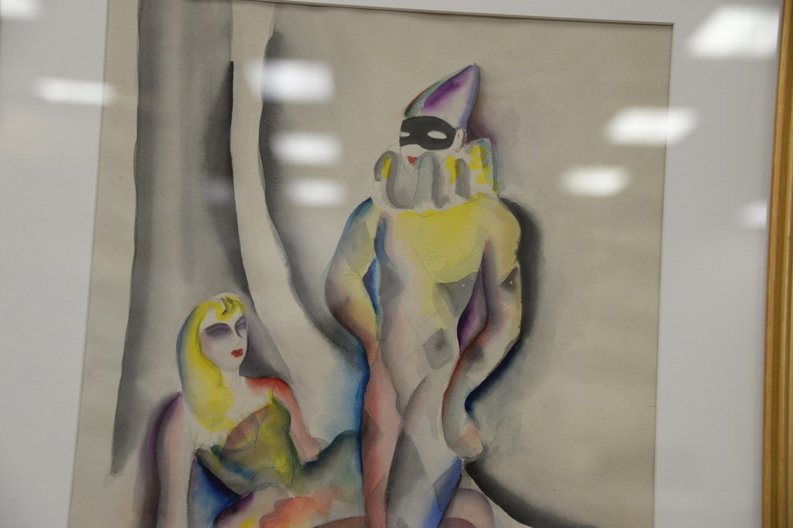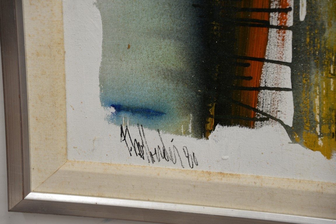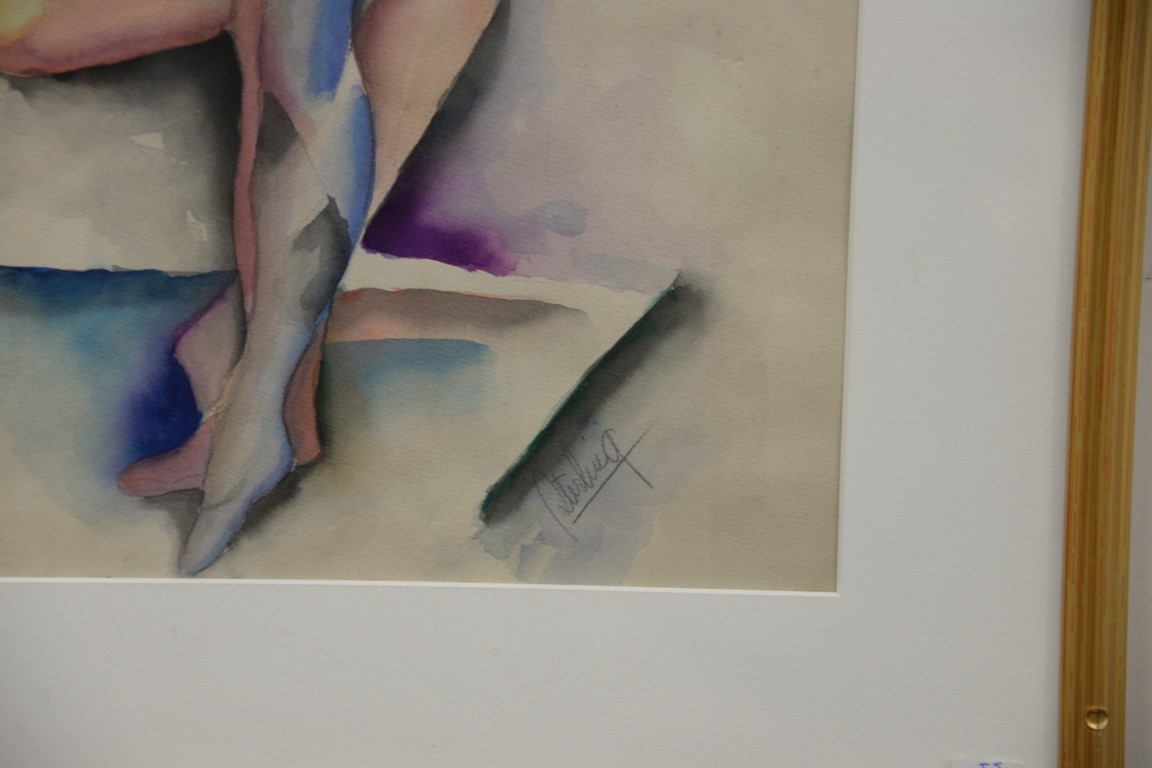 Lot 462: Four framed pieces to include an oil on canvas abstract signed illegibly, and three watercolors signed Harry Clark Sterling. 19 x 1…