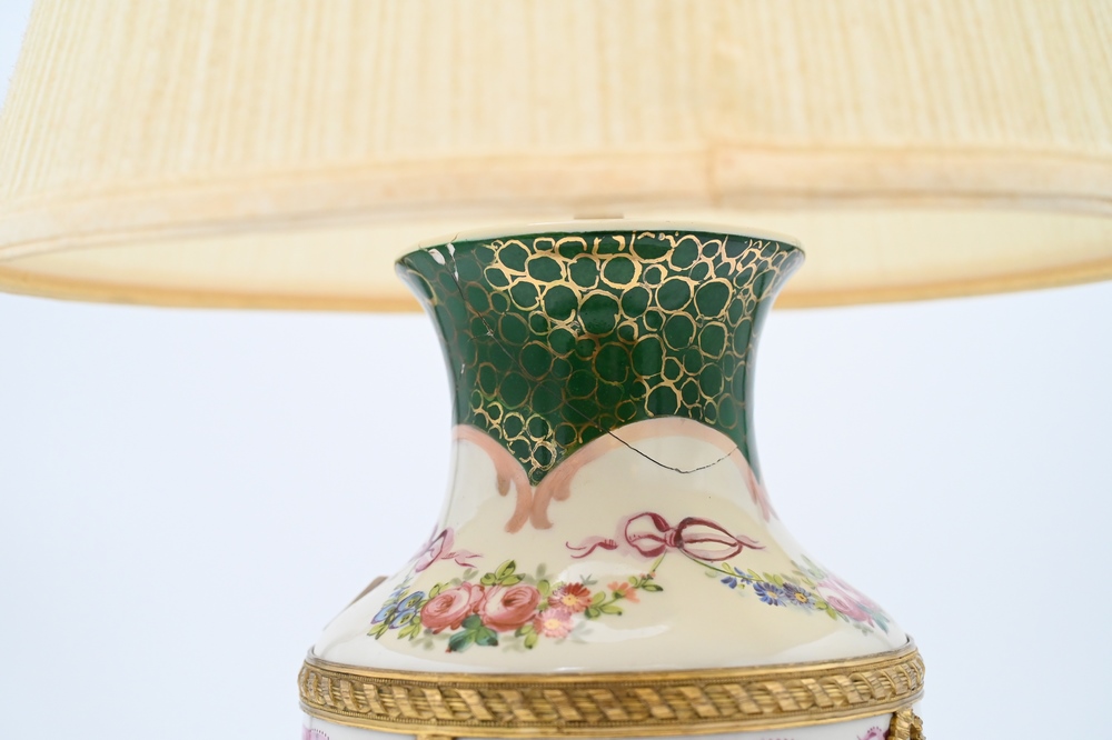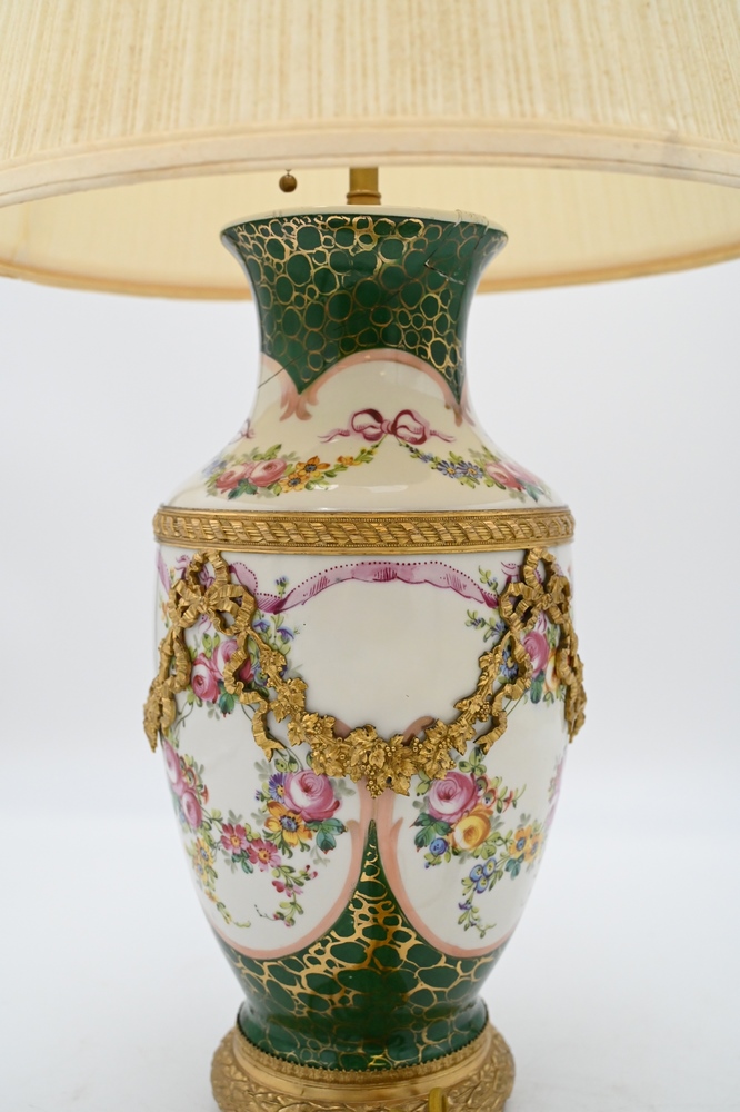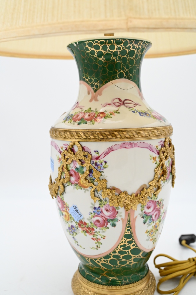 Lot 462: French Porcelain Vase, having painted flowers, mounted with gilt bronze swag on bronze base, made into a table lamp, poorly repaired top, height of vase 15 1/4 inches, total height 27 inches.