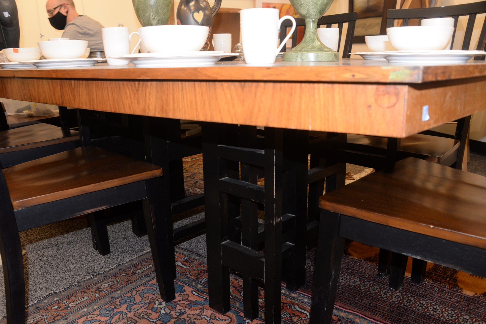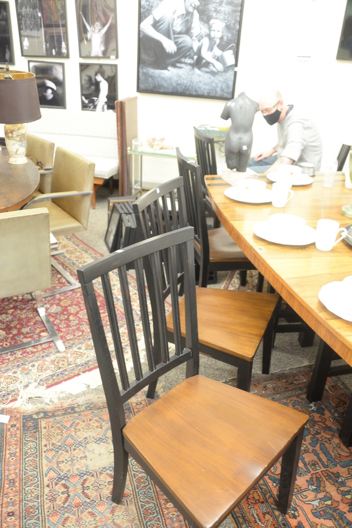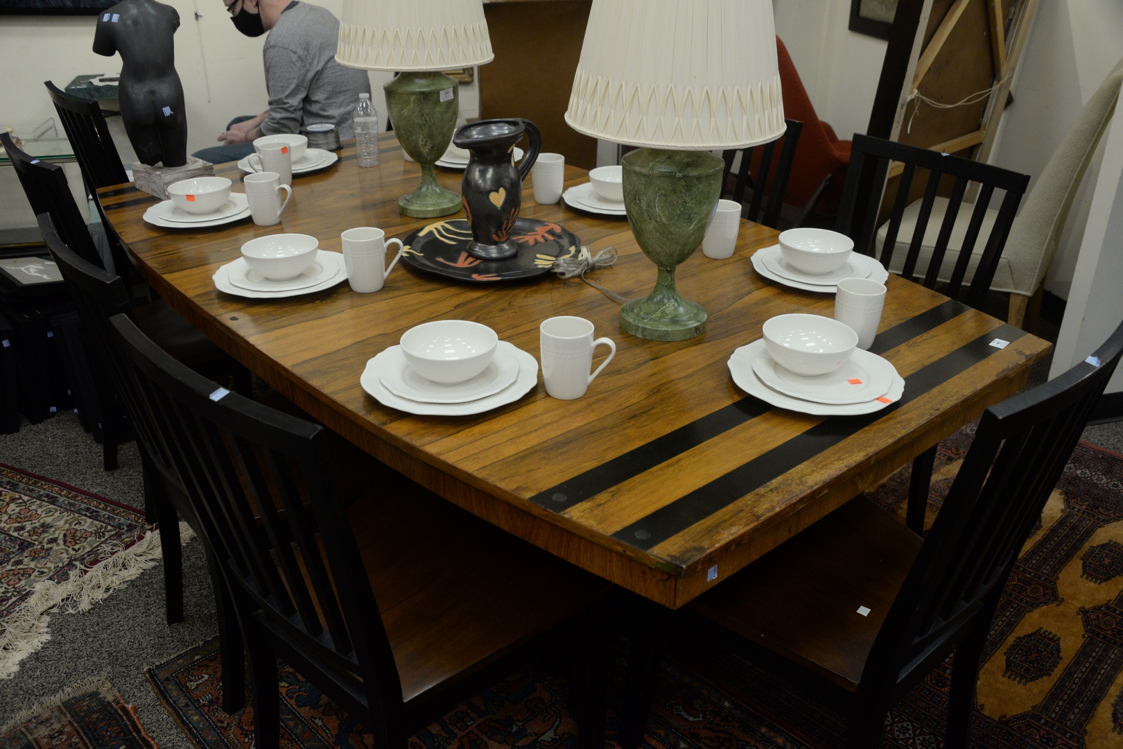 Lot 462: Nine Piece Custom Rosewood Veneered Boat Table, tailed Mid-Century, along with 8 chairs, along with 18 inch leaves, height 29 inches, top 48″ x 84″, top open 48″ x 120″.