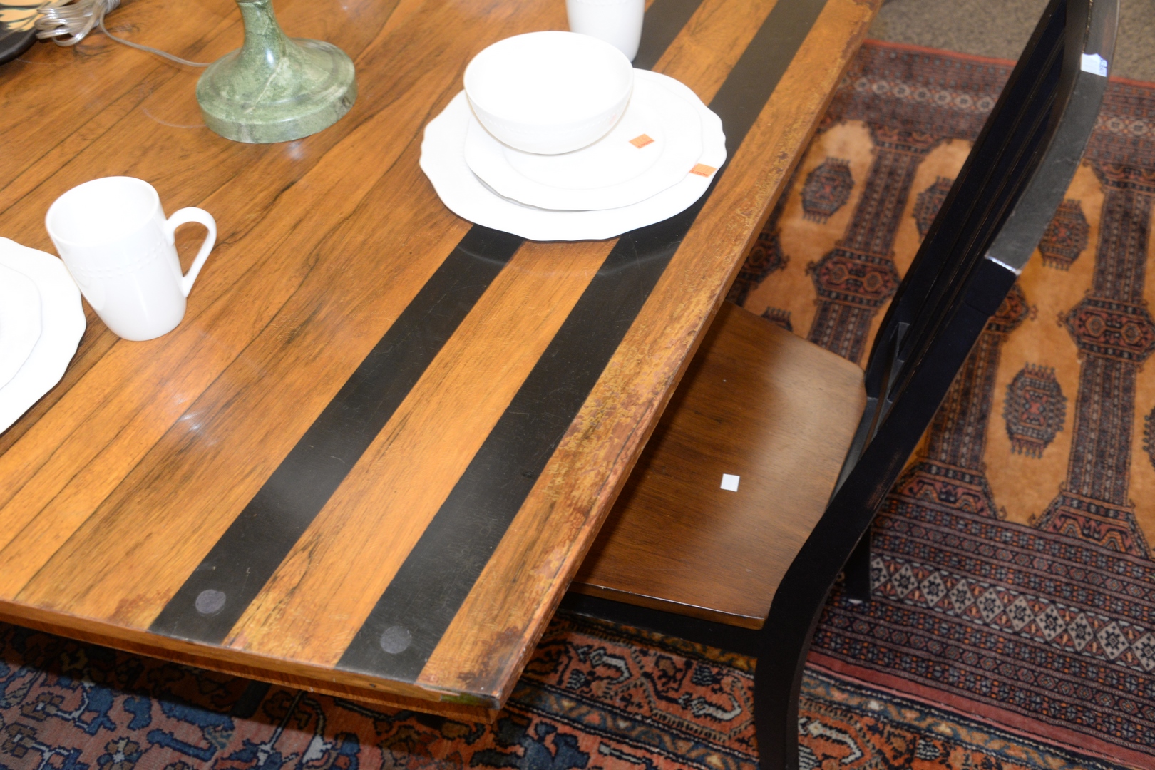 Nine Piece Custom Rosewood Veneered Boat Table, tailed Mid-Century, along with 8 chairs, along with 18 inch leaves, height 29 inches, top 48″ x 84″, top open 48″ x 120″.