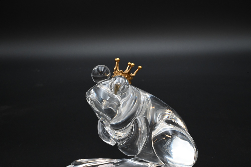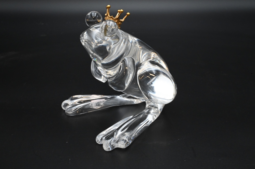Lot 462: Steuben Glass, Frog Prince figure, having 18 karat gold crown, designed by Lloyd Atkins, 1973, signed Steuben on bottom, height 5 in…