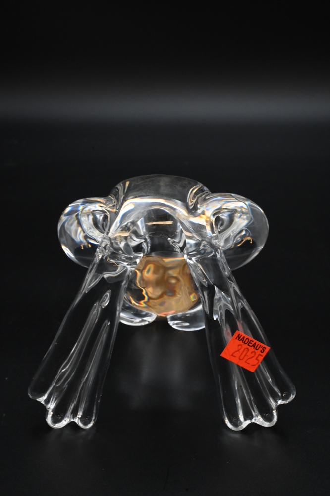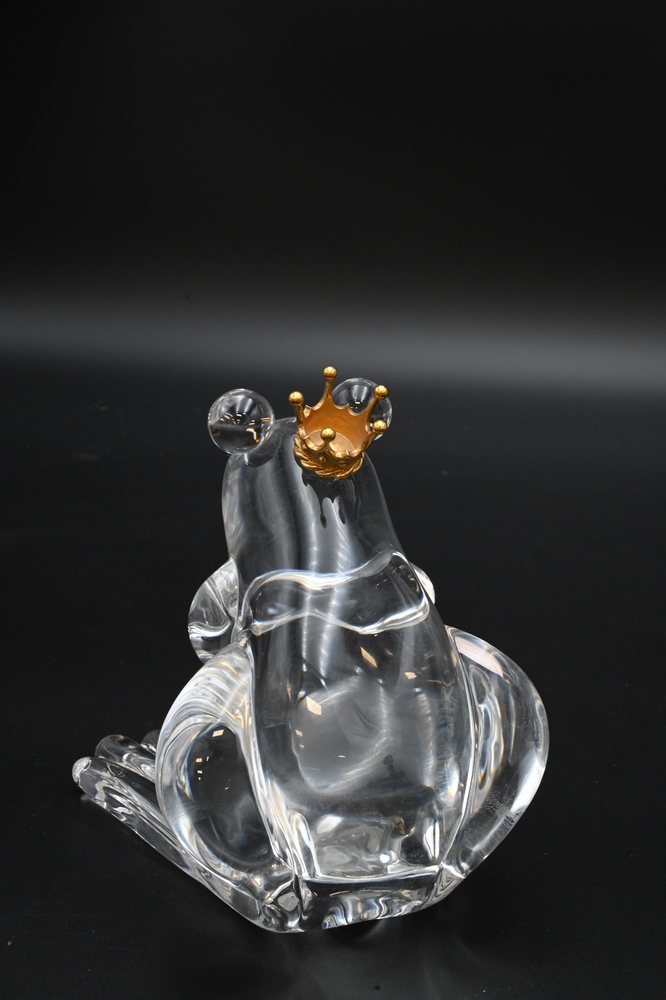 Steuben Glass, Frog Prince figure, having 18 karat gold crown, designed by Lloyd Atkins, 1973, signed Steuben on bottom, height 5 inches. Provenance: Waterfront Estate, Stamford, Connecticut.