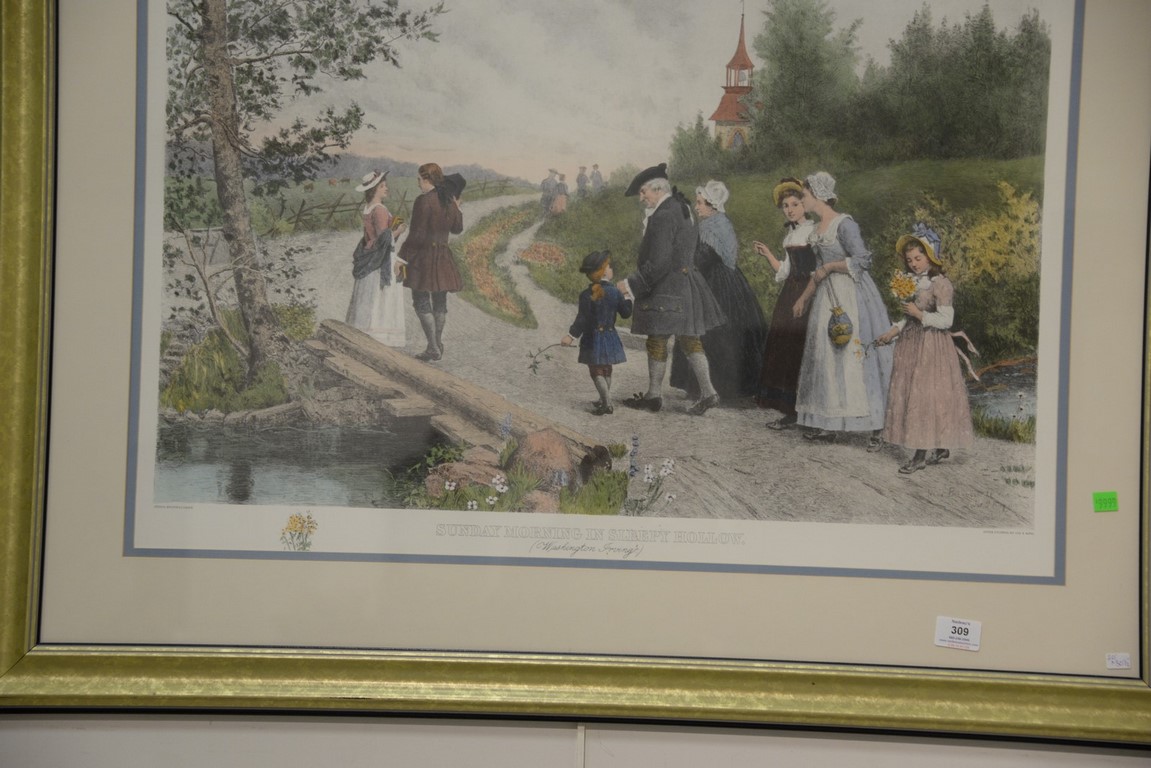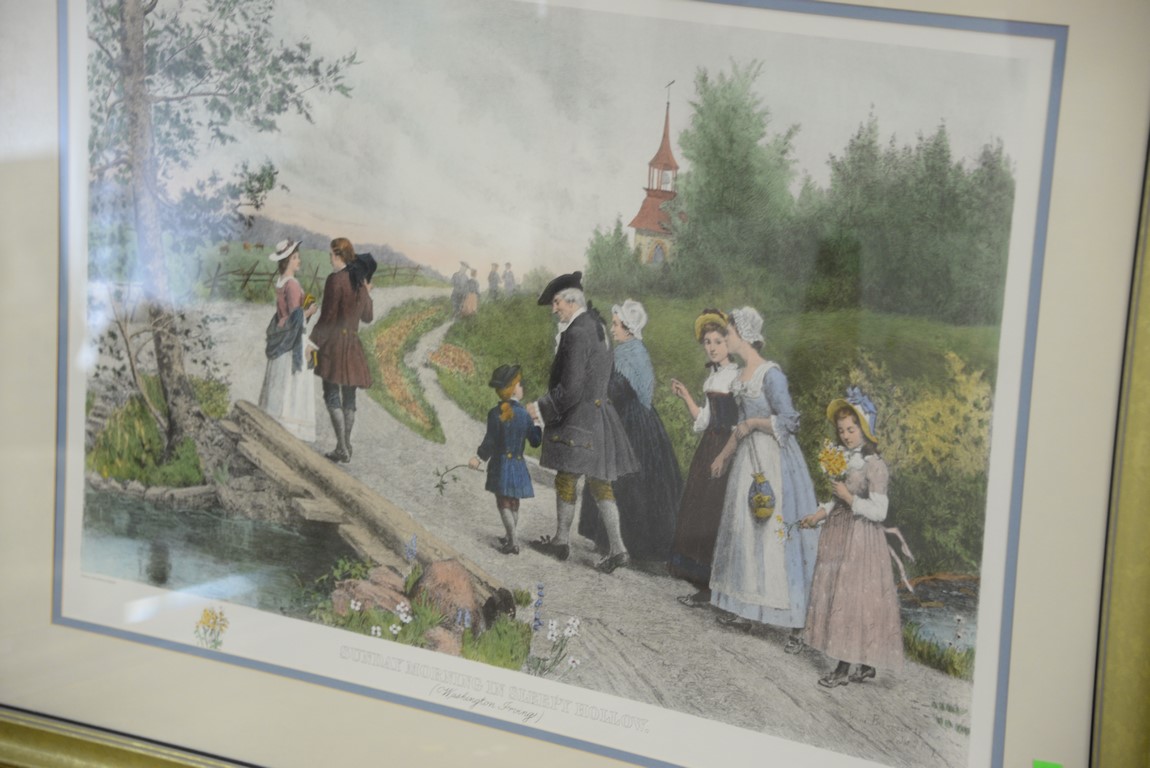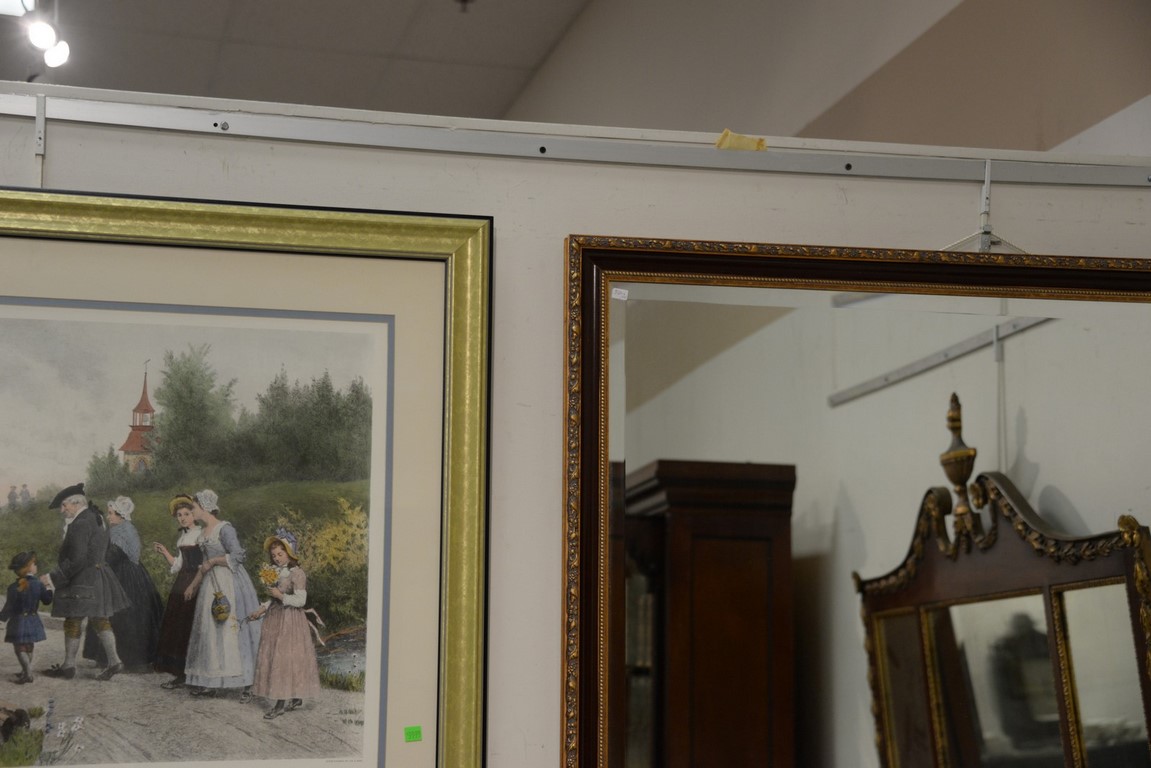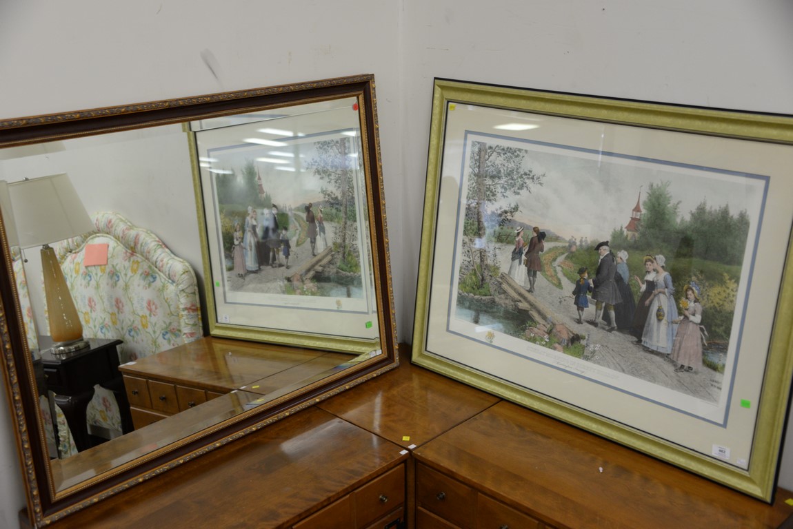 Lot 462: Two framed pieces including large print Sunday Morning in Sleepy Hollow and large framed mirror.print: 20 x 30 mirror: 34 x…