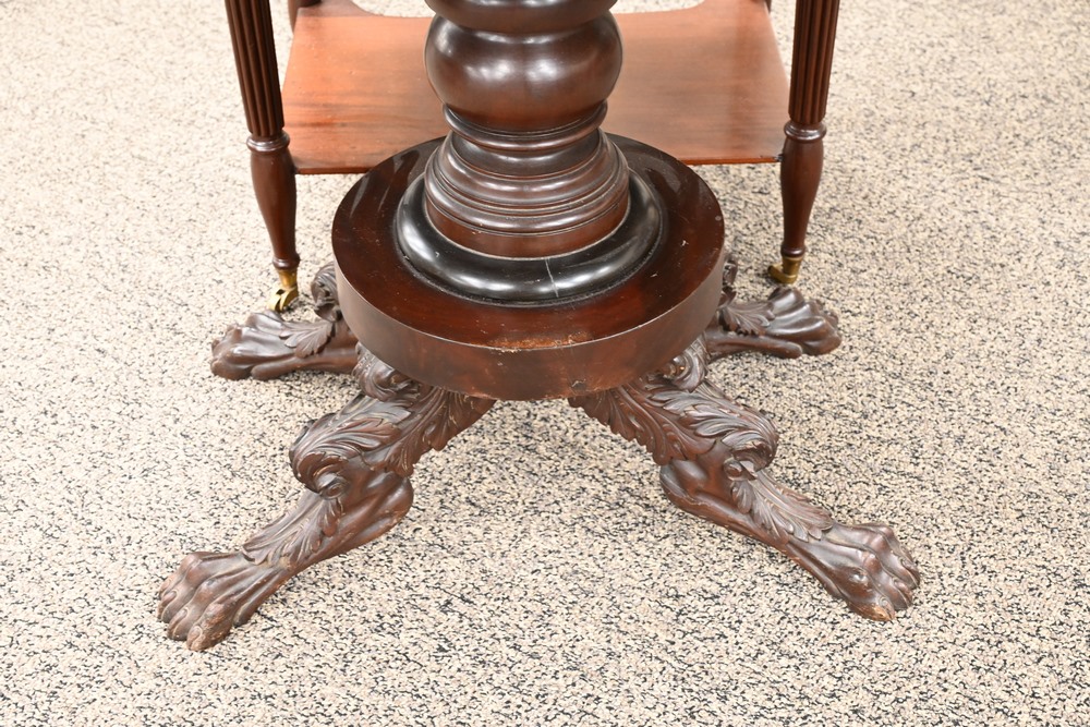 having banded inlaid top on conforming skirt with satin panel inlay on turned pedestal set on carved paw feet