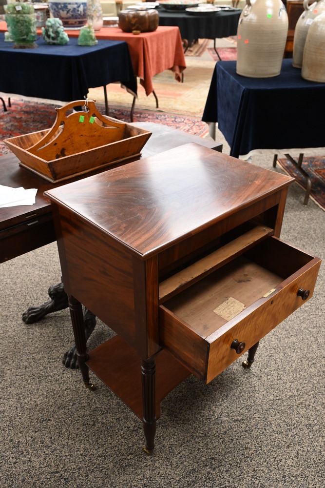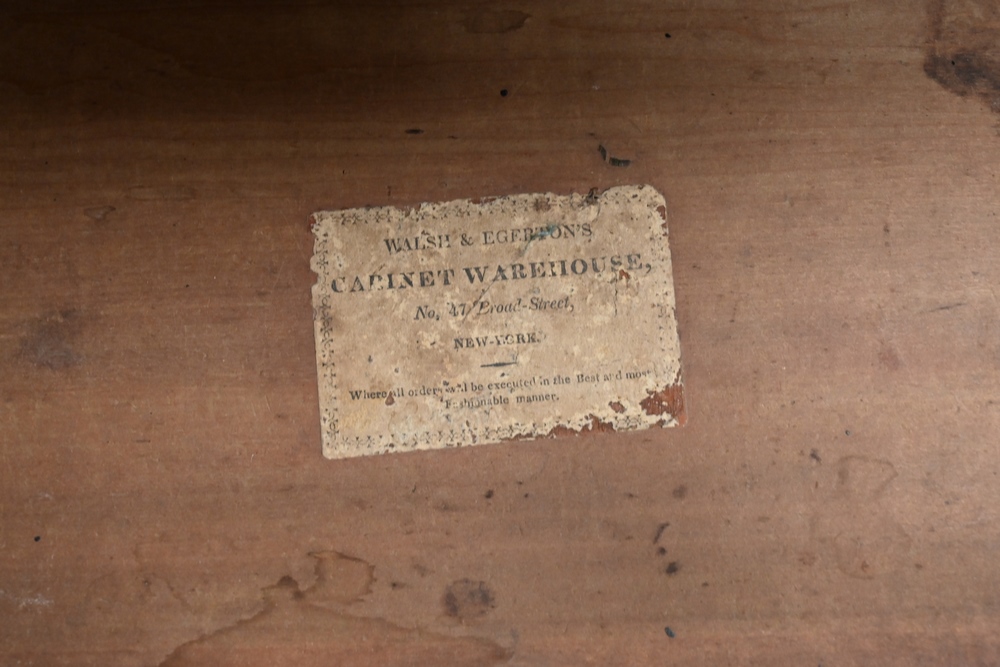 with tilting desk bottom drawer with label “Walsh and Egerton Cabinet Warehouse No 47 Broad St, New York, where all orders will be executed in the best and most fashionable manner”