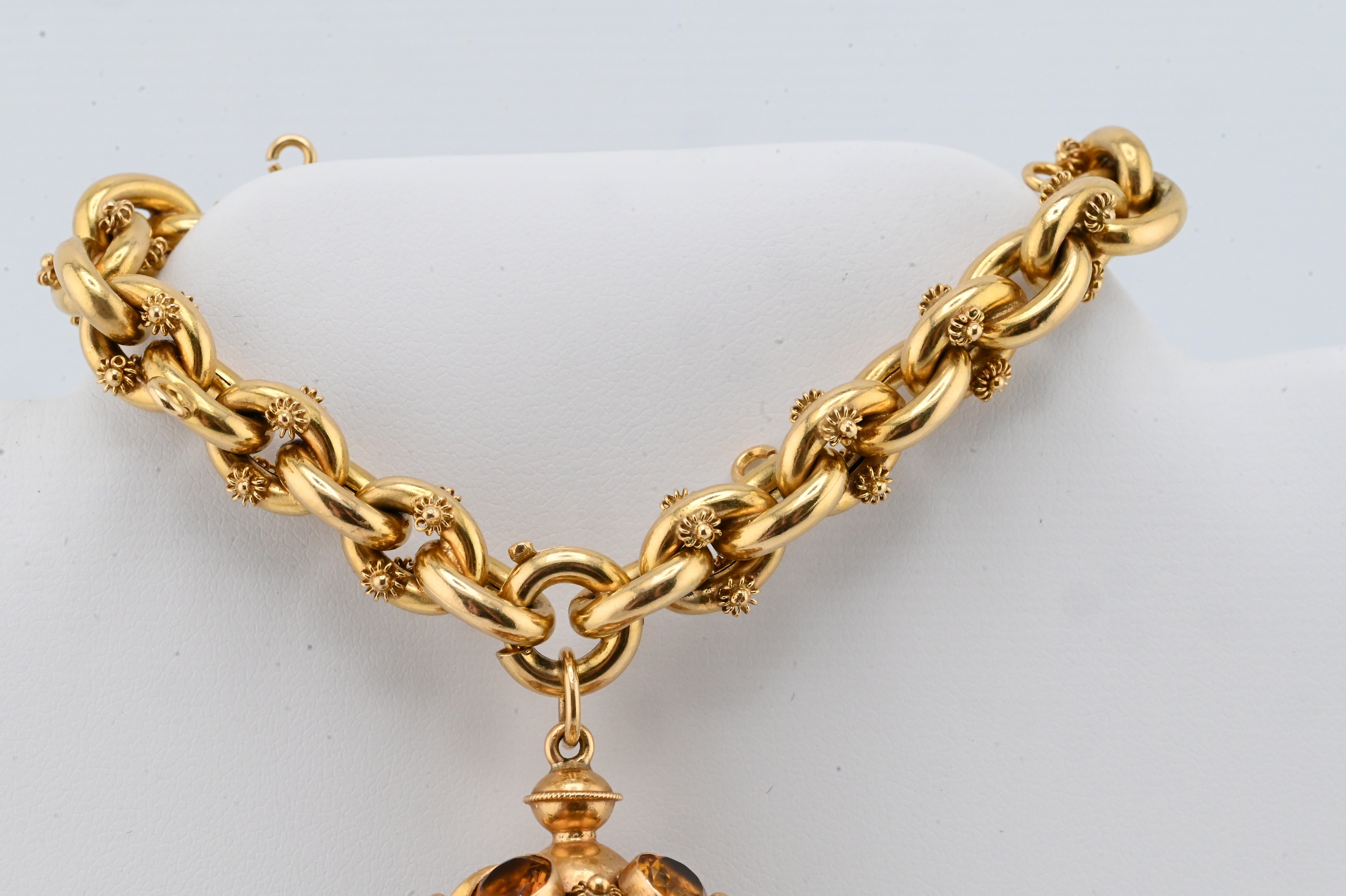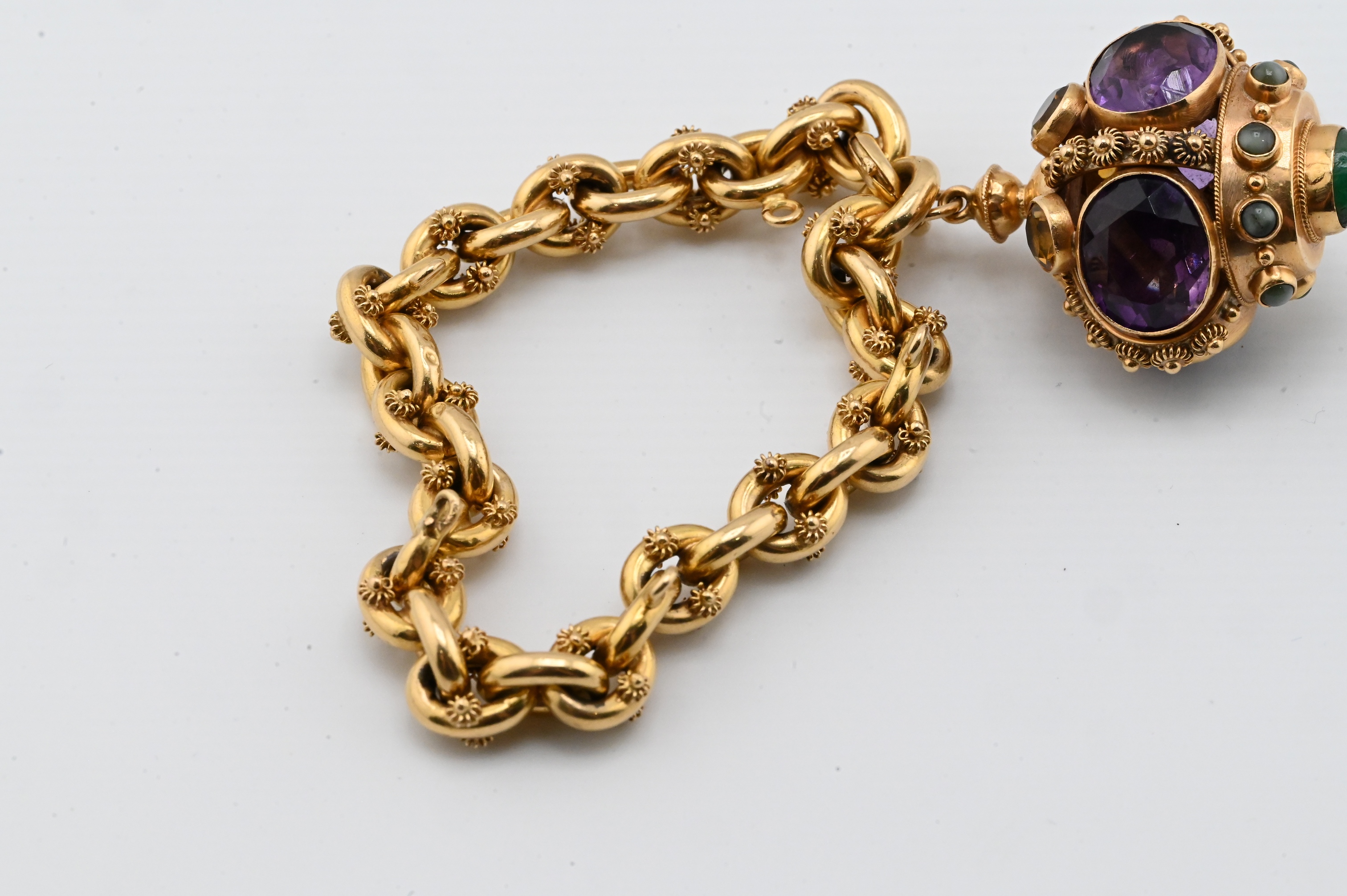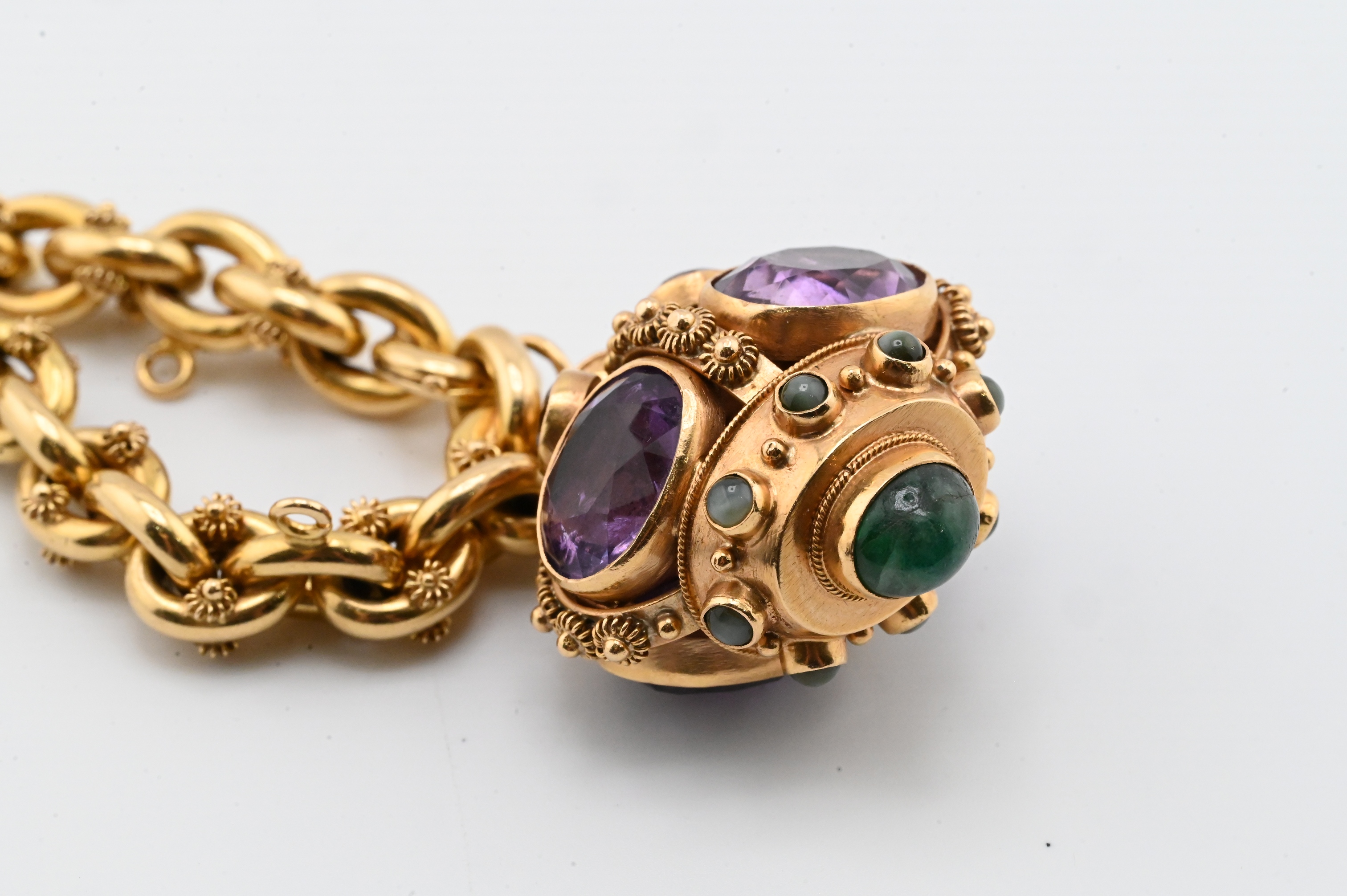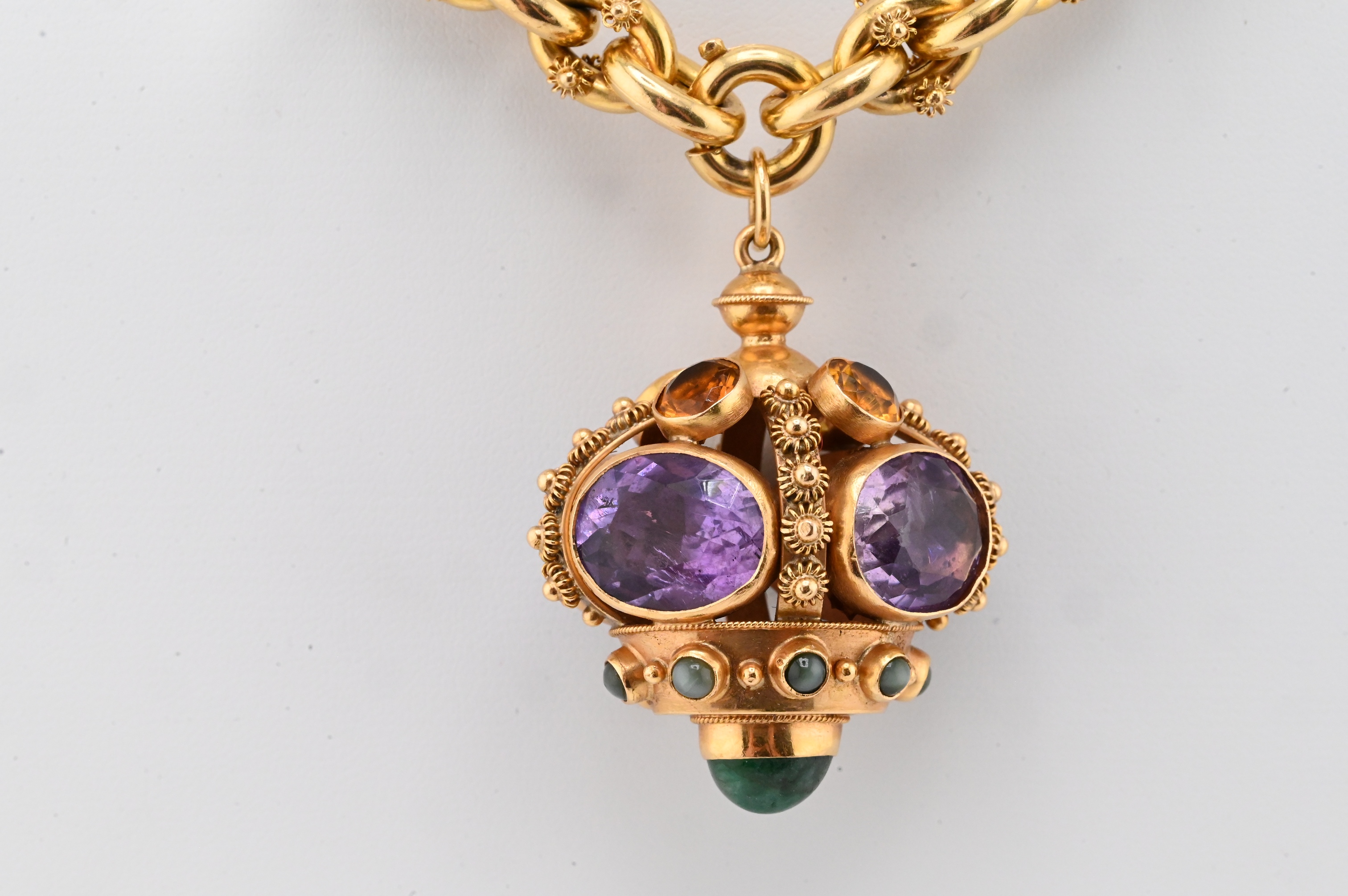 comprising an 8¼-inch length chain of bold interlocking links decorated with applied granulated clusters, suspending a crown-form pendant set with four oval amethysts, a domed green cabochon terminal, and additional green and golden gemstones throughout, with fine granulated goldwork accents