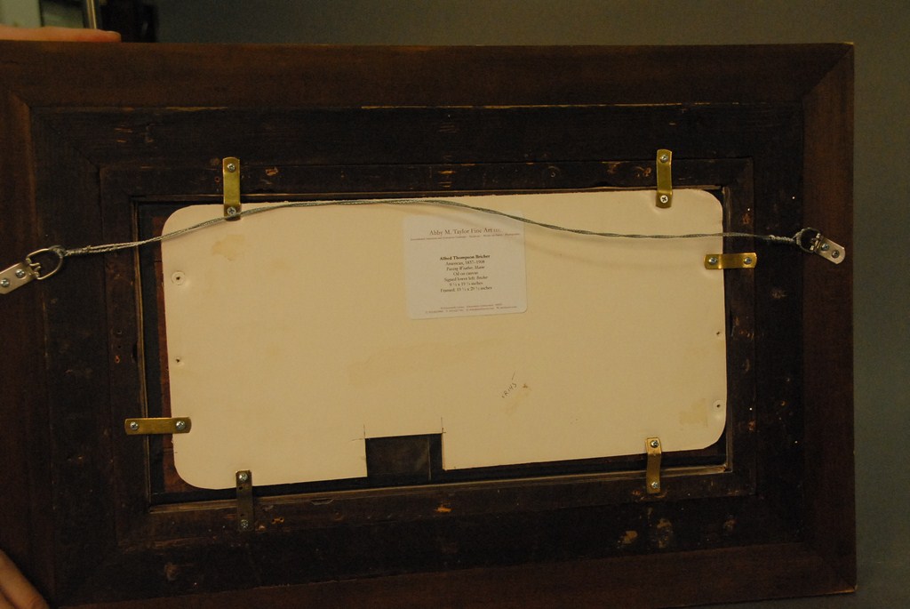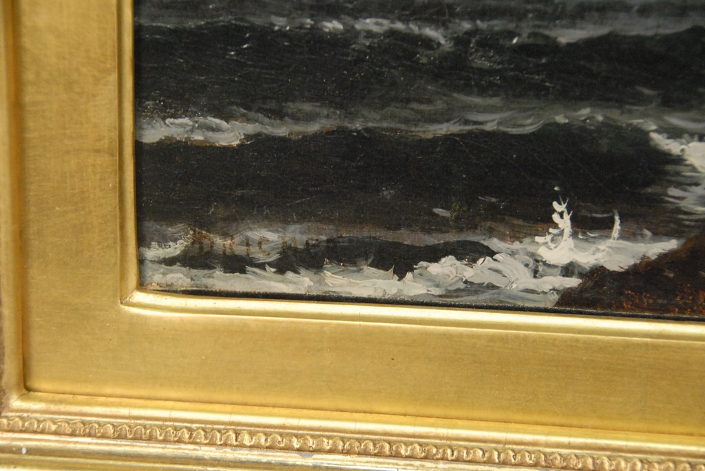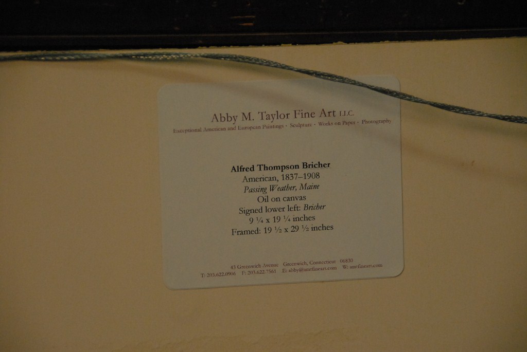 Alfred Thompson Bricher 1837-1908 PASSING WEATHER, MAINE oil on canvas signed lower left A. T.Bricher Abby M. Taylor Fine Art lable on back, old paper label on frame, restretched and relined. 9 1/4 x 19 1/4