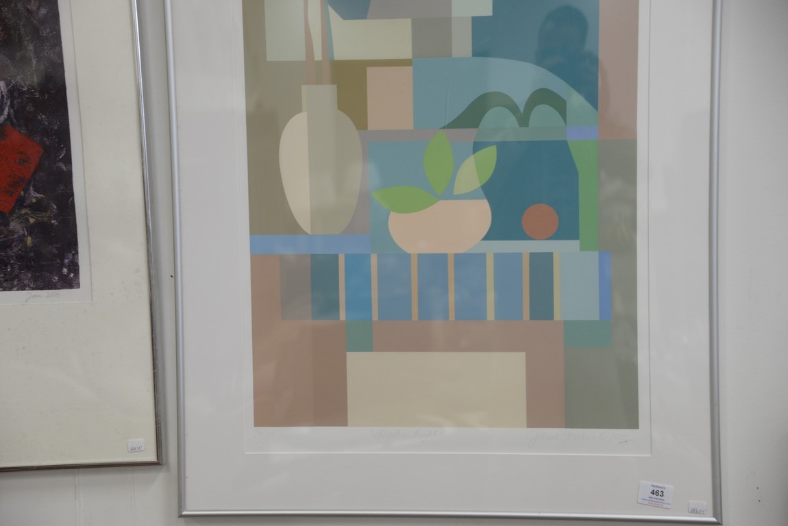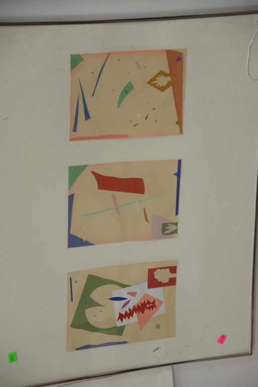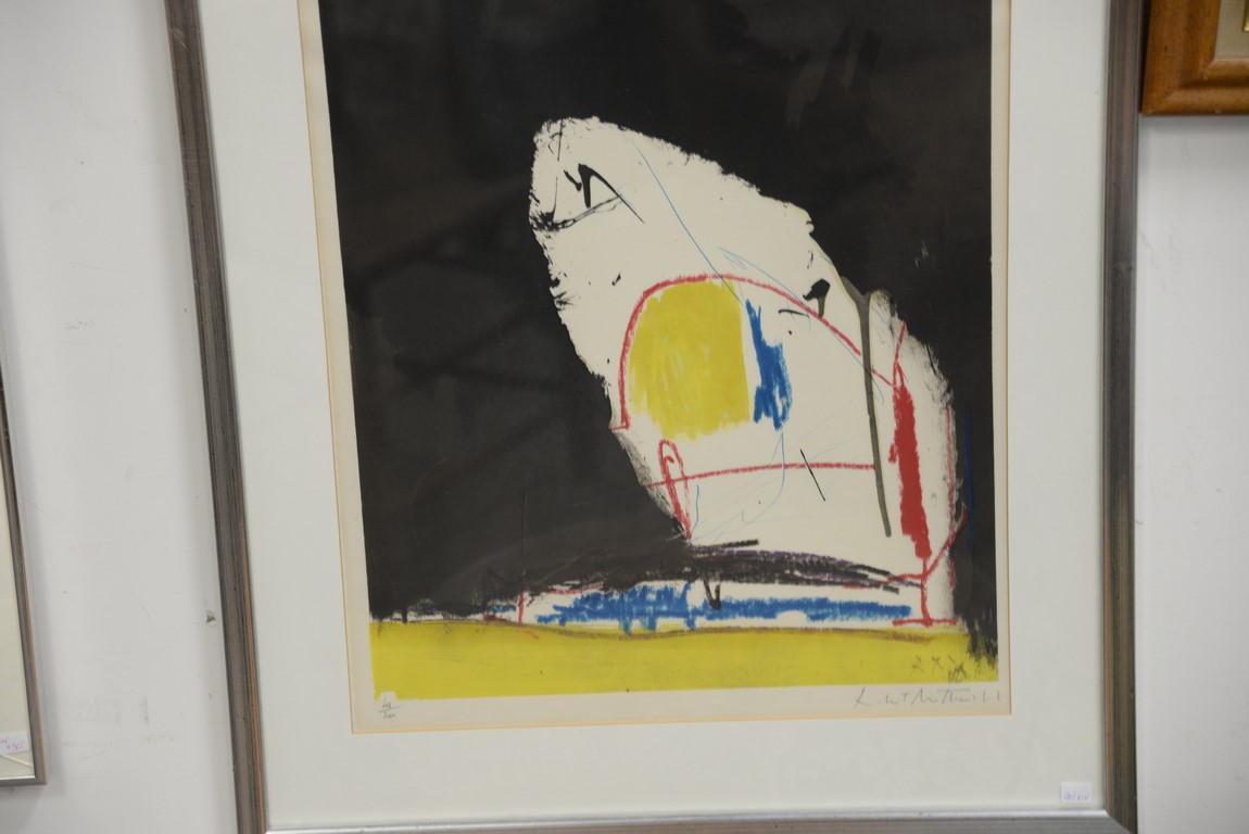 Lot 463: Four framed pieces to include collage signed Joan White, a collage signed Lorraine Sch.., colored lithograph Another light signed…