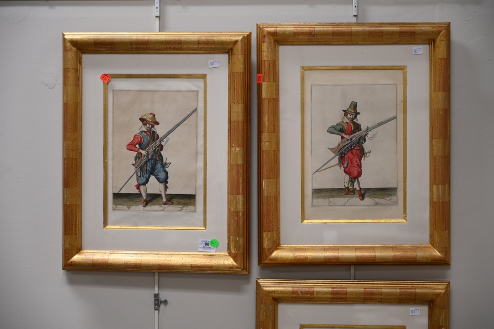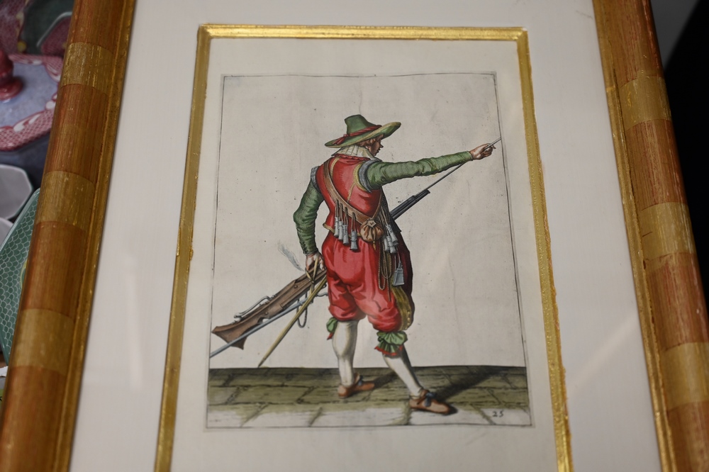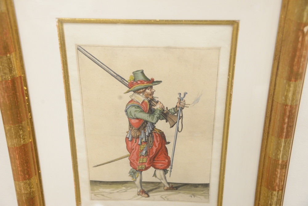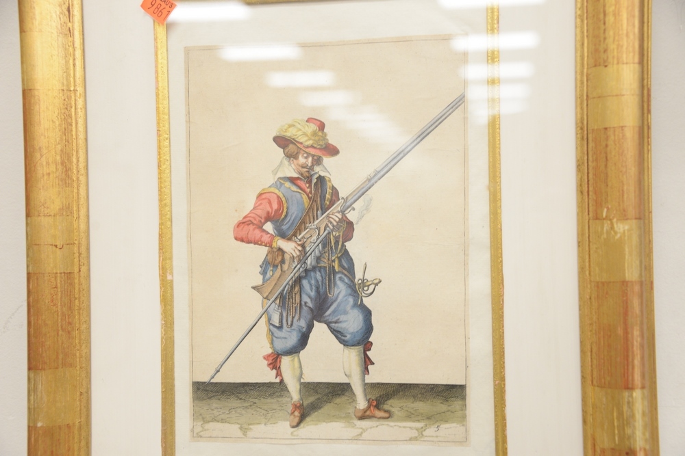 Four Piece Lot, to include a set of four Continental School soldier engravings, possibly German, engraving with hand coloring, each …