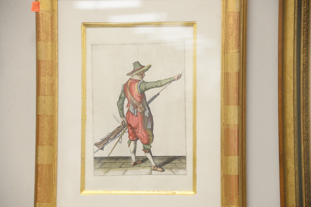 Lot 463: Four Piece Lot, to include a set of four Continental School soldier engravings, possibly German, engraving with hand coloring, each unsigned, having matching frames, sight size 10 1/2″ x 7 1/2″, Provenance: David and Cynthia Kim, 22 Stoney Wylde Lane, Greenwich, Connecticut. View home by visiting: https://www.zillow.com/homedetails/22-Stoney-Wylde-Ln-Greenwich-CT-06830/177238281_zpid/ .