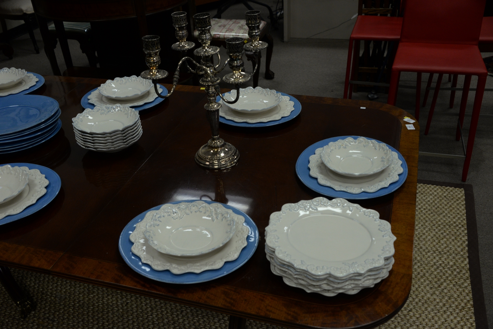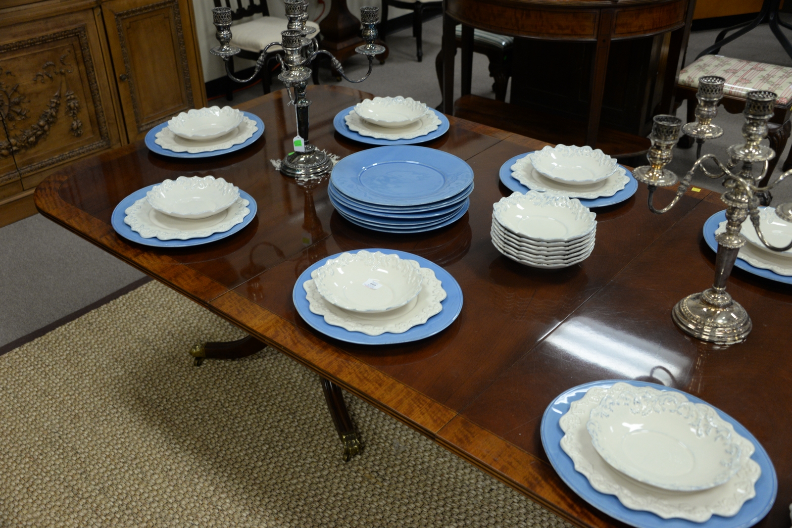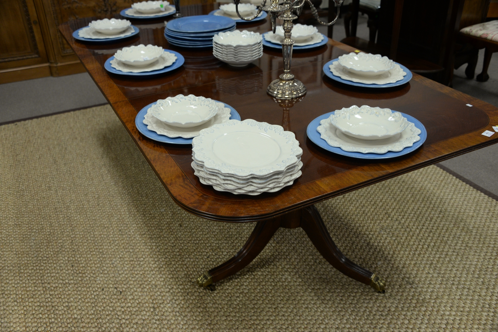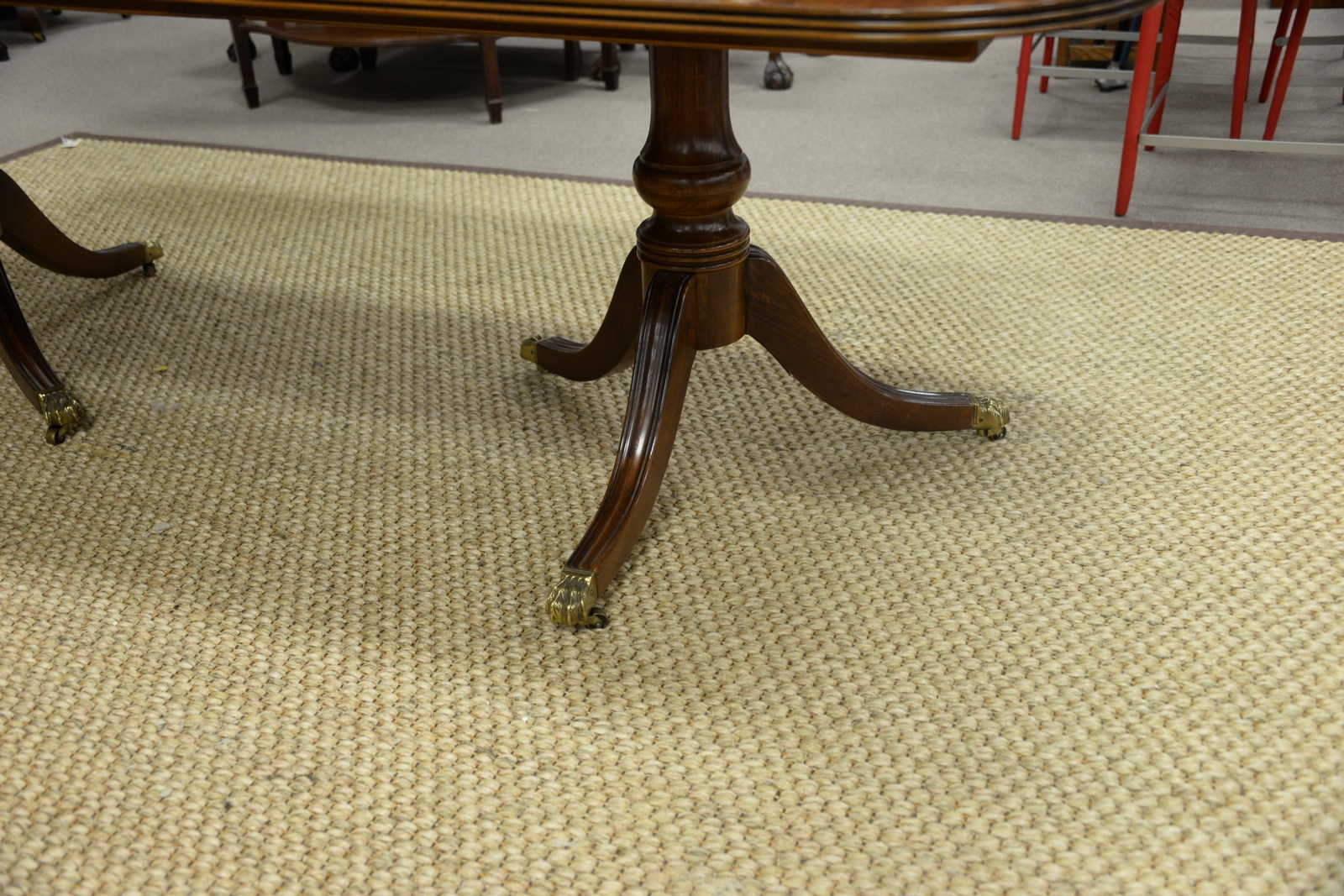 Lot 463: Henredon mahogany dining table with banded inlaid top set on double pedestal base with brass capped paw feet having two 24 leaves. …
