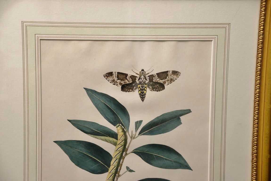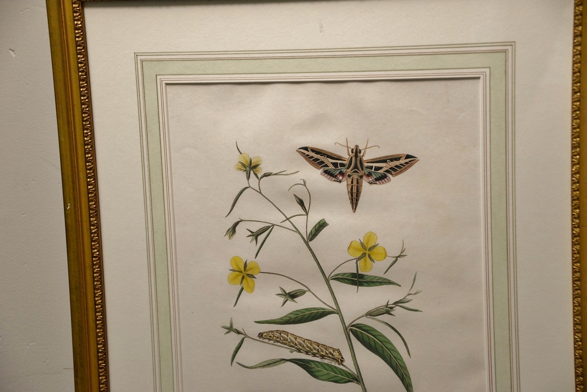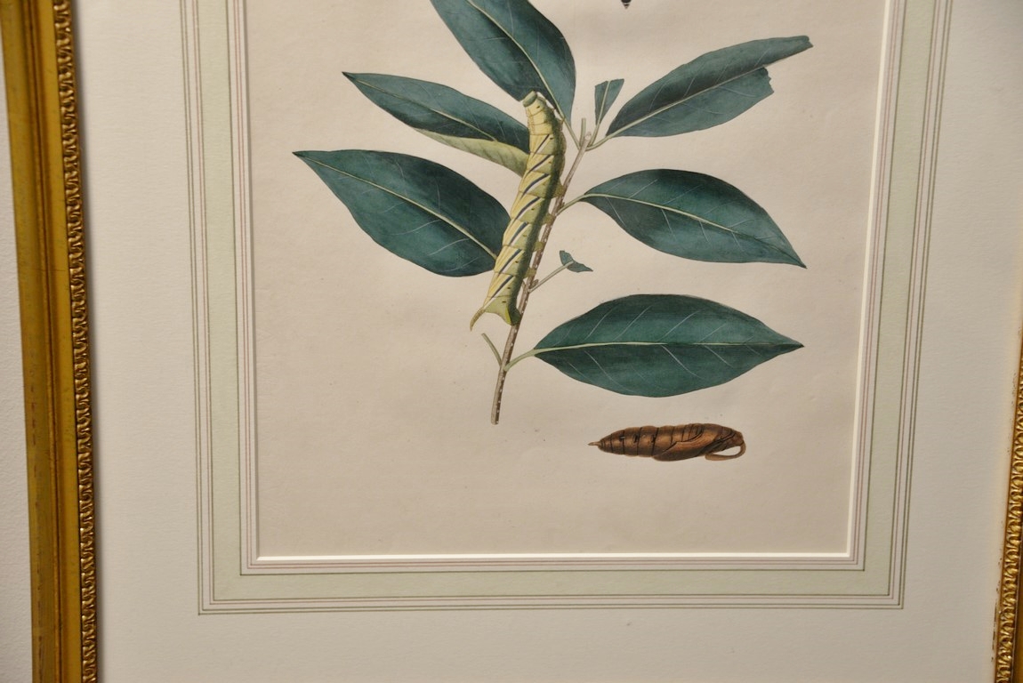 John Abbot 1751-1839 pair of hand colored aquatint engravings Sphinx Vitis, Painted Hawk-Moth Plate #40 and Sphinx Chionanthi, Fringe-Tree/hawk/moth Plate #34 From The Natural History of the Rarer Lepidoterous Insects of Georgia Published by James Edward Smith 1759-1828 framed and matted by W. Graham Arader III sight size: 14 x 11 Provenance: Property from Credit Suisse’s Americana Collection