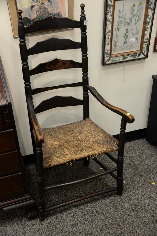Ladder back great chair, five slat with rush seat. one slat missing top height 47 inches, seat height 17 inches Provenance: Estate of R. Donald Bassette