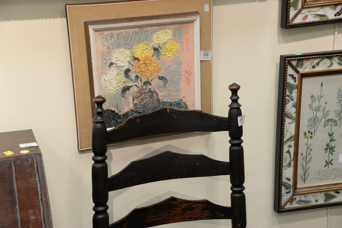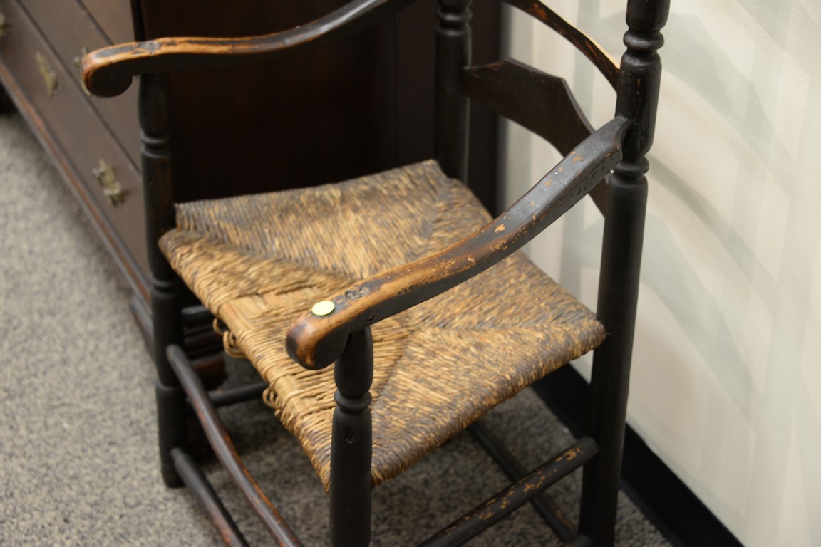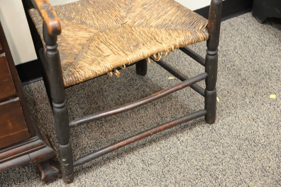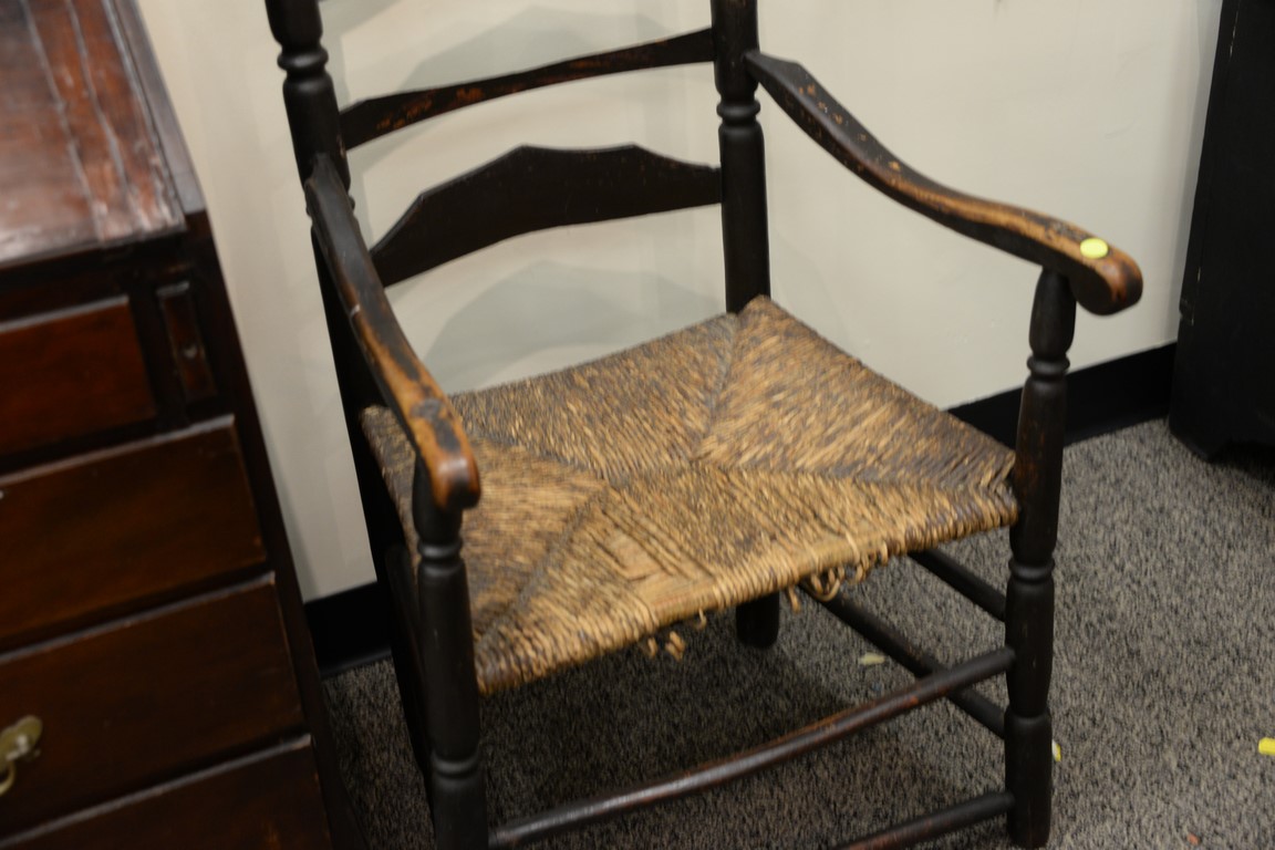 Lot 463: Ladder back great chair, five slat with rush seat. one slat missing top height 47 inches, seat height 17 inches Proven…