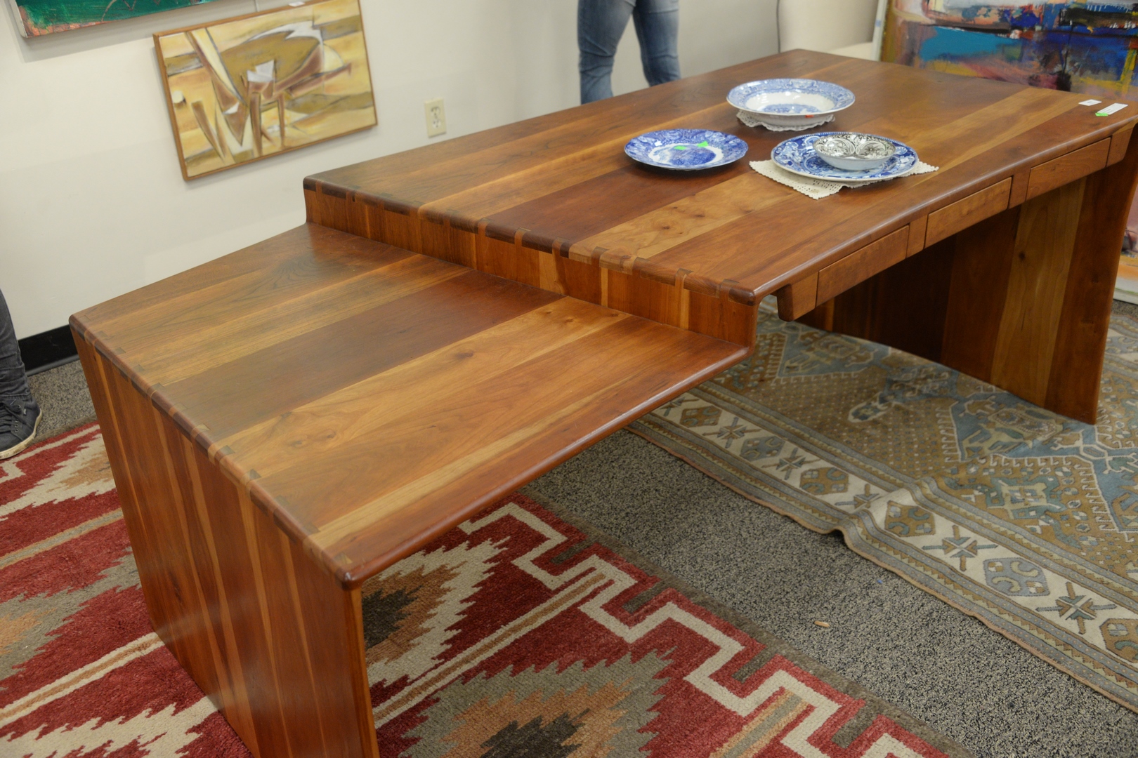Lot 463: Large Mid-Century Modern Two-Tier Desk, having three drawers, exposed dovetails, Nakashima style, height 29 1/2 inches, top 36″ x 74″.