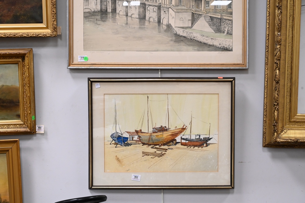 Lot 463: Two Framed Pieces, to include Richard Haas (American, b. 1936), Old Waterworks, Philadelphia, aquatint in colors on paper, signed, titled, and numbered 201/235 in pencil throughout the lower margin, image size 18″ x 25.5″; along with a watercolor, harbour scene, signed illegibly, 13.5″ x 18.5″.