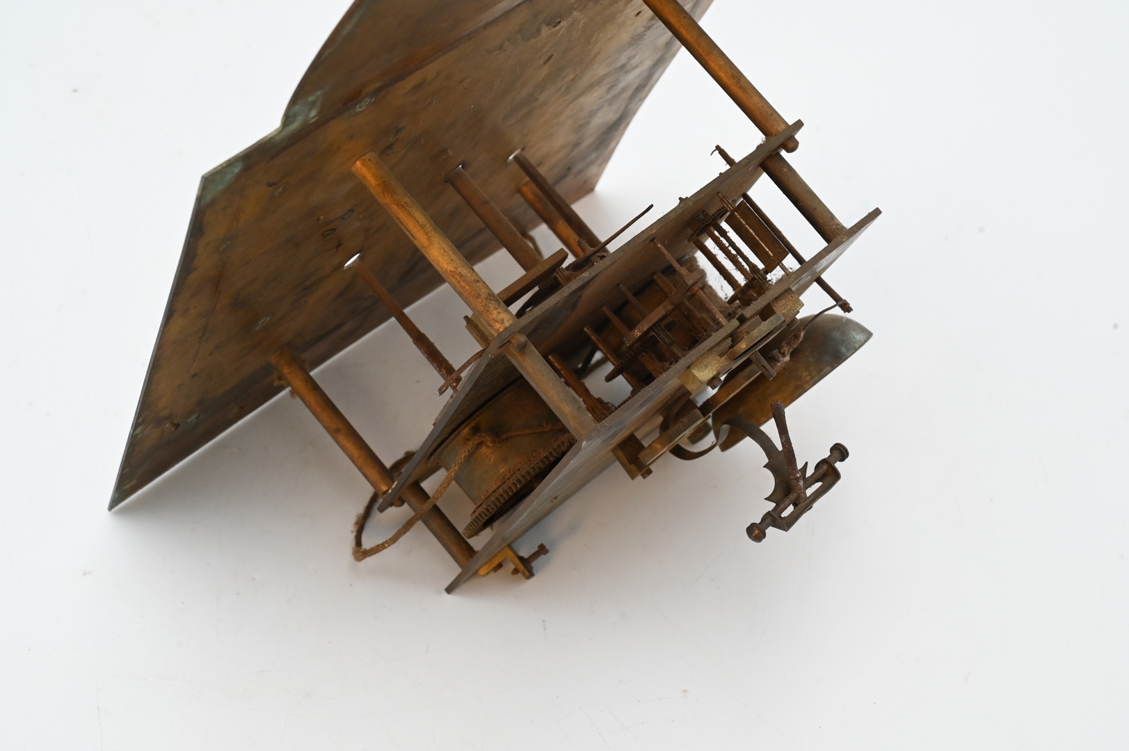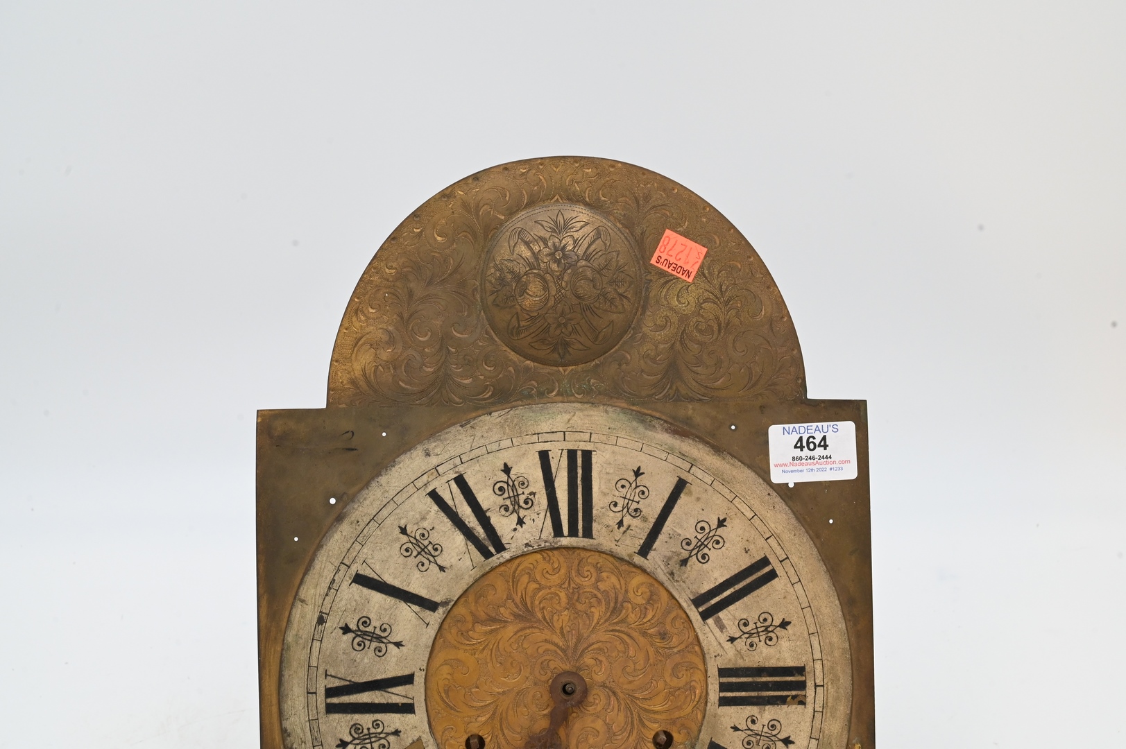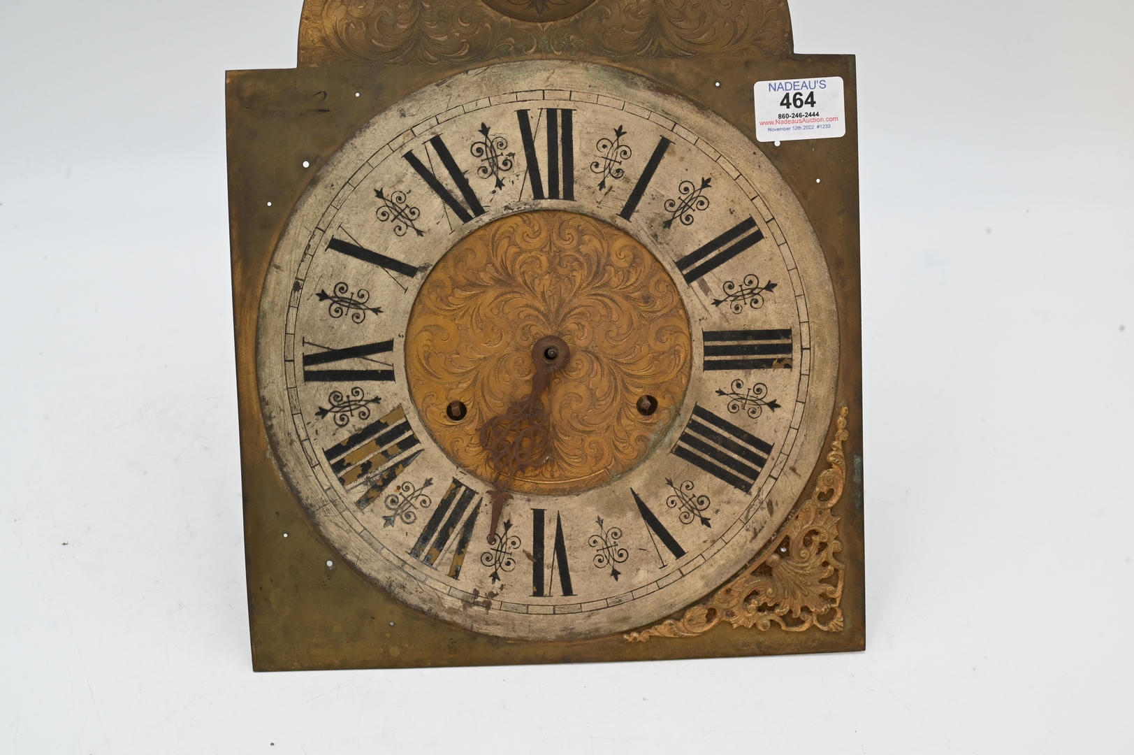 19th Century Clock Face, having brass works and metal frame, height 14 1/2 inches, depth 10 1/2 inches. Provenance: Estate of Peter Tillou, Litchfield, Connecticut.