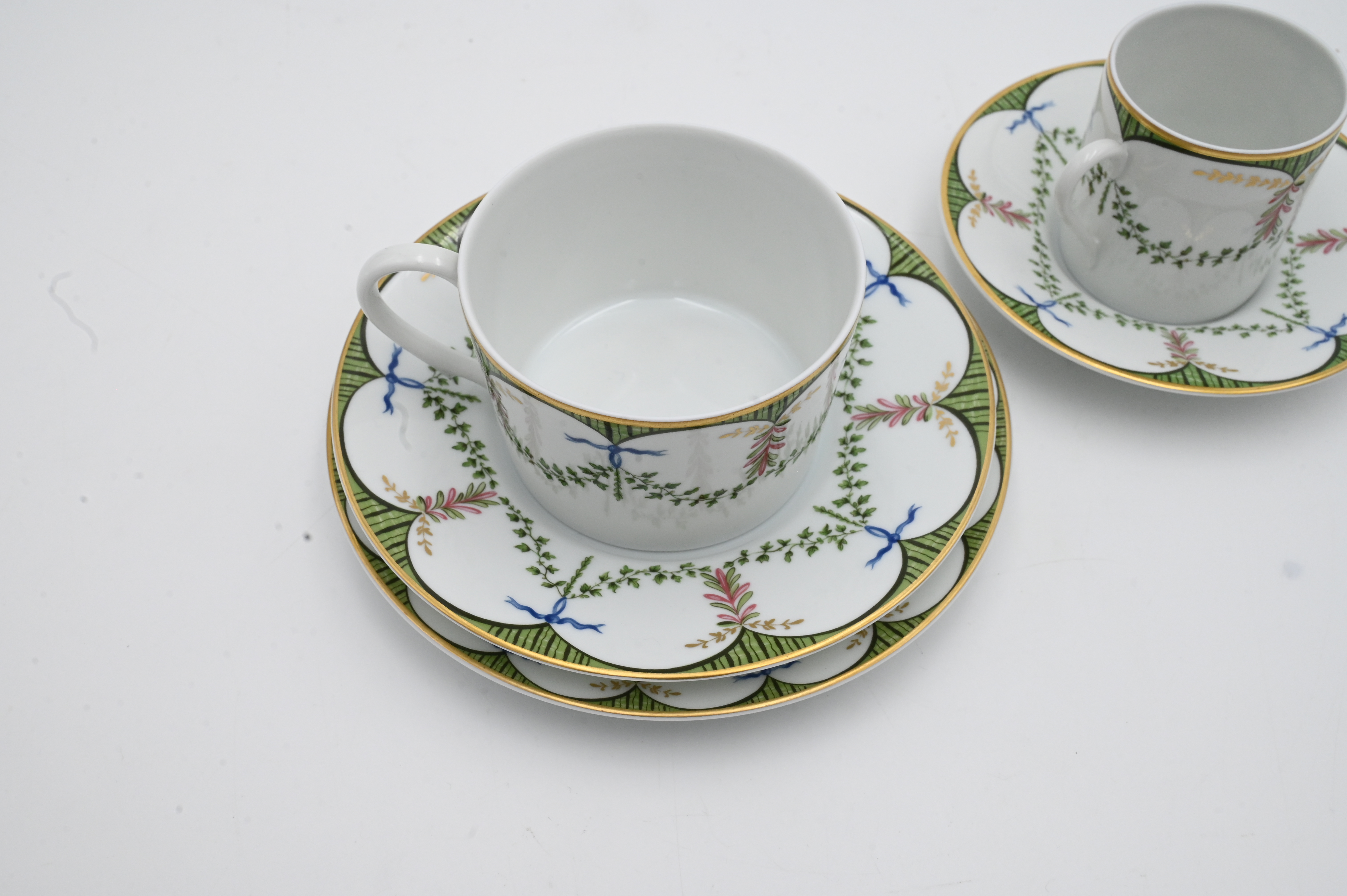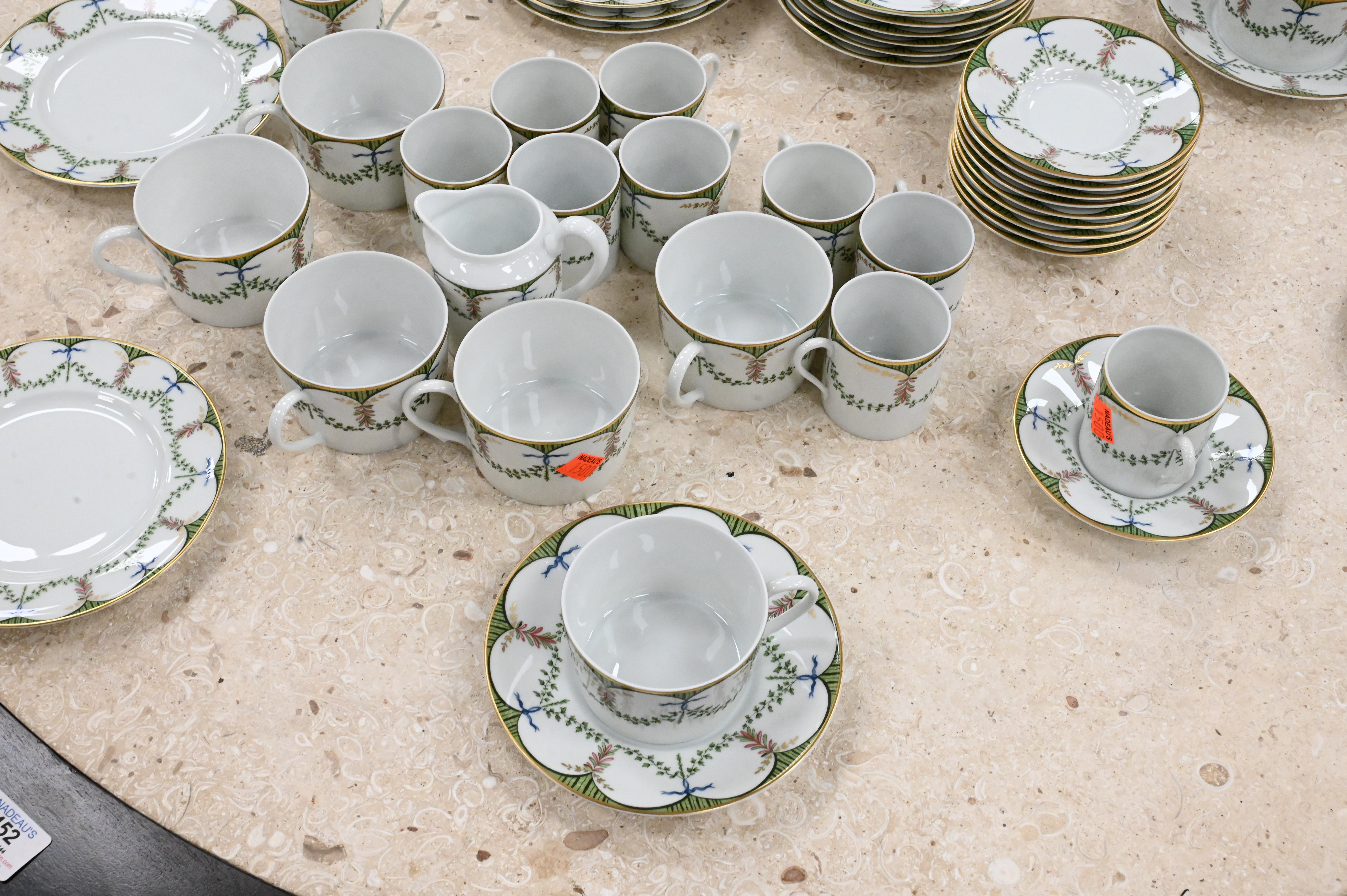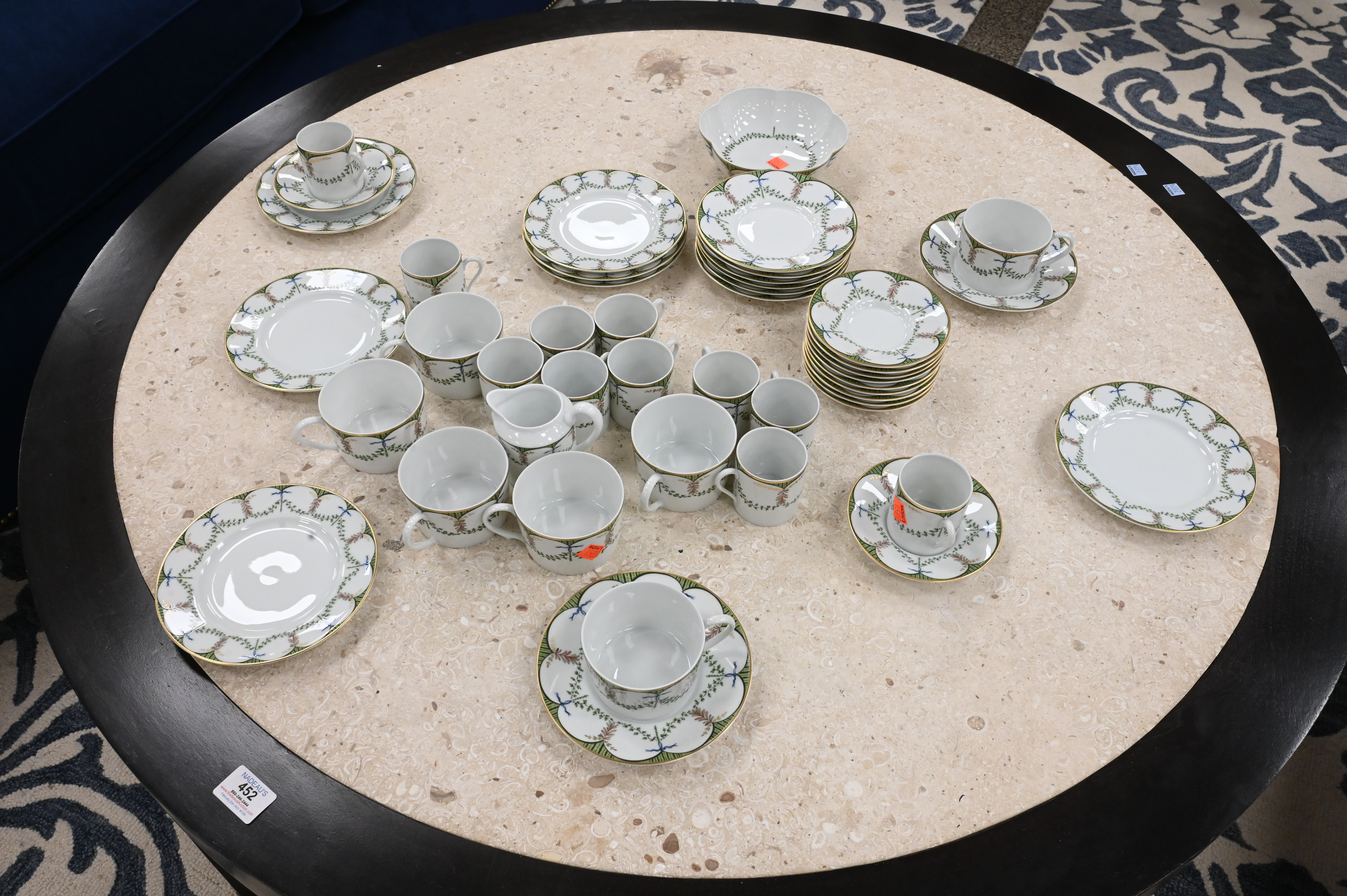 45 Piece Raynaud Limoges “Festivities” Breakfast Set, to include 8 pastry plates, 9 coffee saucers, 8 coffee cups, 12 demitasse cups, 12 demitasse saucers, 1 bowl, along with 1 creamer.