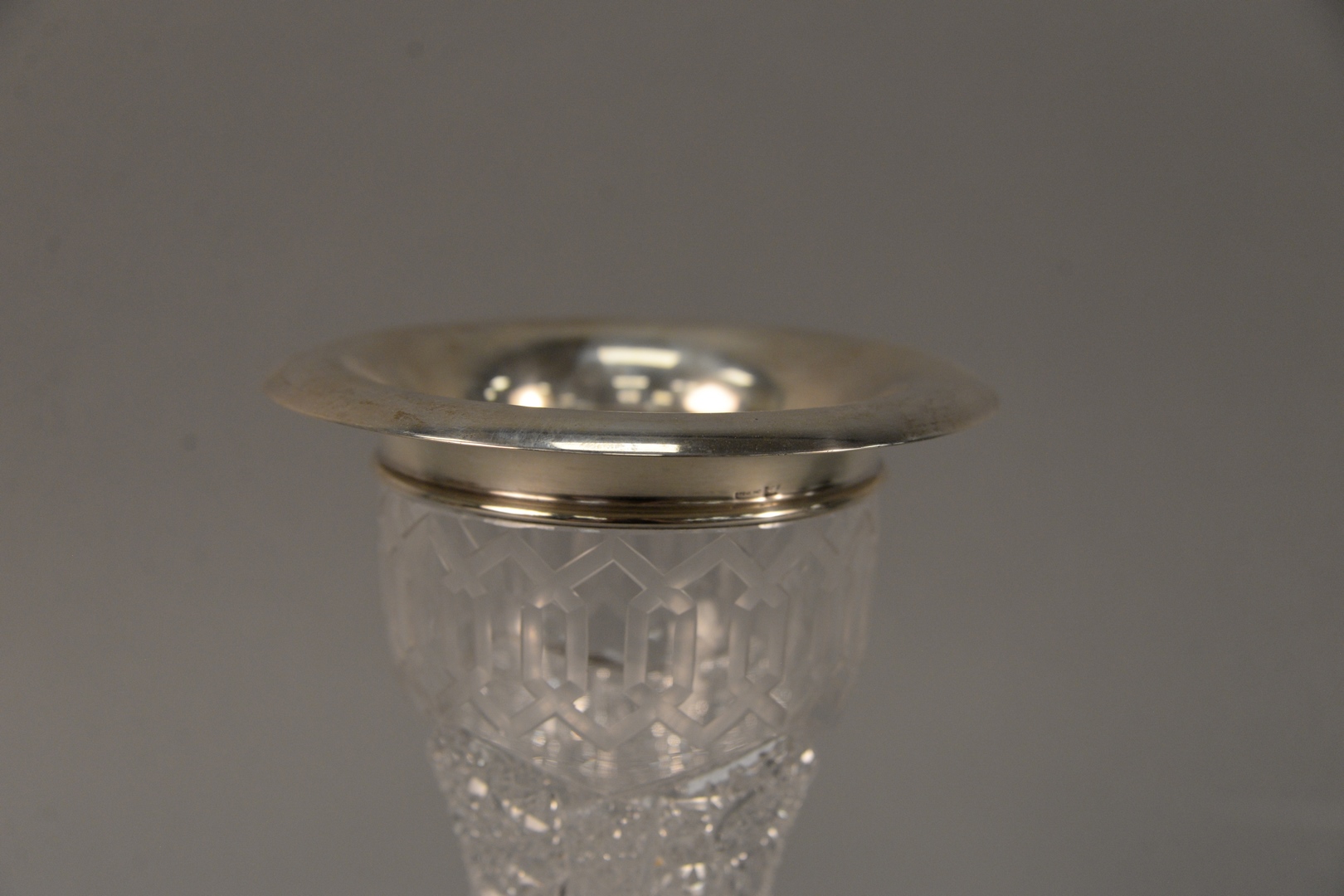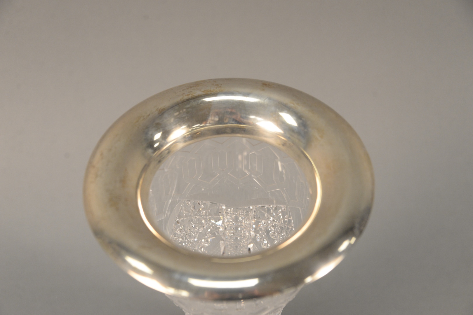 Lot 464: American Brilliant Cut Glass Vase Alhambra Greek key pattern, having sterling silver rim height 10 inches