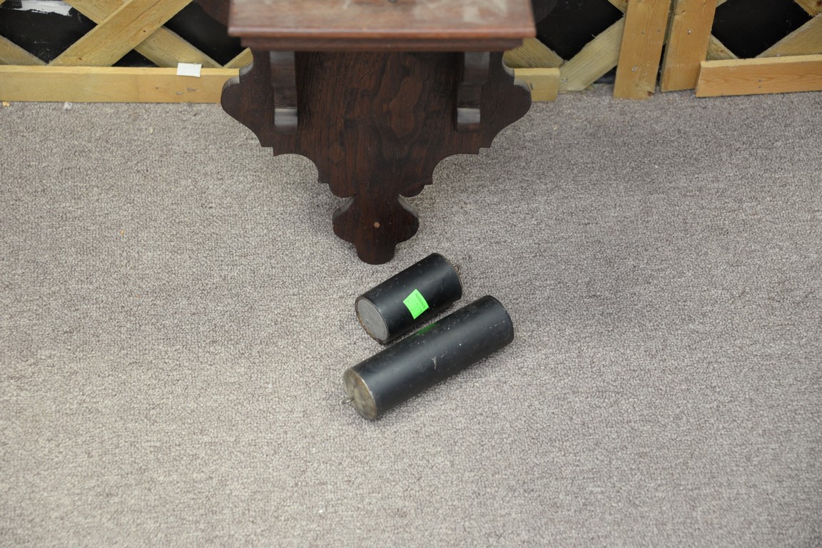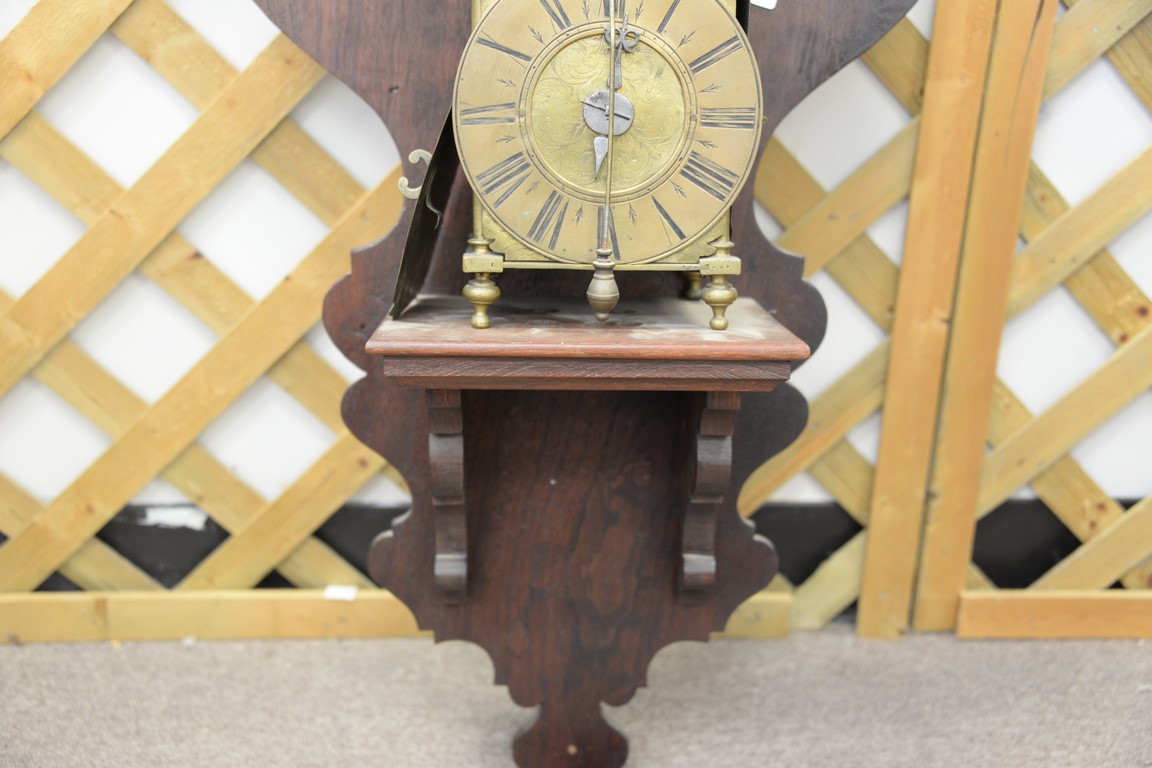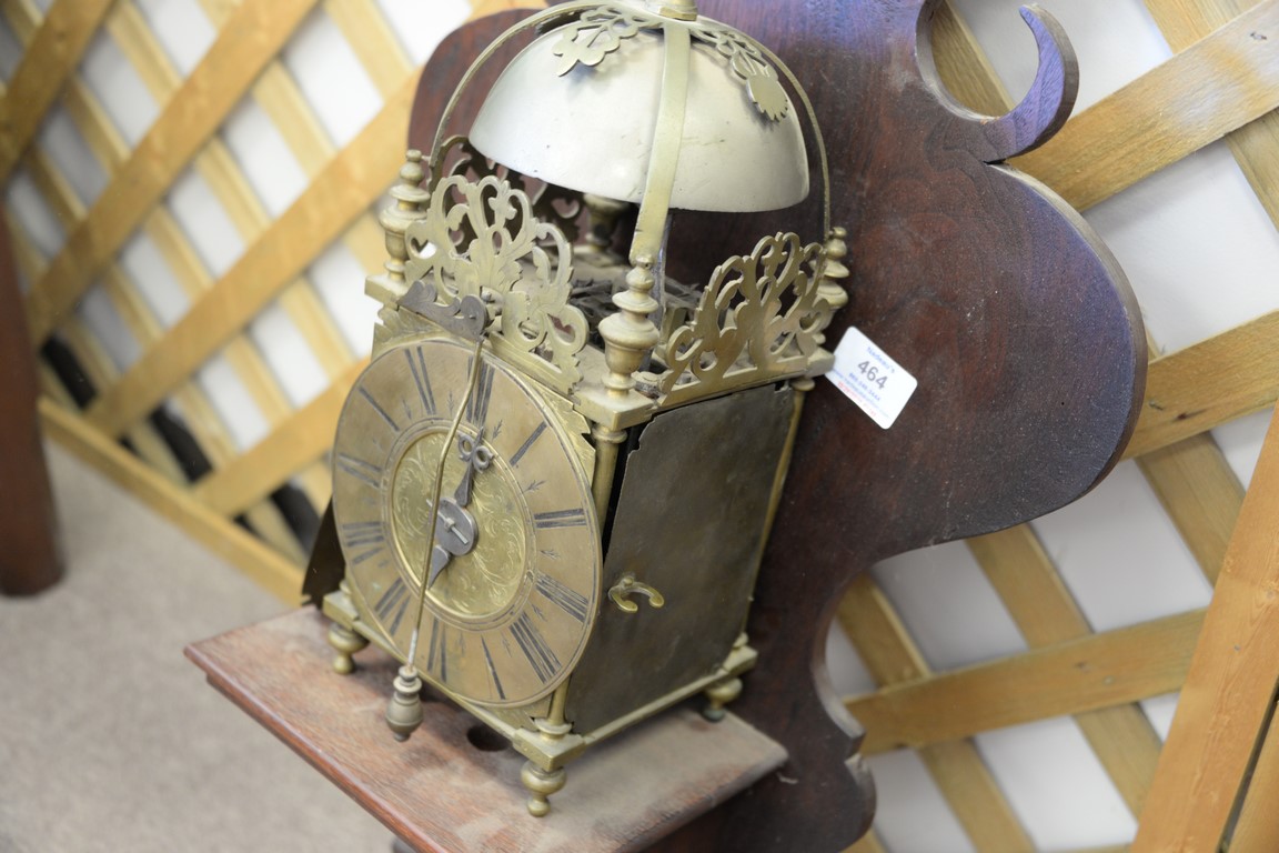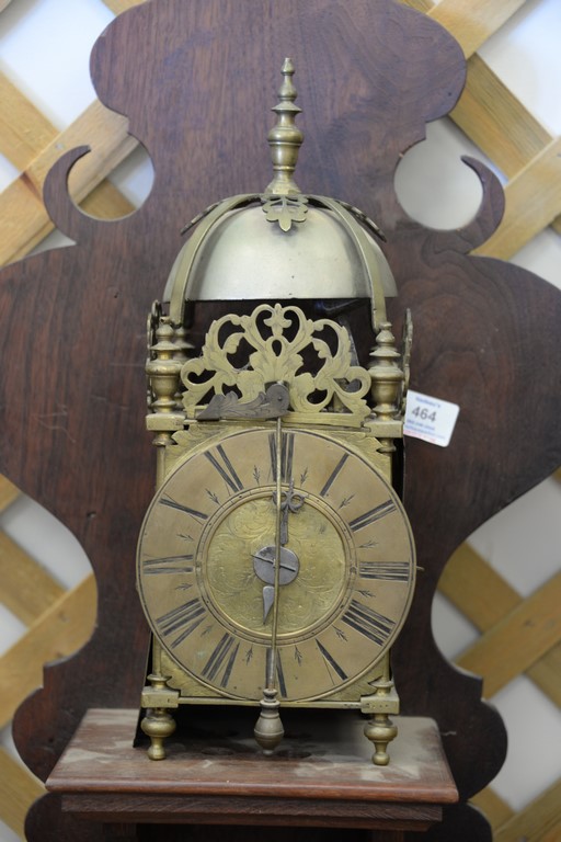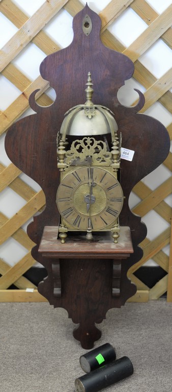 Brass skelton clock with chime dome top, brass works, and mahogany wall shelf.