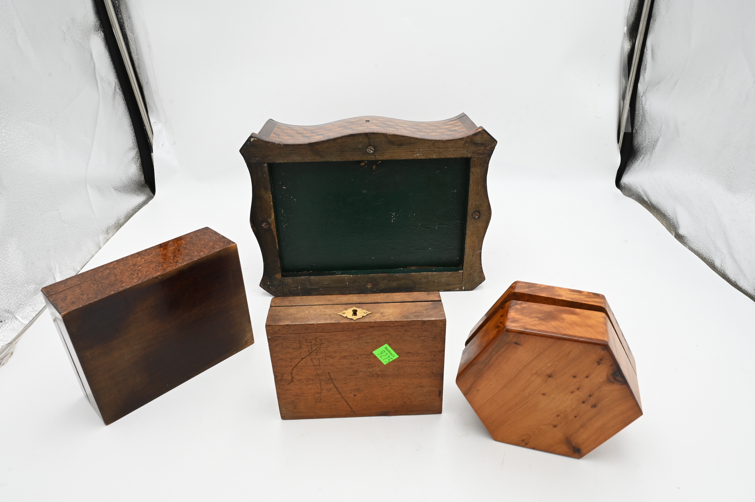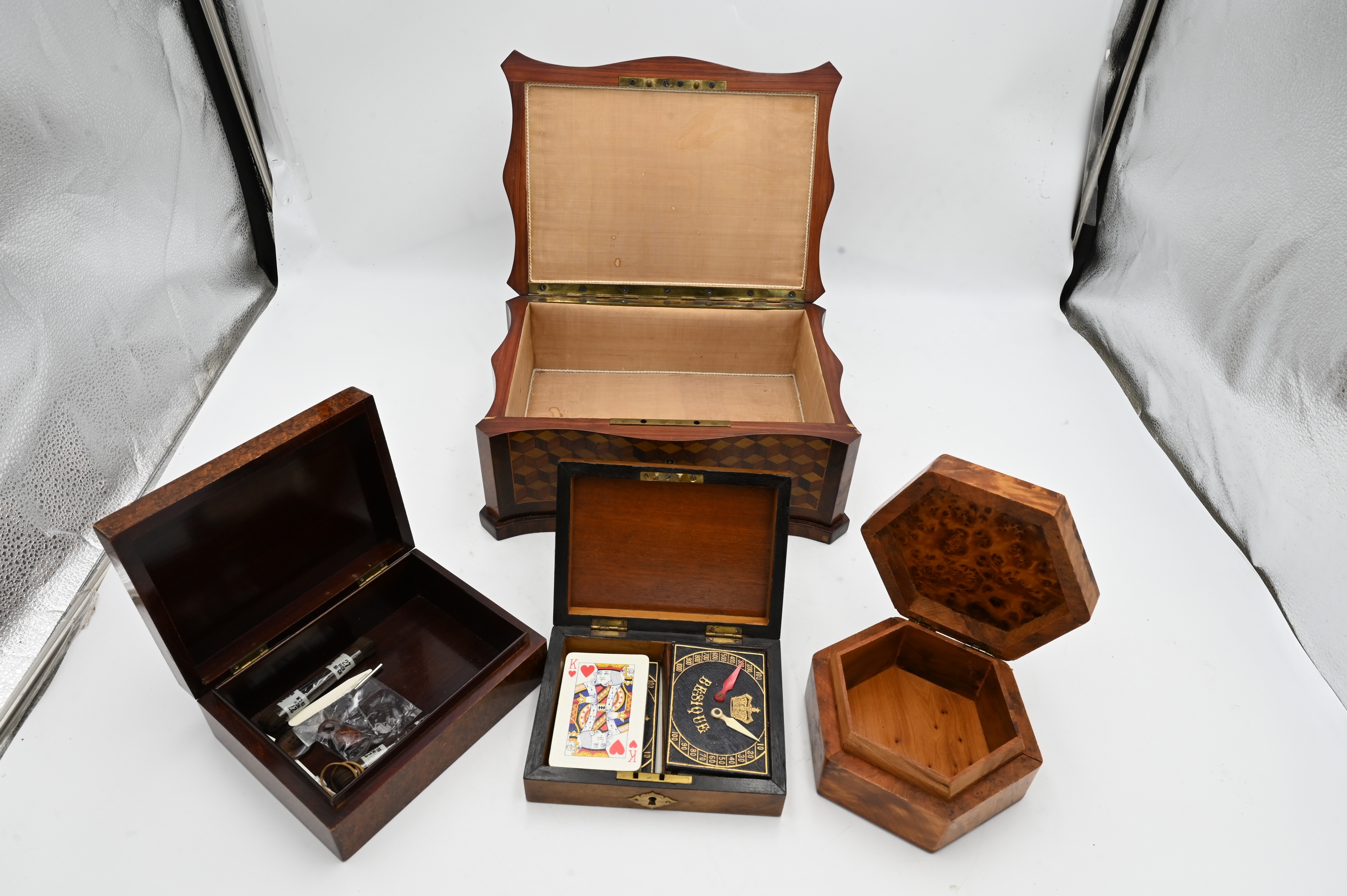to include geometric parquetry box having silk interior, small vintage game box for Bezique, small faux burlwood box, and small octagonal burlwood box