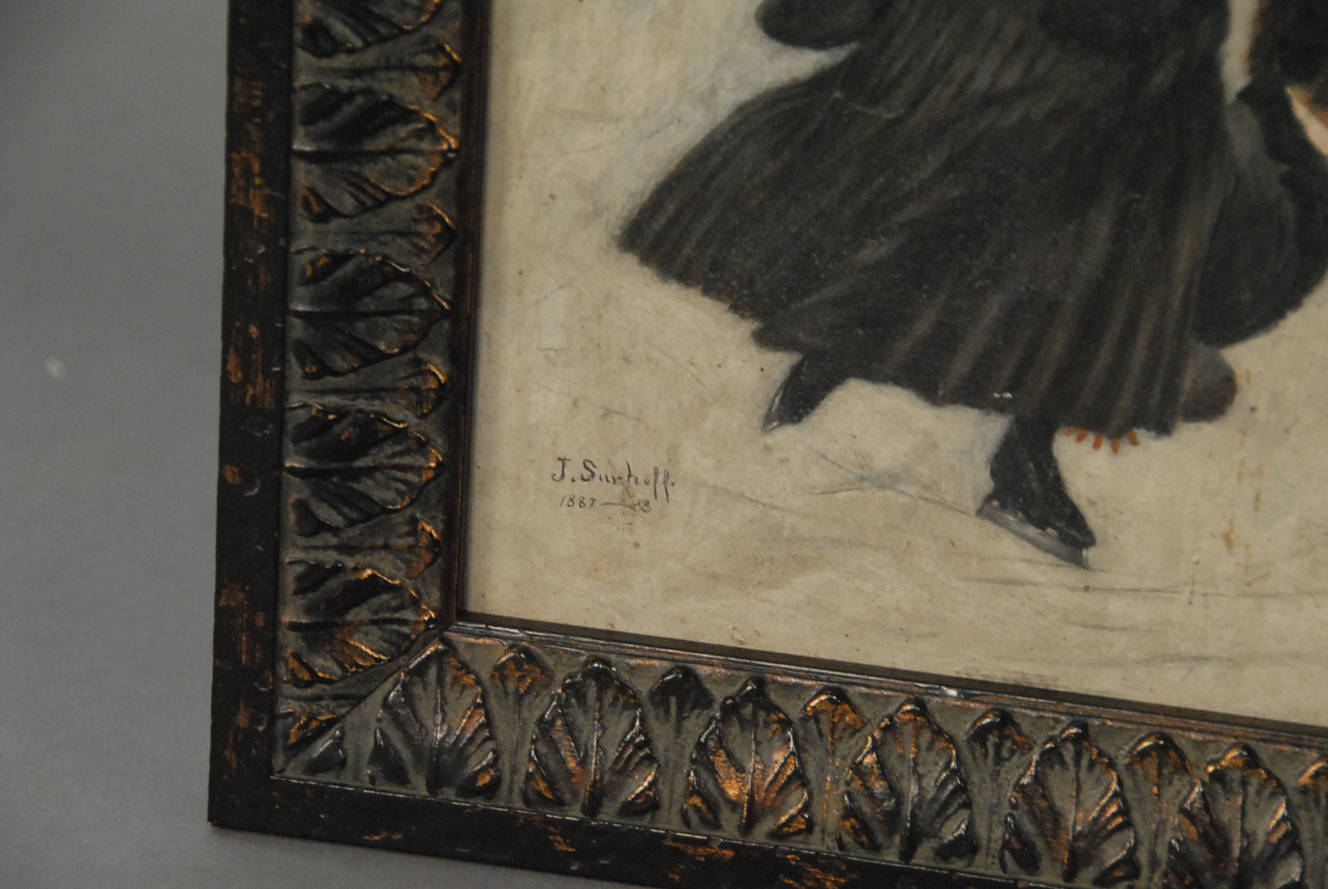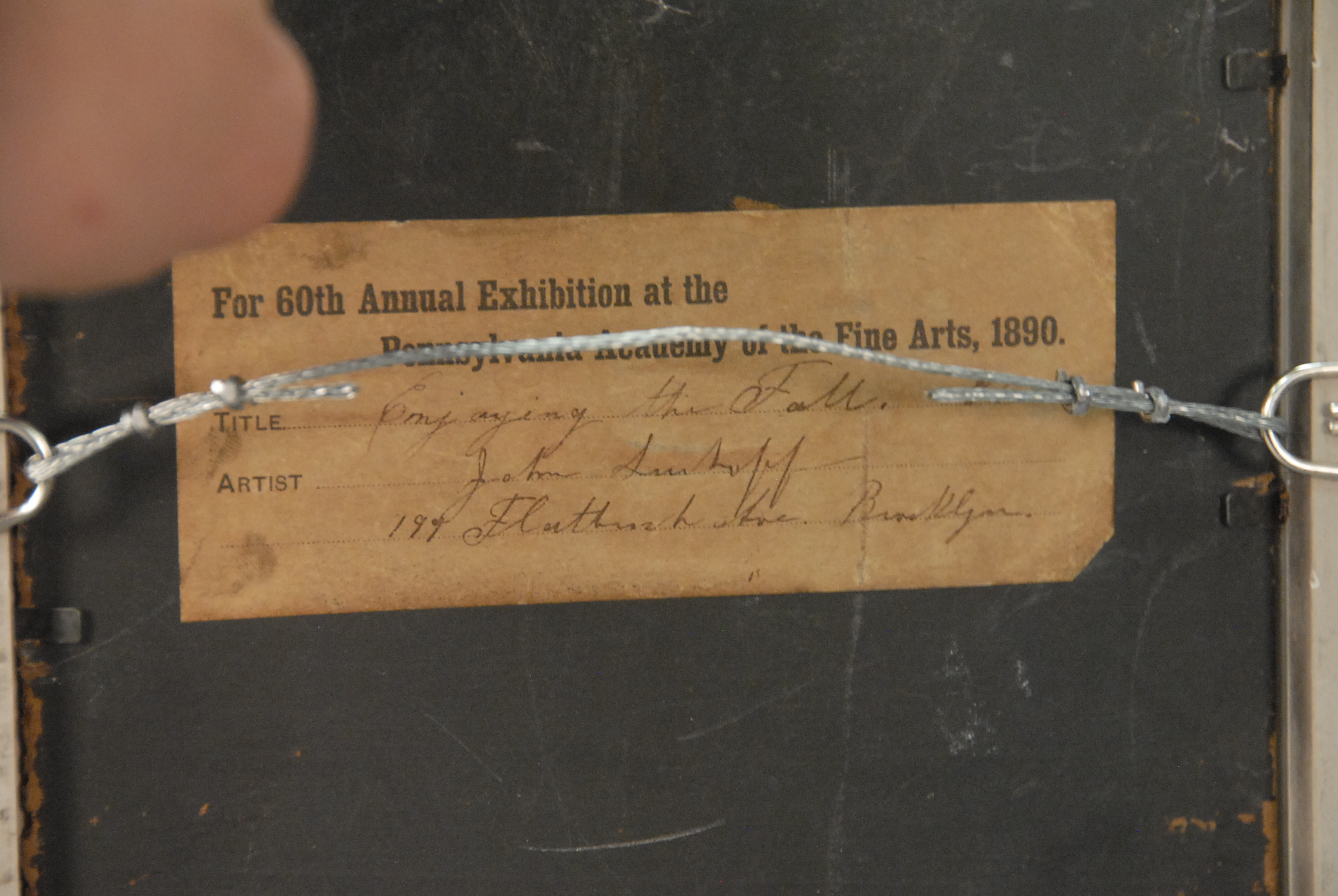 Lot 464: John Surhoff 19th Century ENJOYING THE FALL 85 oil on board signed lower left J. Surhoff 1887-88 Pennsylvania Academy of the Fine Arts 1890 label on verso titled and signed from 199 Flatbush Ave. Brooklyn 10
