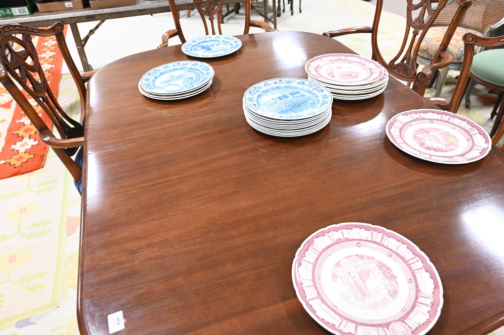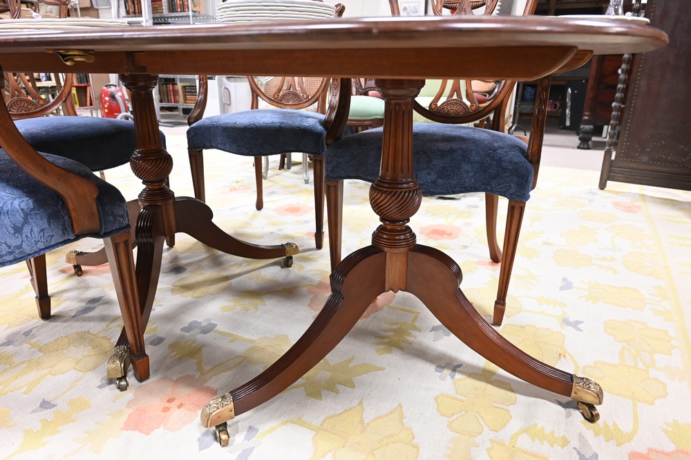 Lot 464: Margolis Custom Mahogany Double Pedestal Dining Table, along with three 14 inch leaves; custom pads on carved pedestal bases; height…