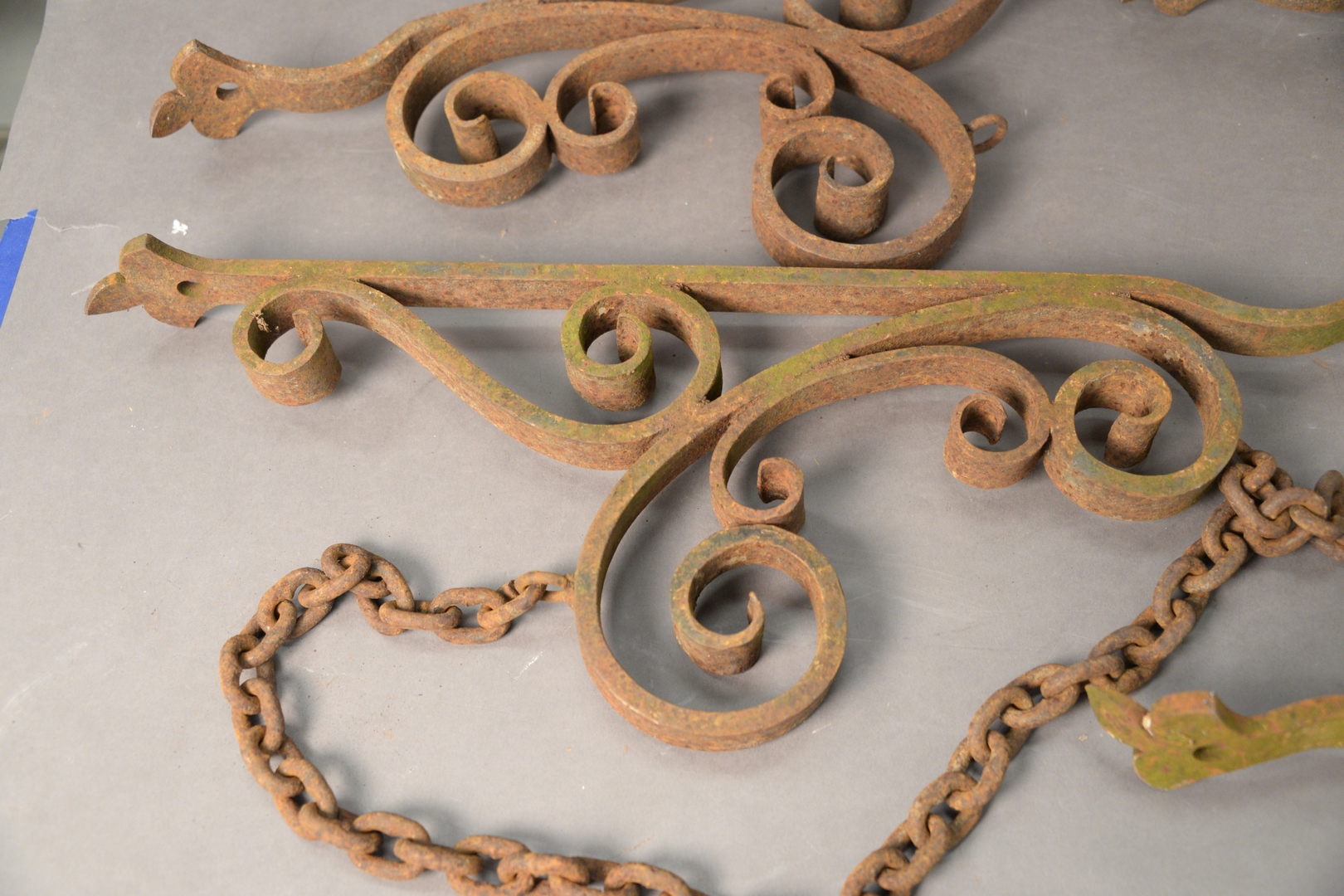 Set of Four Hand Forged Iron Brackets with Chains, height 26 inches.