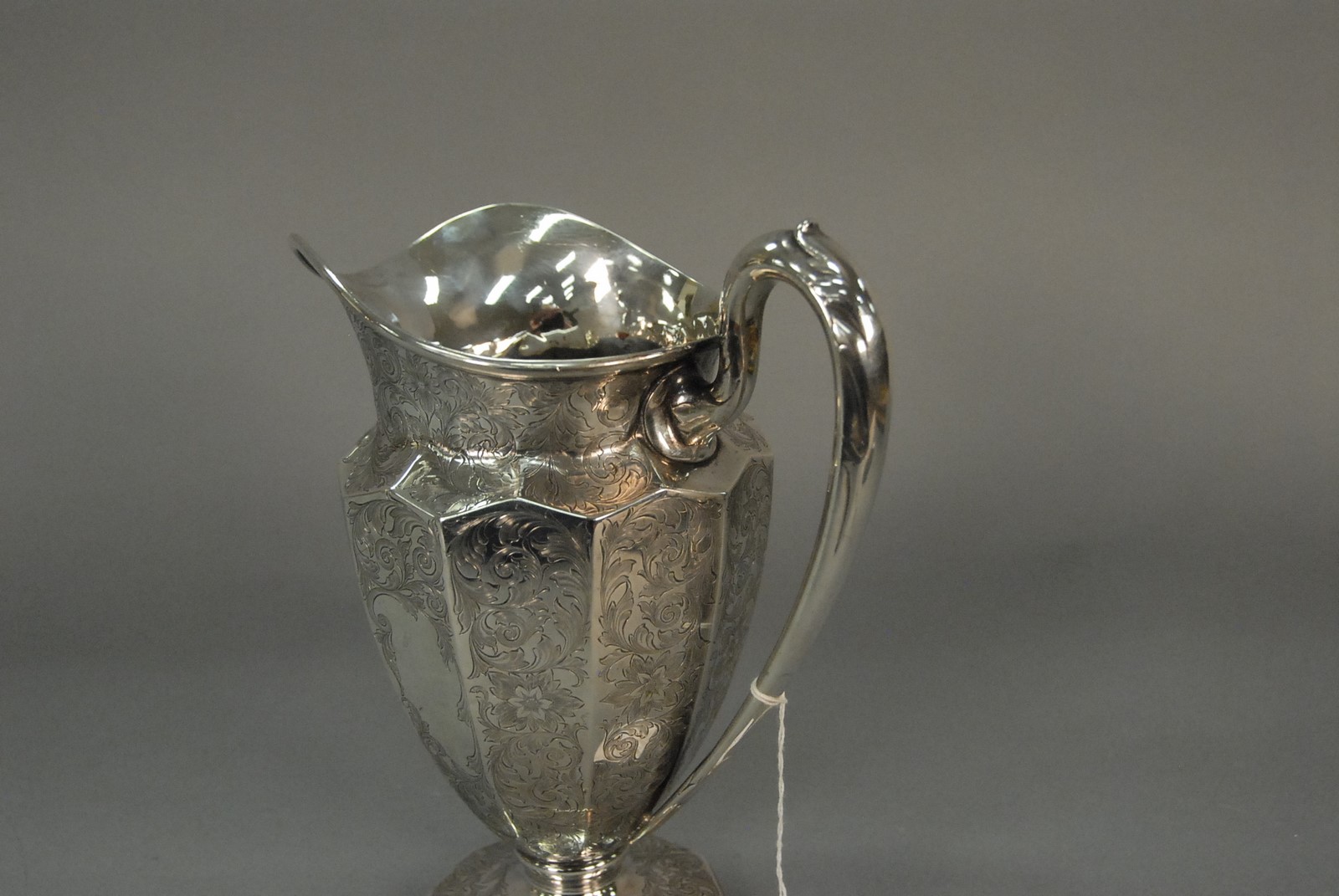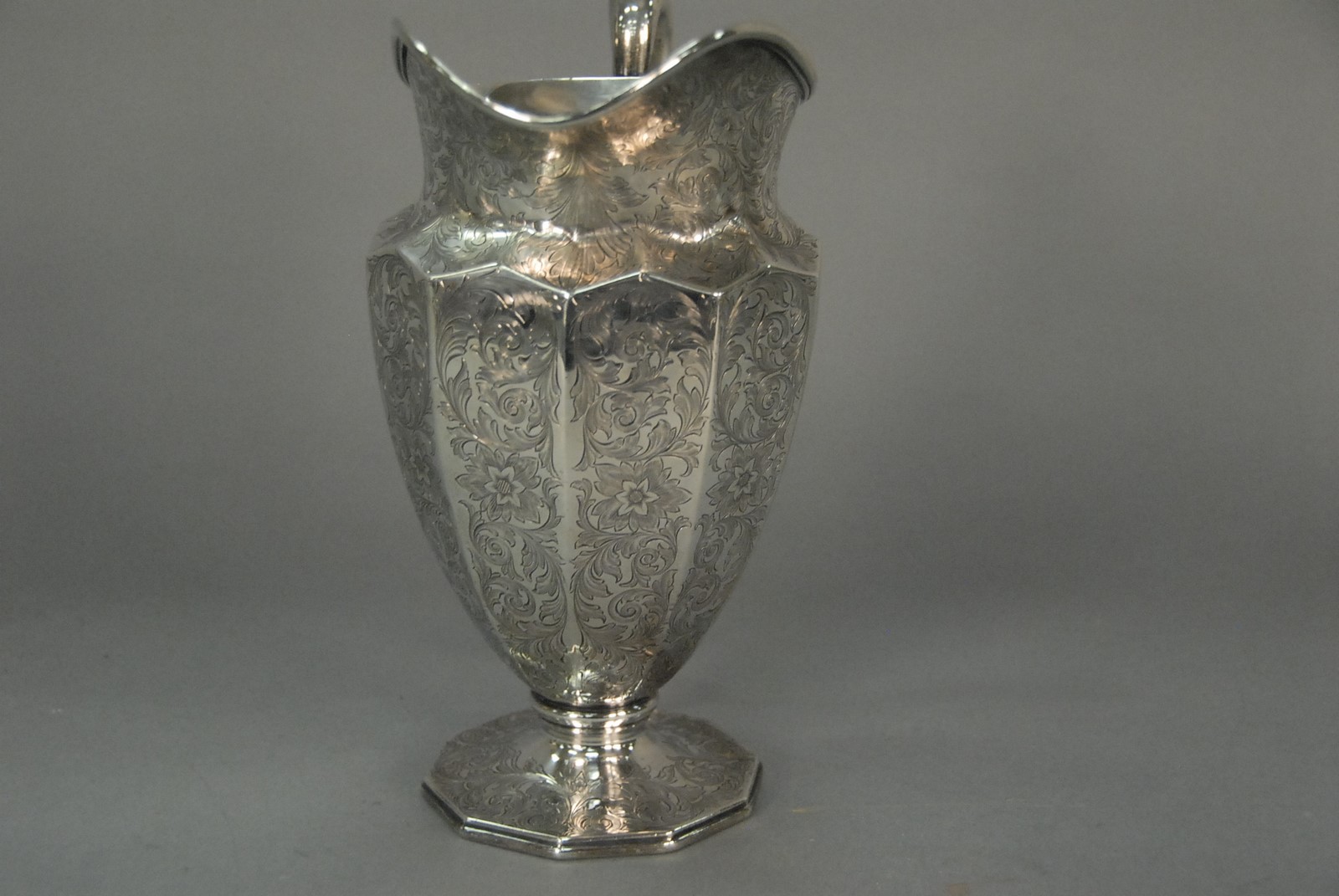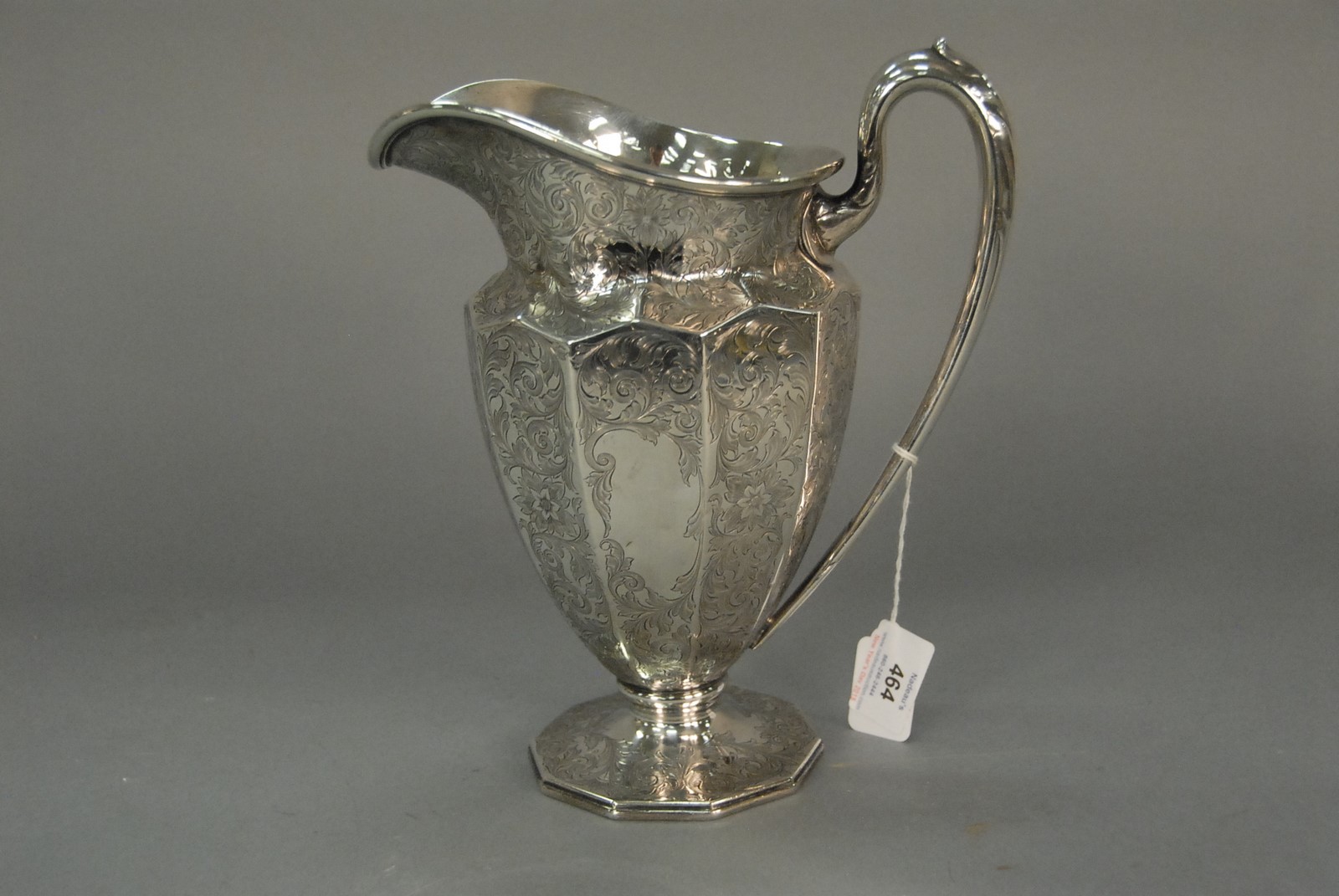 Lot 464: Sterling silver pitcher with all over scroll design on footed base. ht. 10 1/4 in. 24.5 t oz. Provenance: Property from The Estate of Margaret Oliphant of Old Lyme, Connecticut