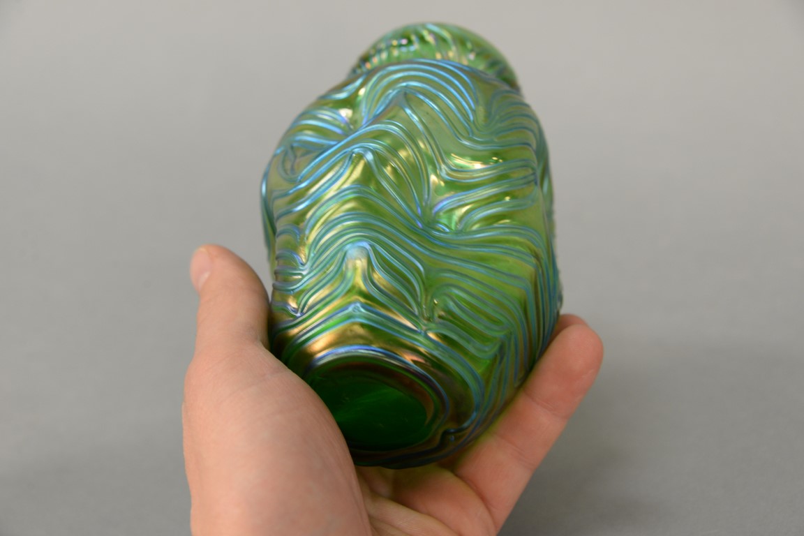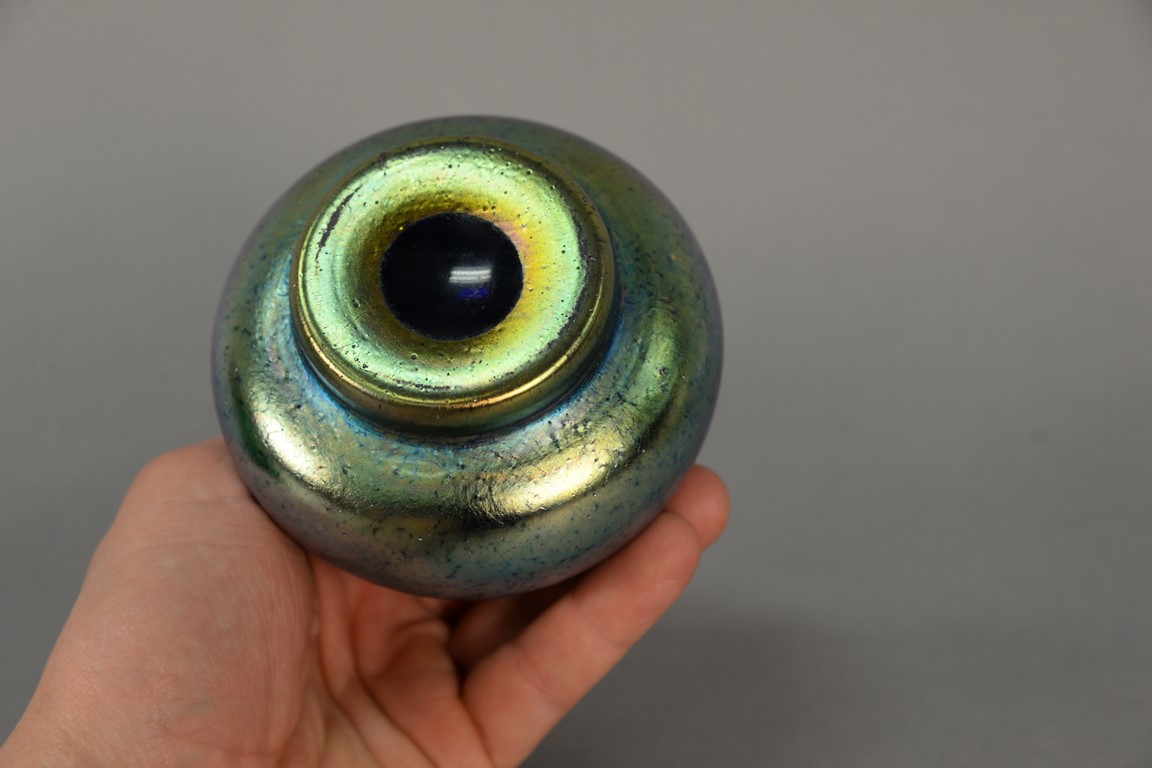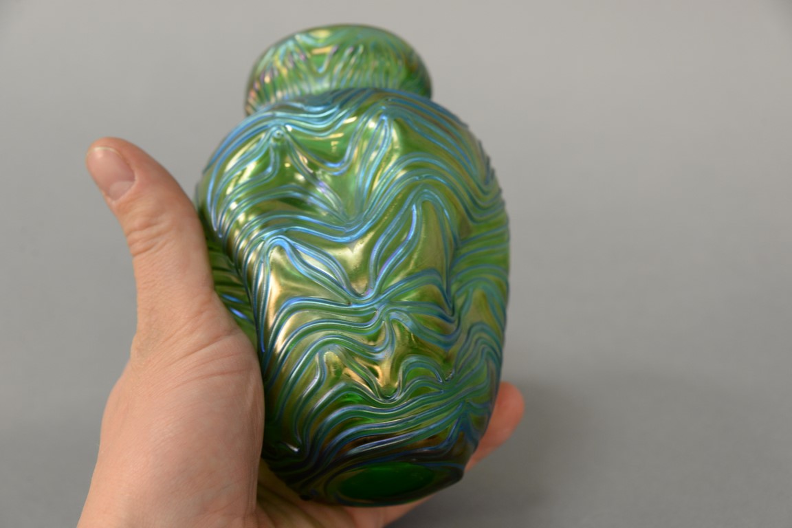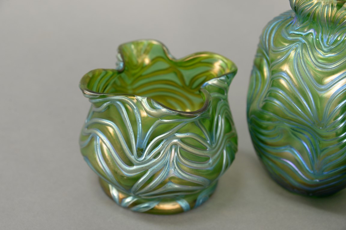 Lot 464: Three Loetz art glass vases to include a green oil spot short vase and two Formosa vases green/blue with polished pontil, ht. 3 1/2 …