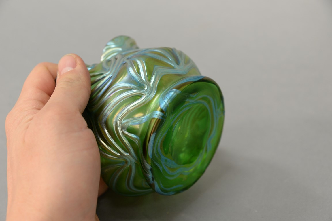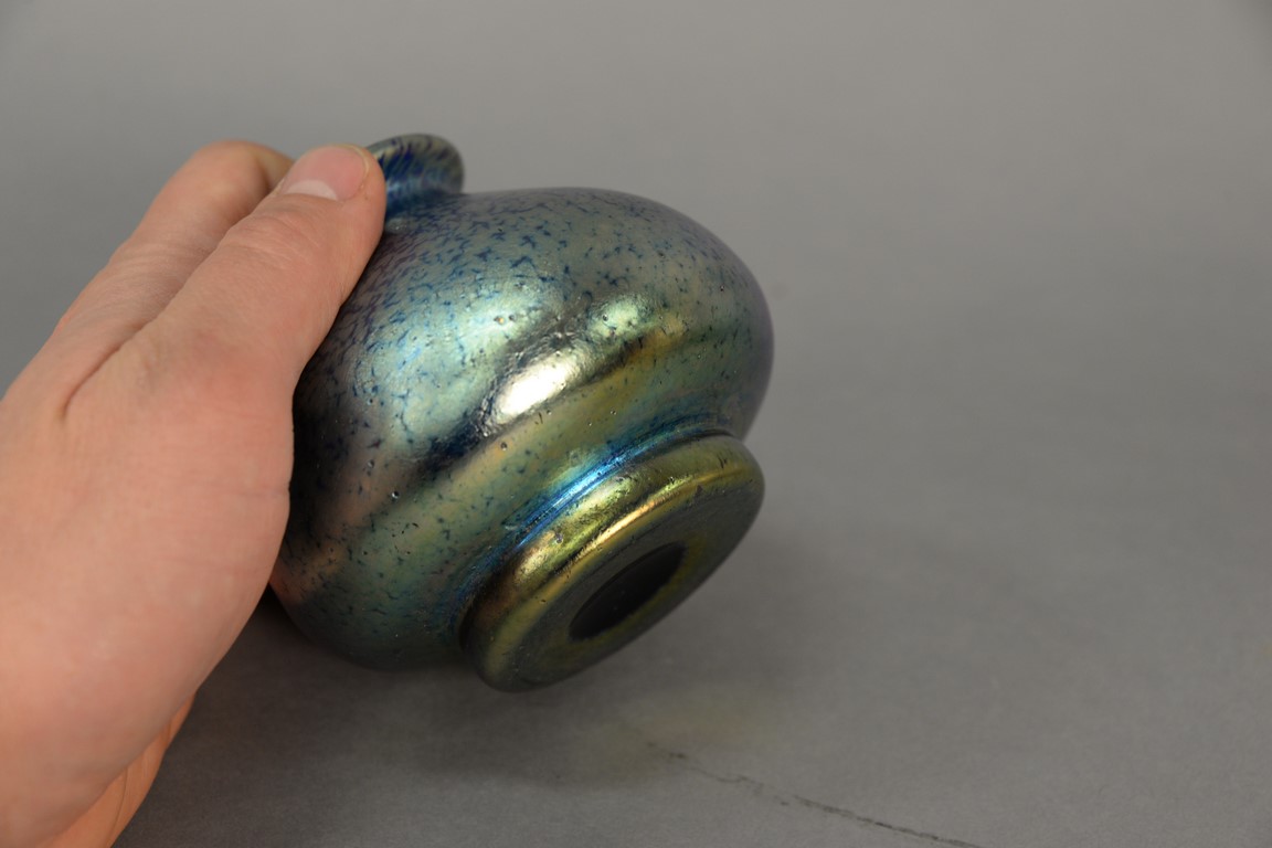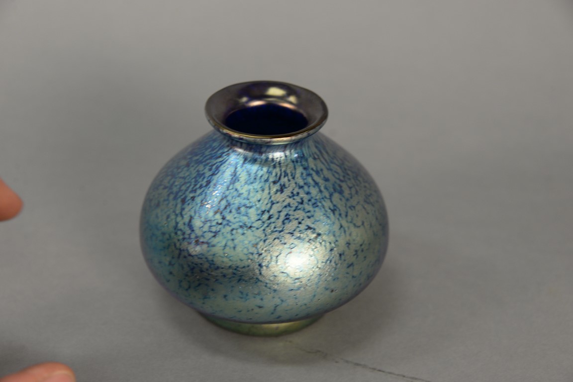 Three Loetz art glass vases to include a green oil spot short vase and two Formosa vases green/blue with polished pontil, ht. 3 1/2 in., ht. 3 1/2in., ht. 5 3/4in.