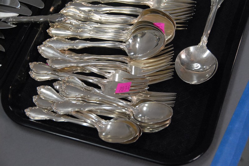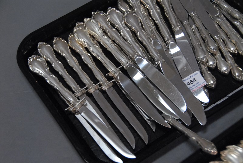 Lot 464: Towle sterling Fontana flatware set to include 12 luncheon forks, 12 soup spoons, 13 dinner forks, 15 teaspoons, 10 butter knives, 8 steak knives, 13 dinner knives, and 4 serving pieces, 87 total pieces, 72 t oz. plus 33 handles.
