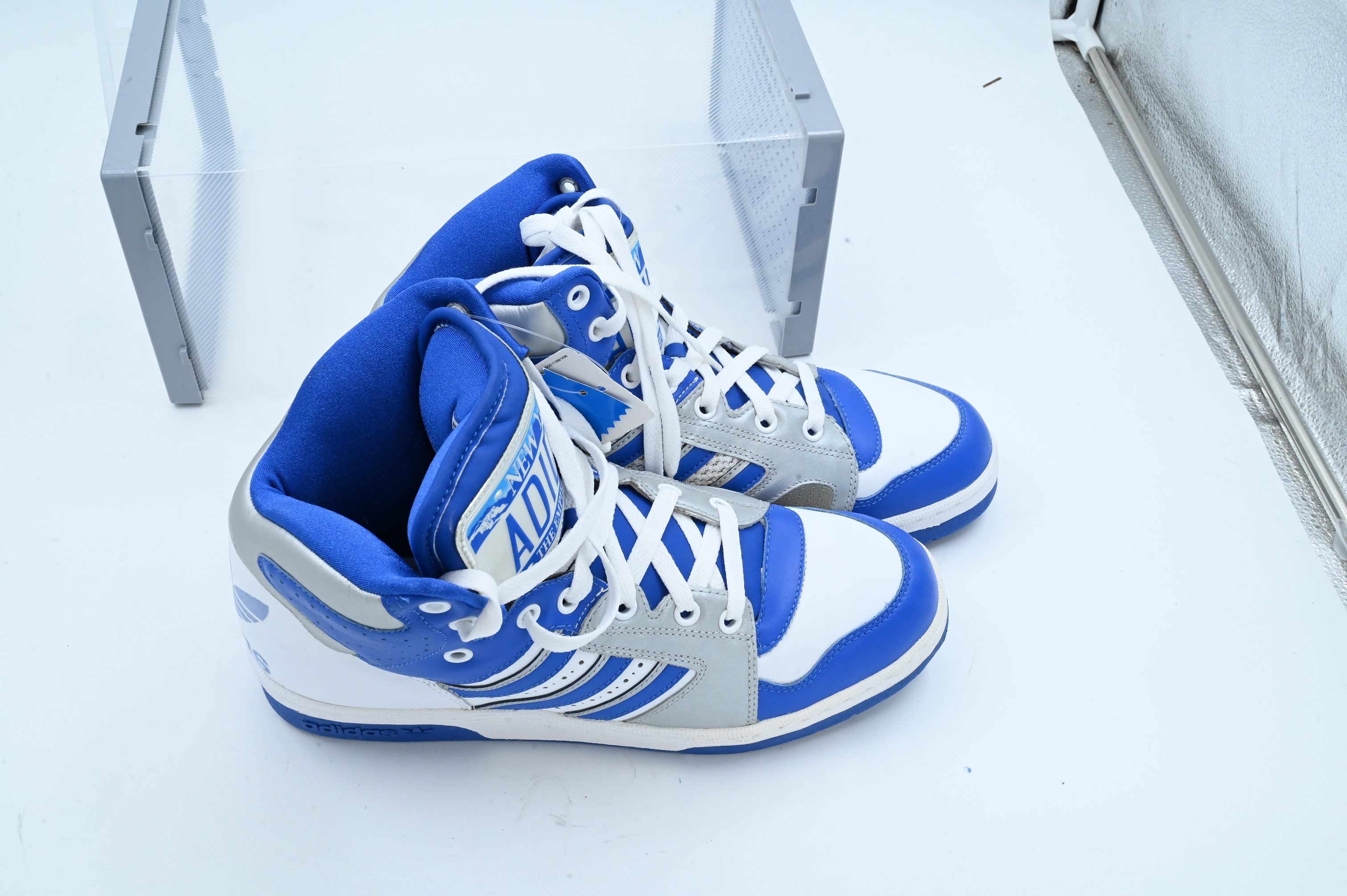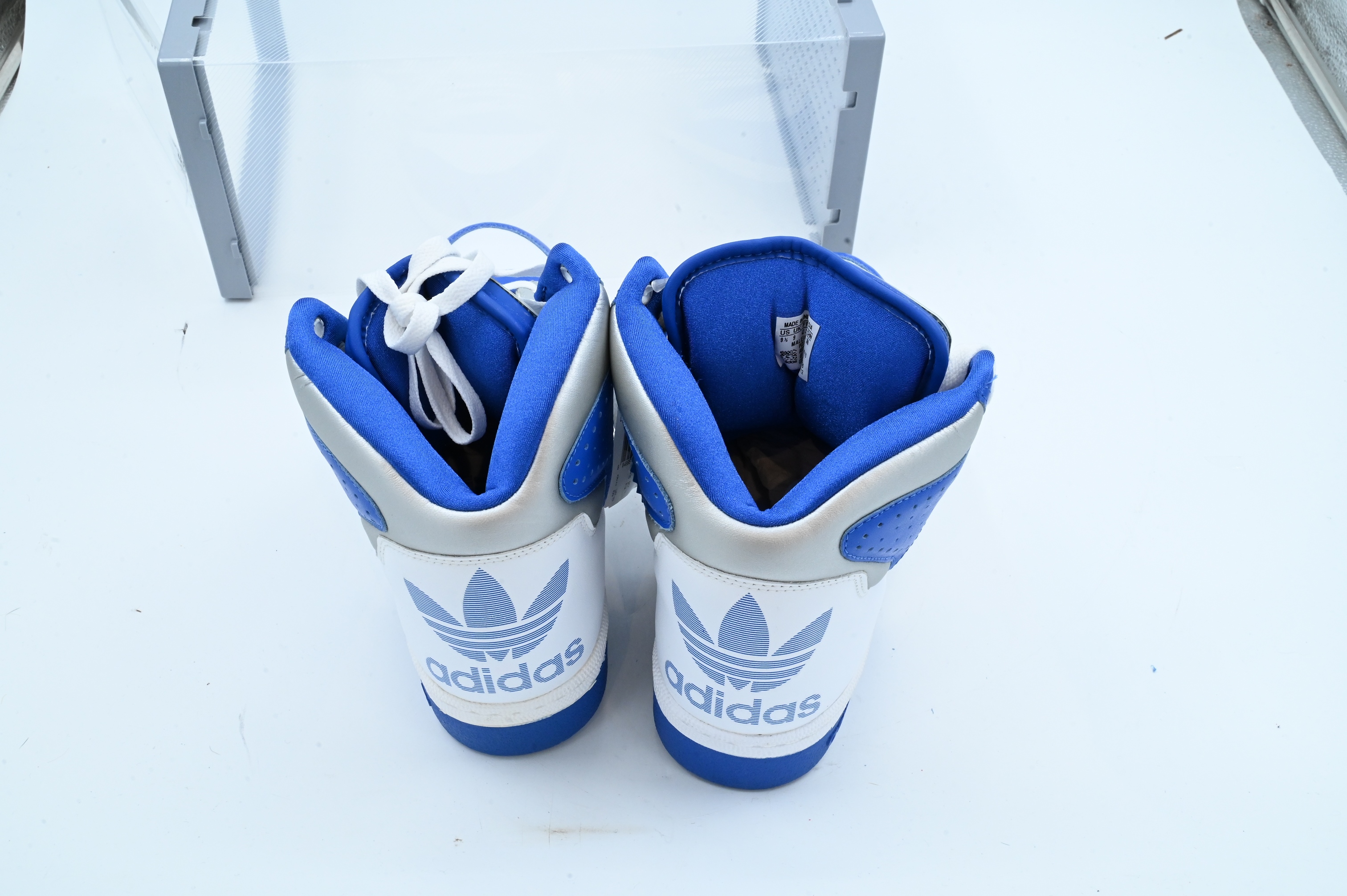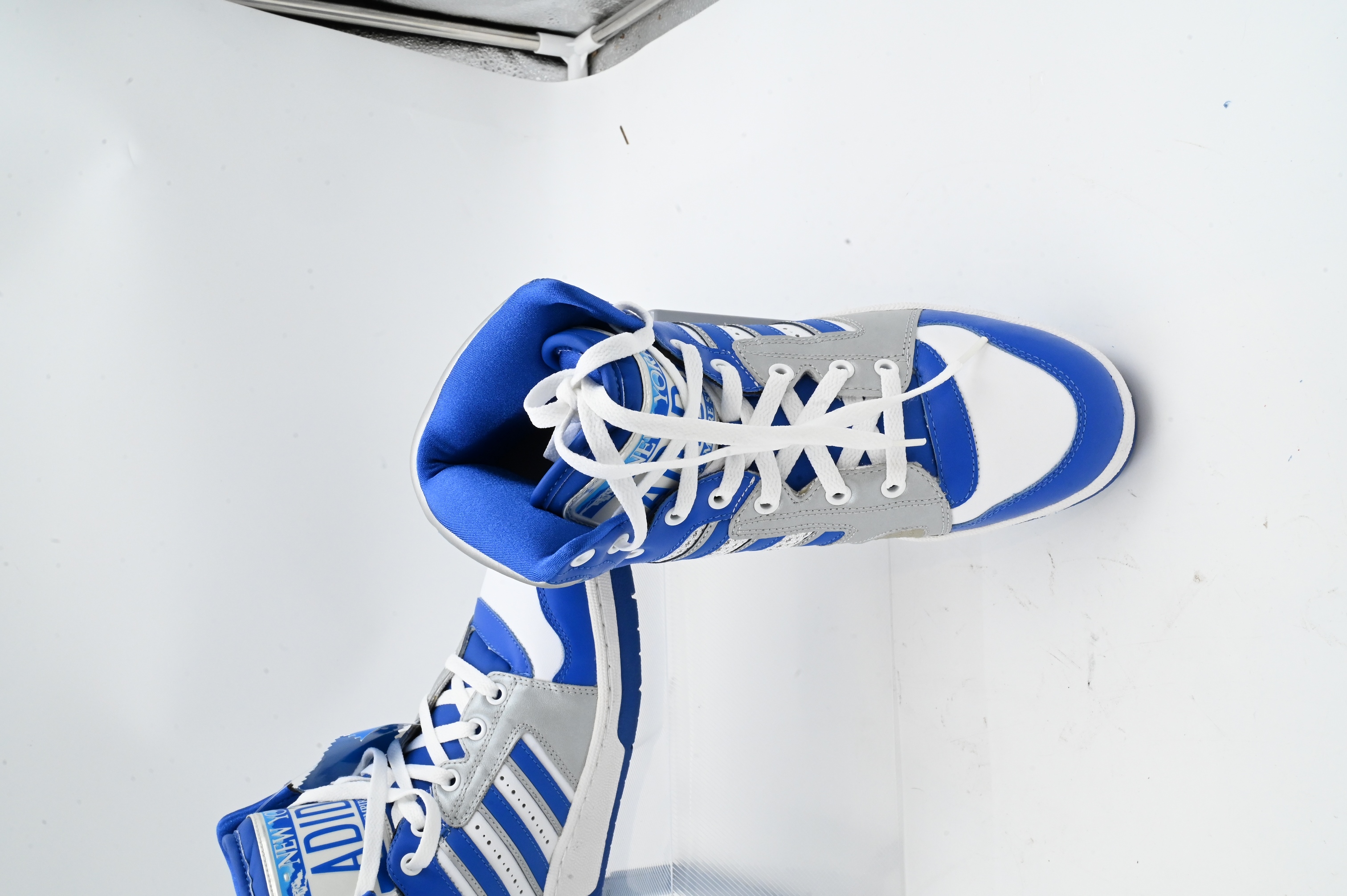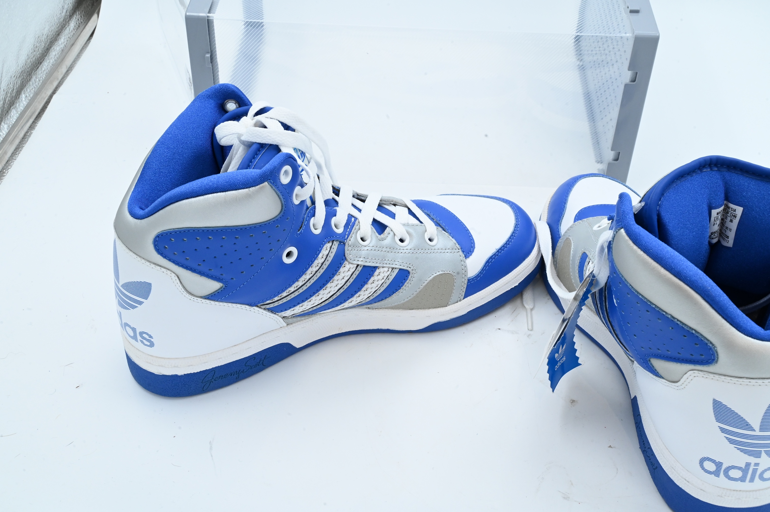 Lot 465: Adidas Men’s Sneakers JS License Plate in Blue, White, and Silver