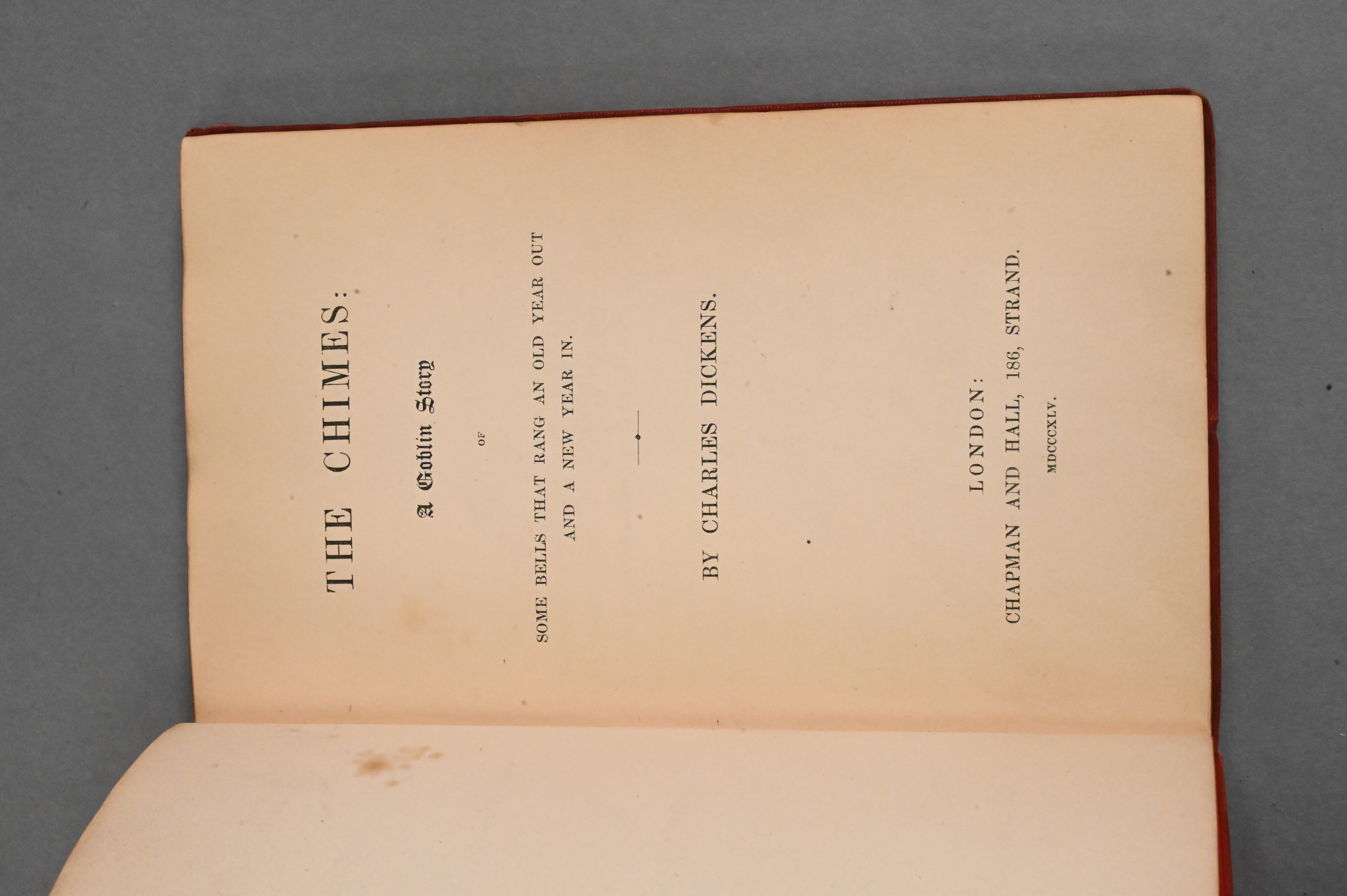 First Edition of Charles Dickens”The Chimes: A Goblin Story of Some Bells That Rang An Old Year Out and a New Year In”, published in 1845 by Chapman & Hall in London, Provenance: Estate of Cyril H. Moore Jr, Kent, Connecticut.