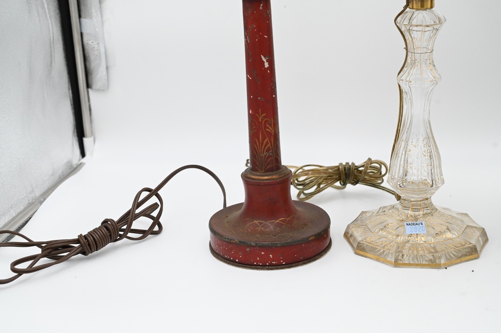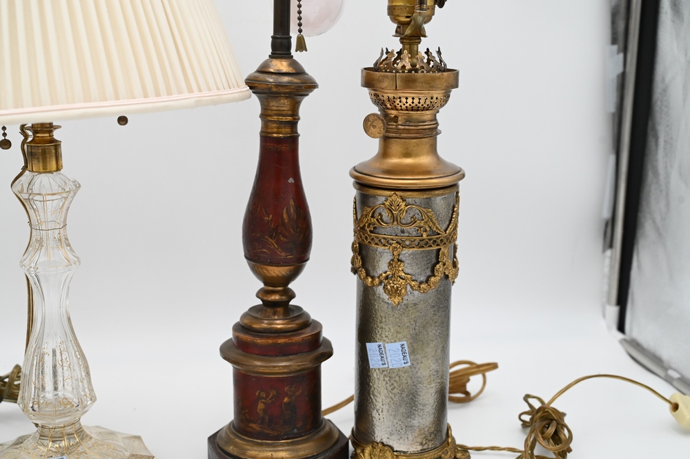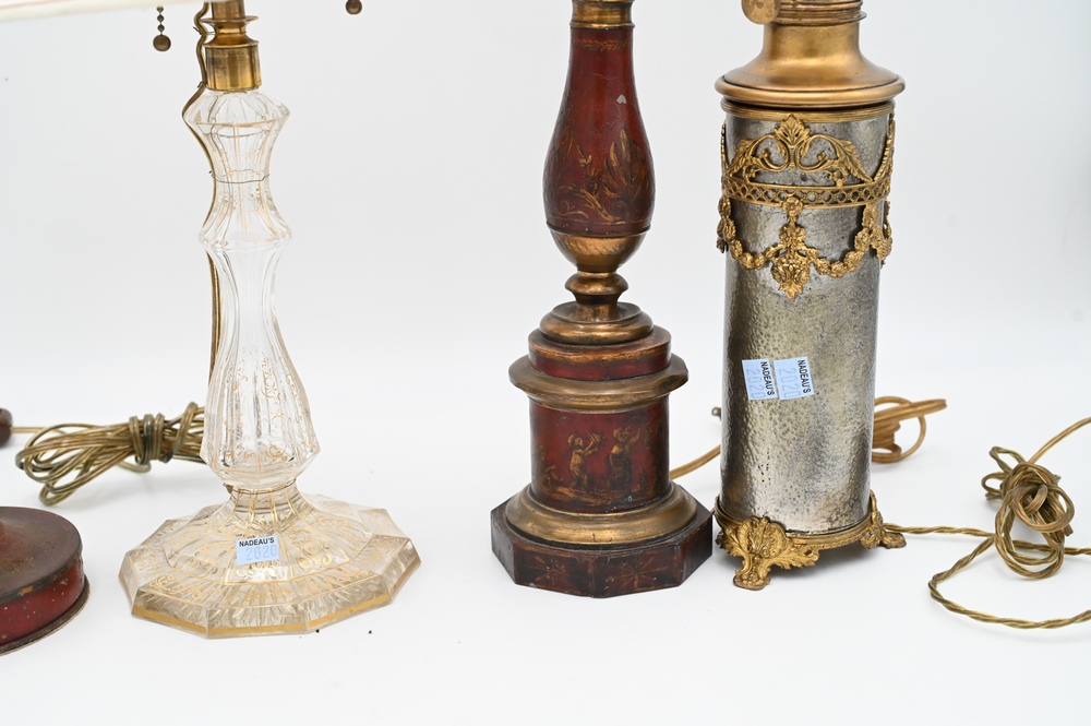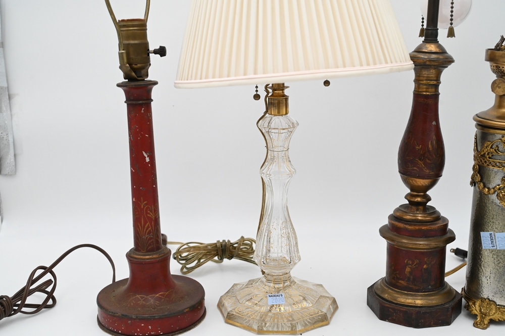 Group of Four Table Lamps, to include two painted told lamps; a French metal mounted lamp; along with a crystal candlestick lamp with gilt decoration; height 24 inches.