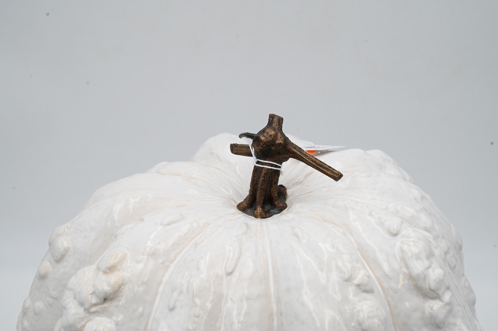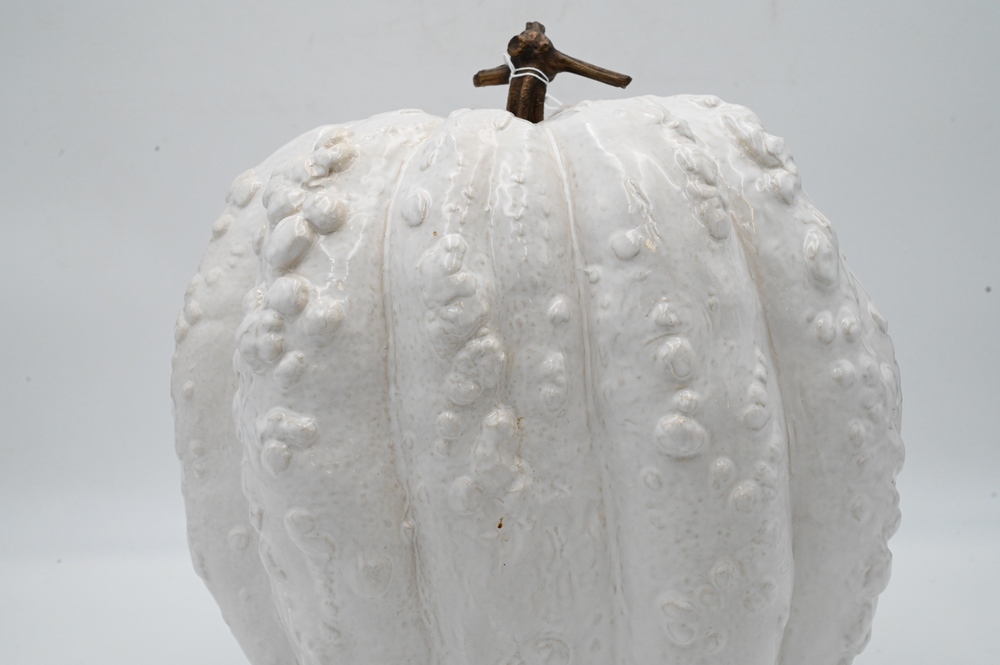 Jean-Paul Gourdon (b. 1956), white glazed ceramic pumpkin with bronze stem, signed J.P. Gourdon on bottom, height 15 inches.