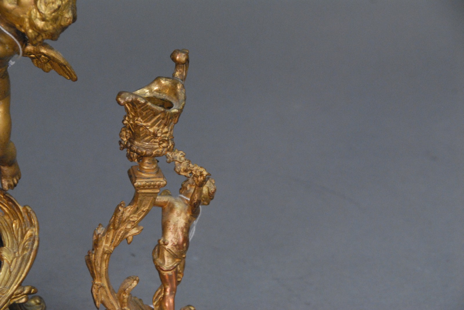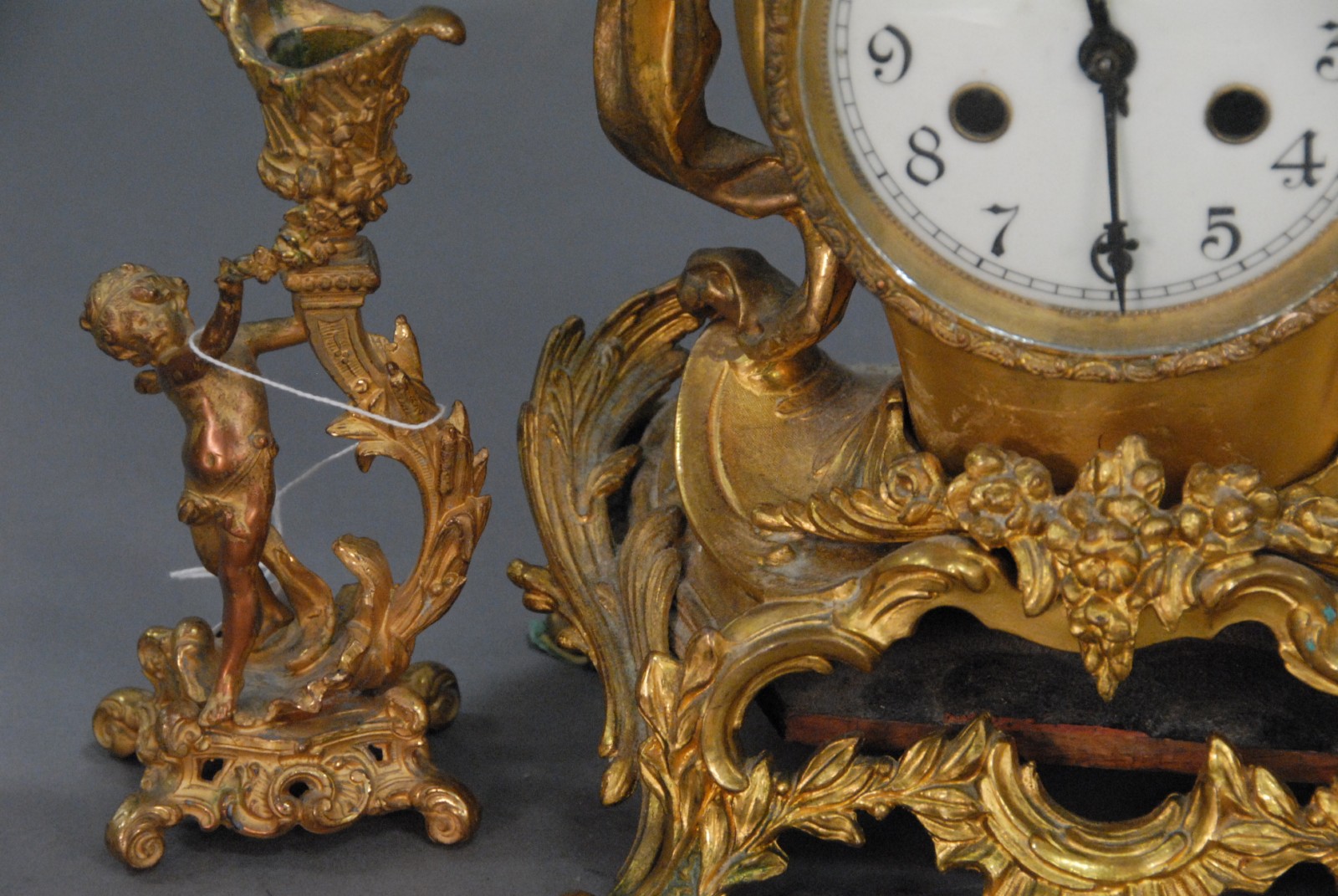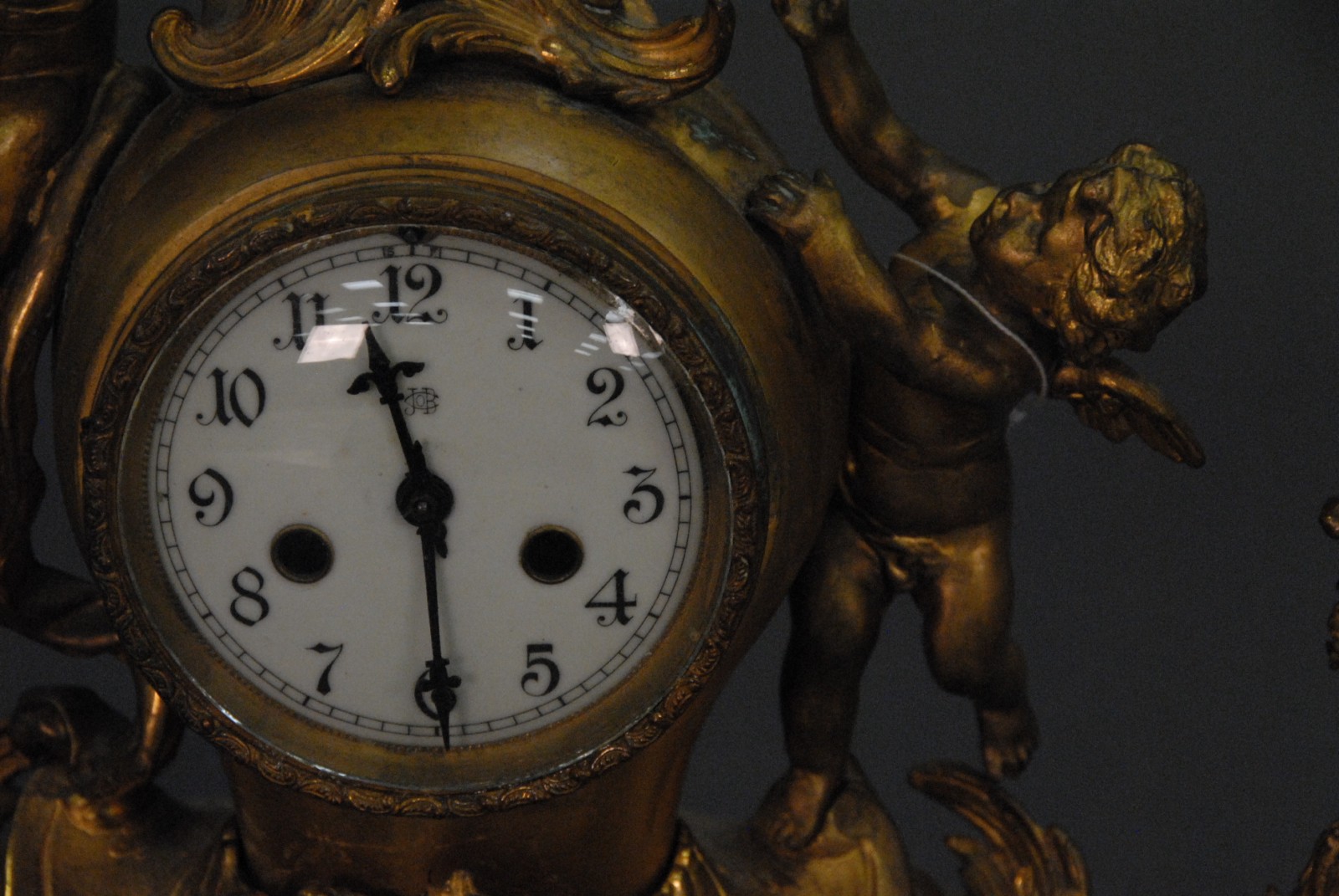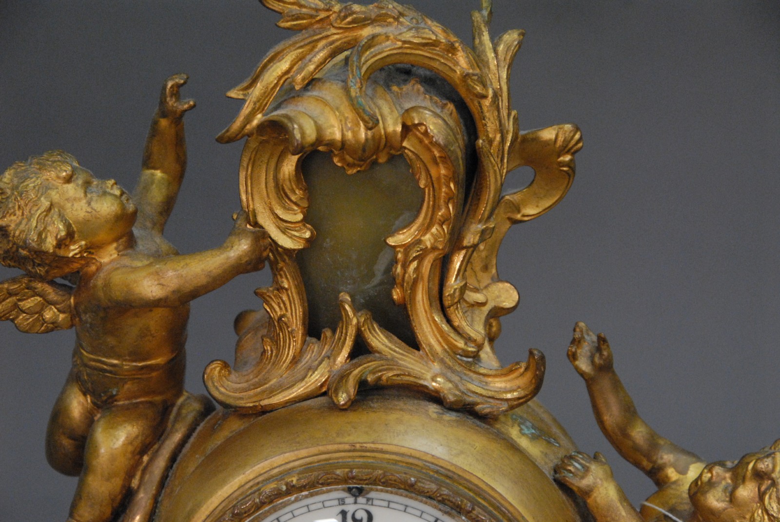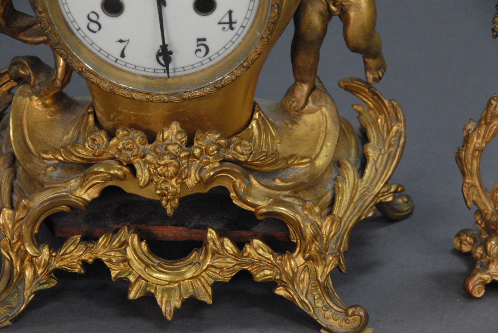 Louis XV three piece clock set mounted with puttis, candle holders closely matching.