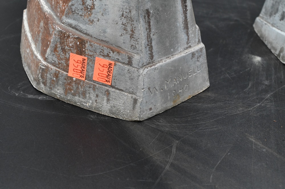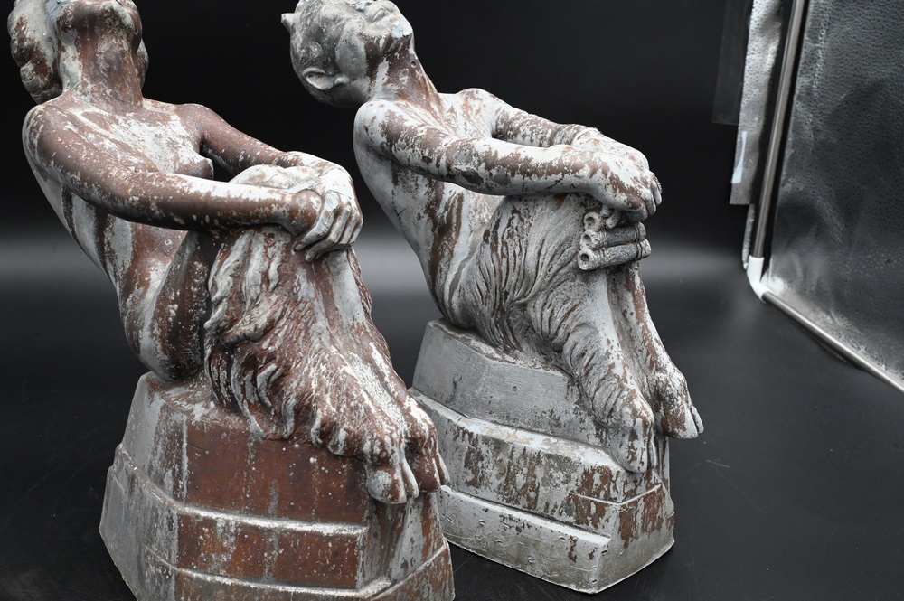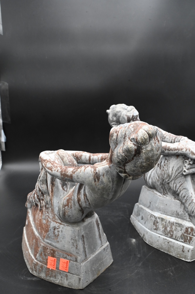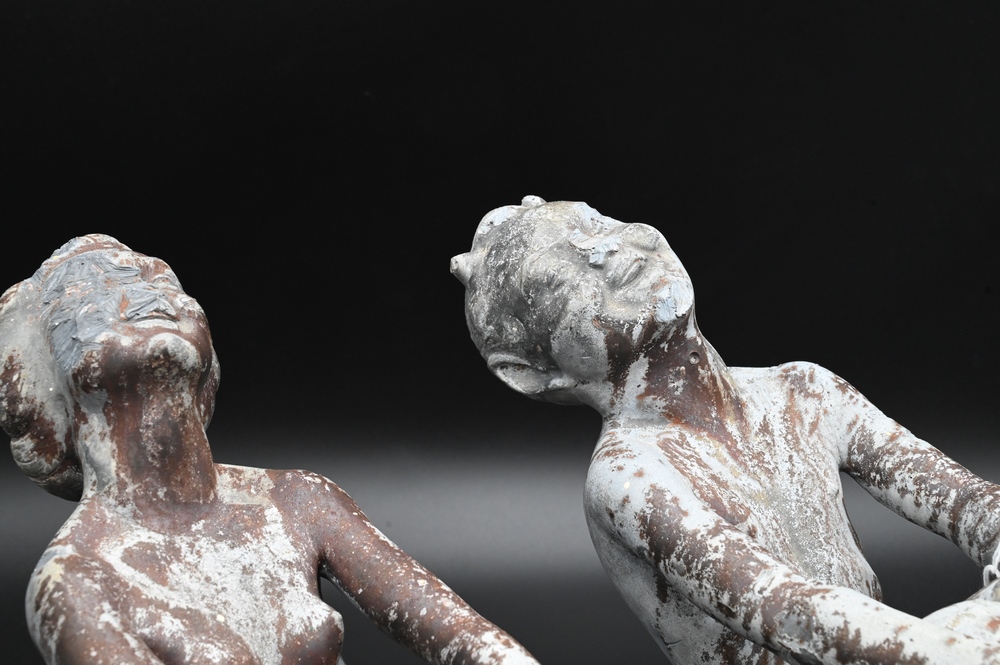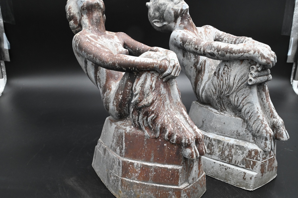 Lot 465: Pair of W. Manuelli Lead Garden Figures, art deco style of male and female satyr/satyress sitting and laughing on a tiered base, height 11 1/2 inches
