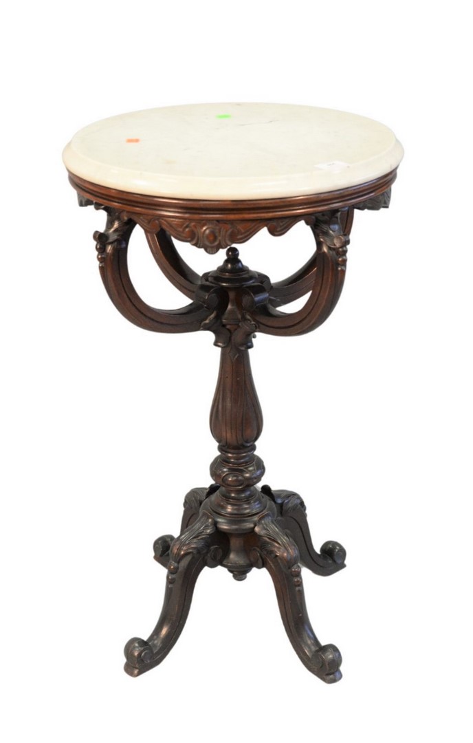 Lot 465: Round Victorian Stand with White Marble Top on carved supports, set on four carved legs height 30 inches, diameter 17 1/2 inches Pro…