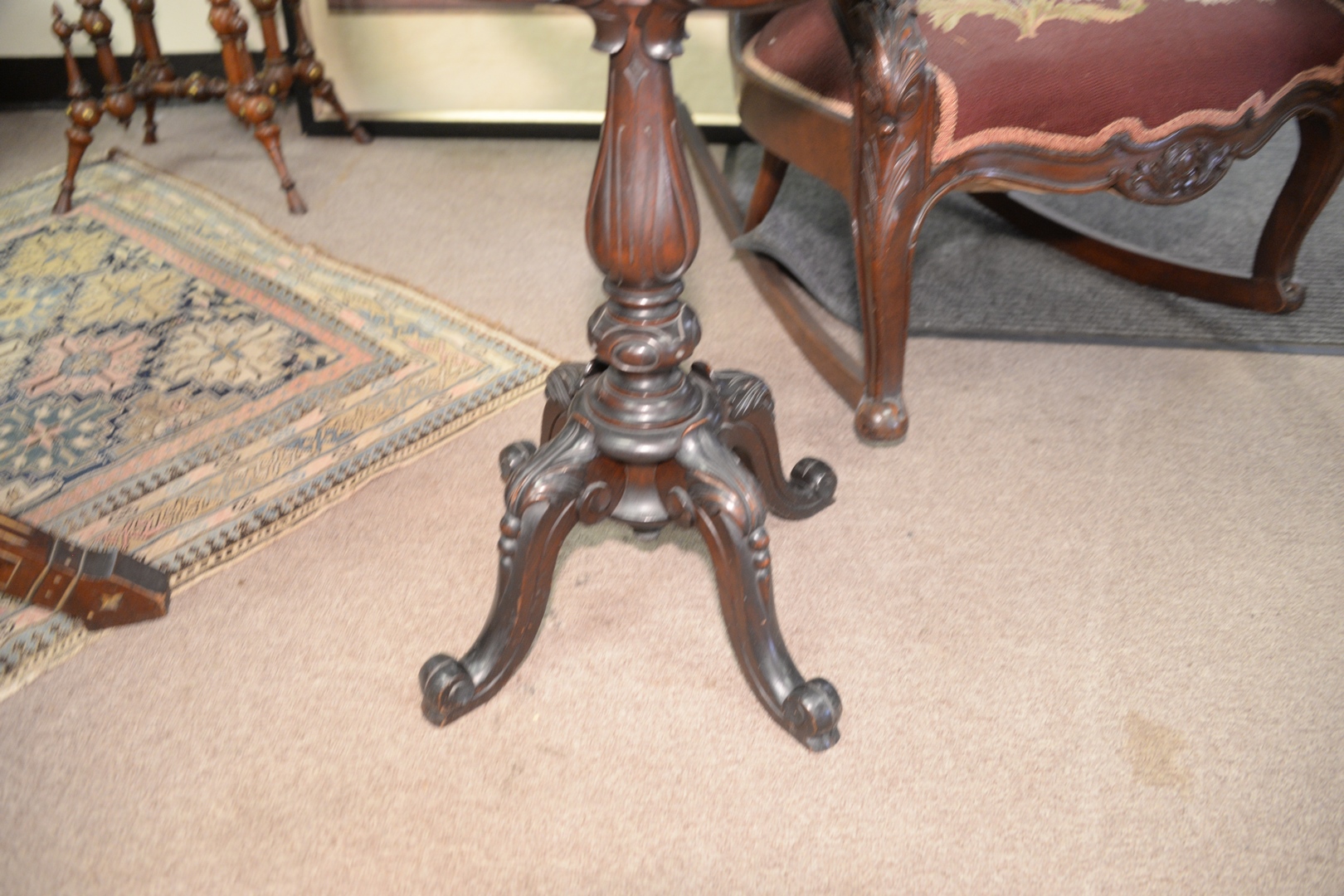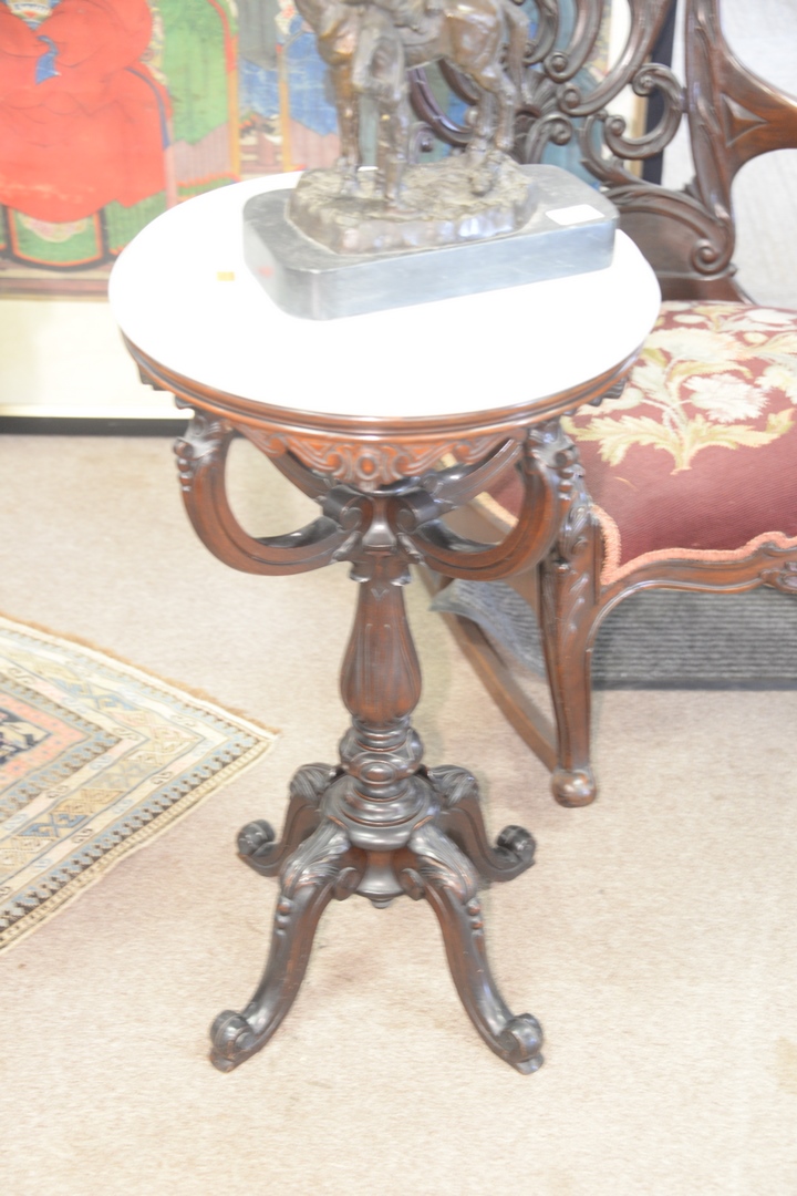 Lot 465: Round Victorian Stand with White Marble Top on carved supports, set on four carved legs height 30 inches, diameter 17 1/2 inches Pro…